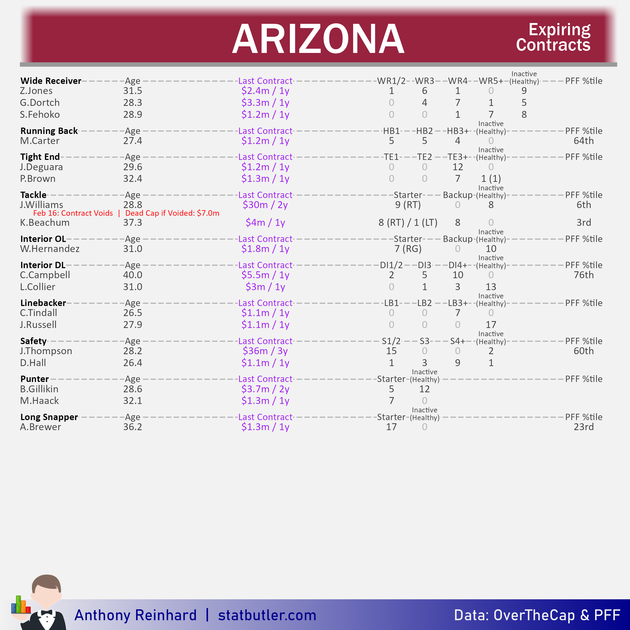 I would also keep and eye on running back James Conner. He’s due to earn $8m in 2026. I presume he’s penciled in as the starter, but at 31 and coming off an injury it’s a big commitment for a running back. Conner has a $1m roster bonus coming to him on March 15th. If Arizona can’t work something out, he’ll hit the market before then.