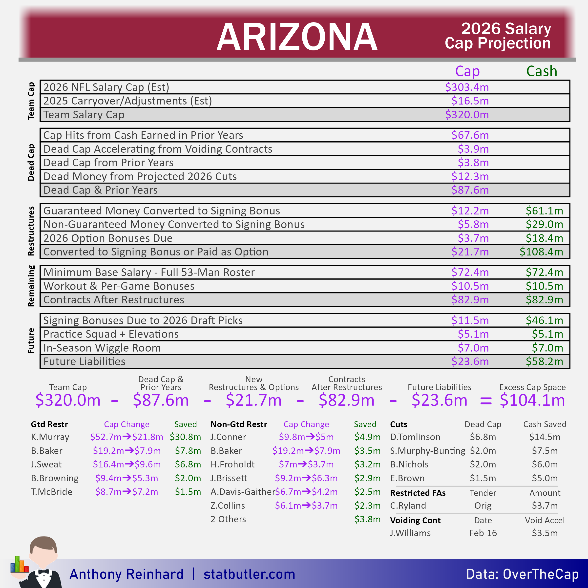 A cut would probably be a post-June 1st designation. If the contract went untouched, Arizona’s dead cap hit would consist of $47.5m in 2025 & $7.2m in 2026. However, the team could restructure some portion of Murray’s contract to even out those numbers, which would provide something closer to an even split of the total $54.7m dead cap hit.
