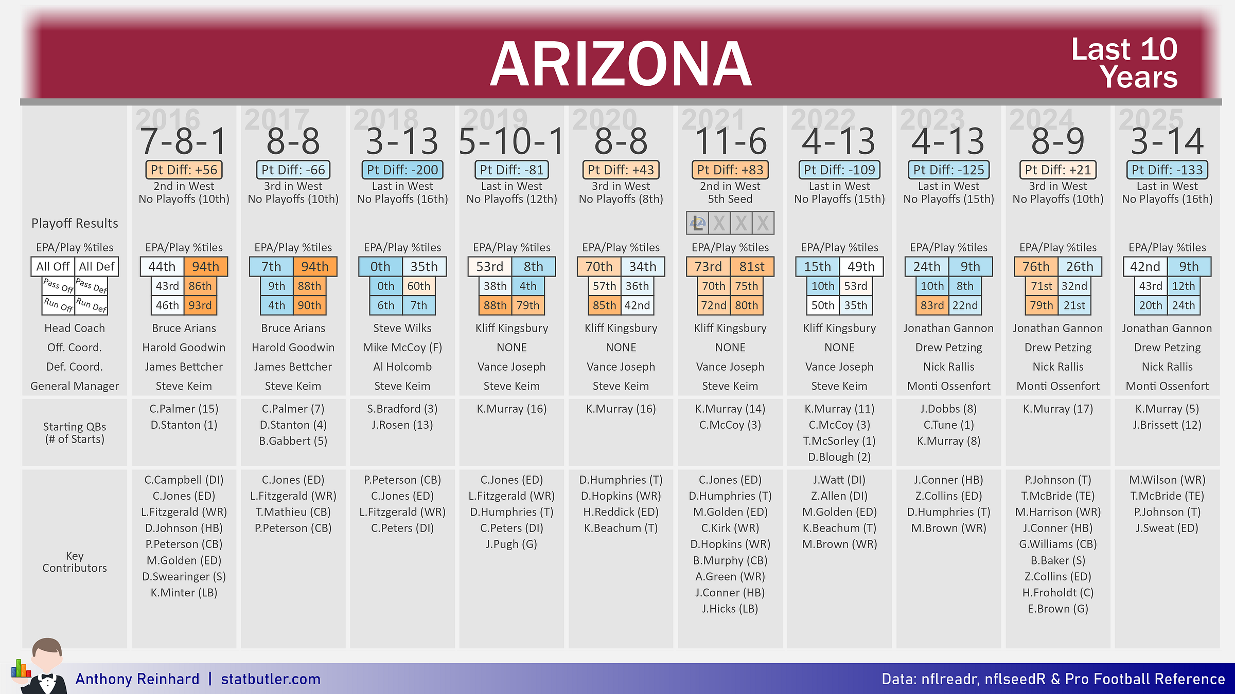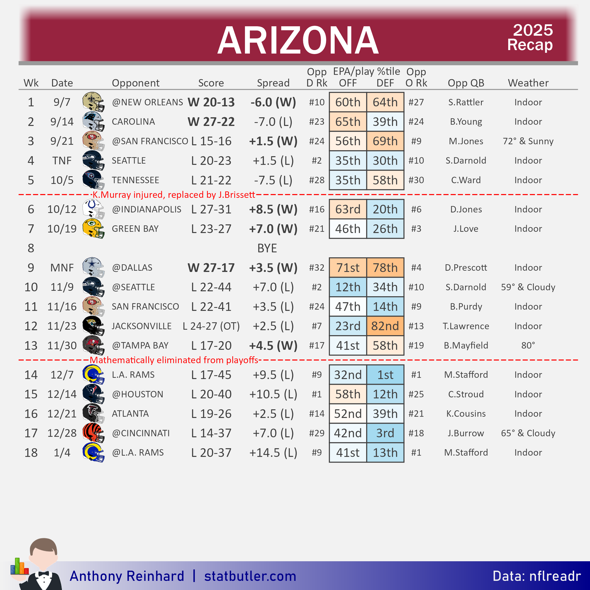 Entering their Week 8 bye, Arizona was 2-5 and coming off five straight losses by four points or less. They beat Dallas in their first game after on Monday Night Football, but the dam soon broke. Arizona closed out the 2025 season with nine straight losses, six of which were by 17+ points.
