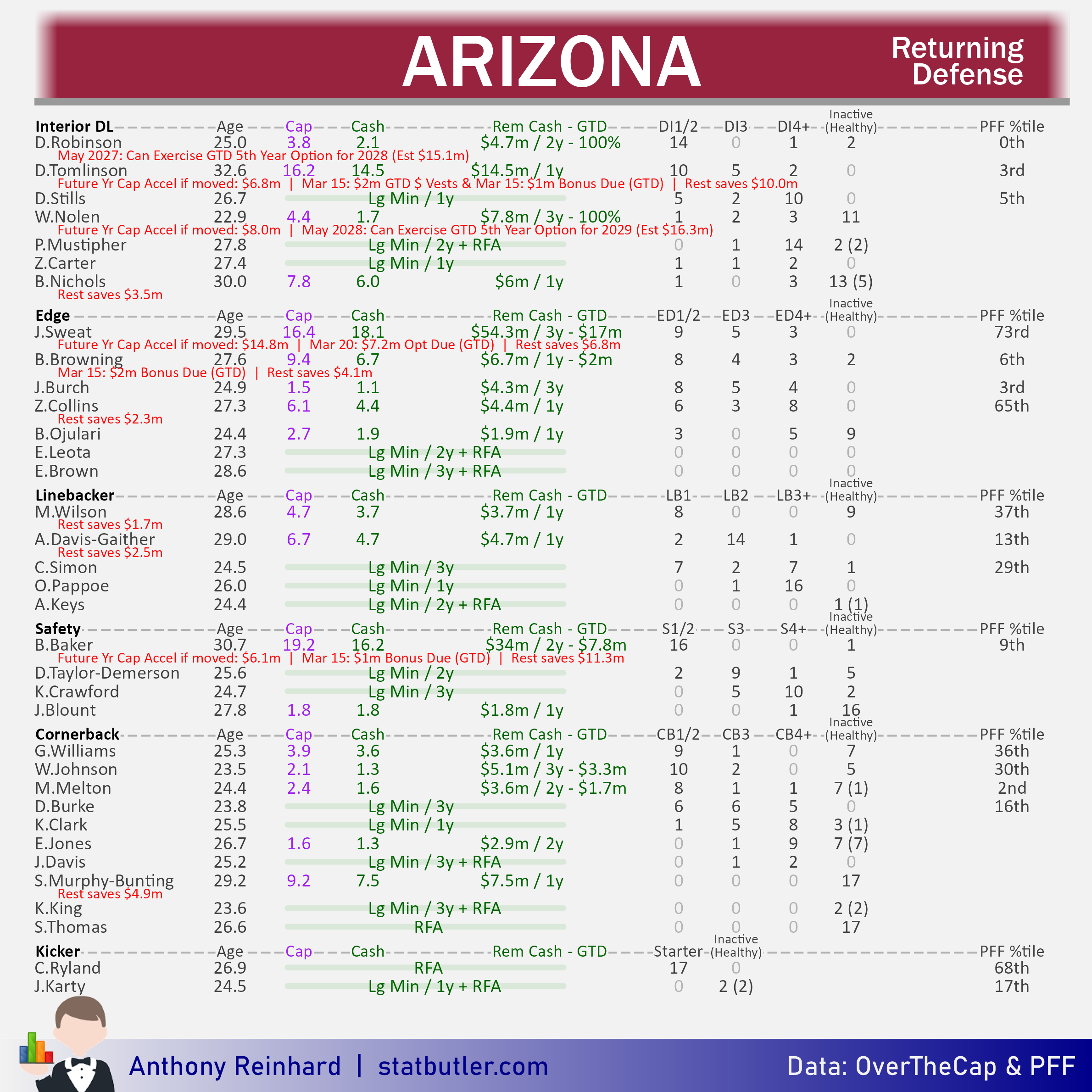 As far cuts, I have quite a few for Arizona. The biggest is Dalvin Tomlinson. This will be Tomlinson’s second straight year as a cap casualty after Cleveland let him go a year ago. Sean Murphy-Bunting was placed on the Non-Football Injury list last May. He’s due to earn $7.5m in 2026 which needs to be locked in starter money. With no changes at GM or defensive coordinator, this is a spot where a pay cut could be in play depending on the Murphy-Bunting’s health. Bilal Nichols started the year on the Physically Unable to Perform list last year and finished it on IR. His last two years have been ugly and he’s out of guarantees in the final year of his deal. Left guard Evan Brown closes things out. He’s due to earn $5m in 2026, but was a healthy scratch in each of the last five games of 2025.