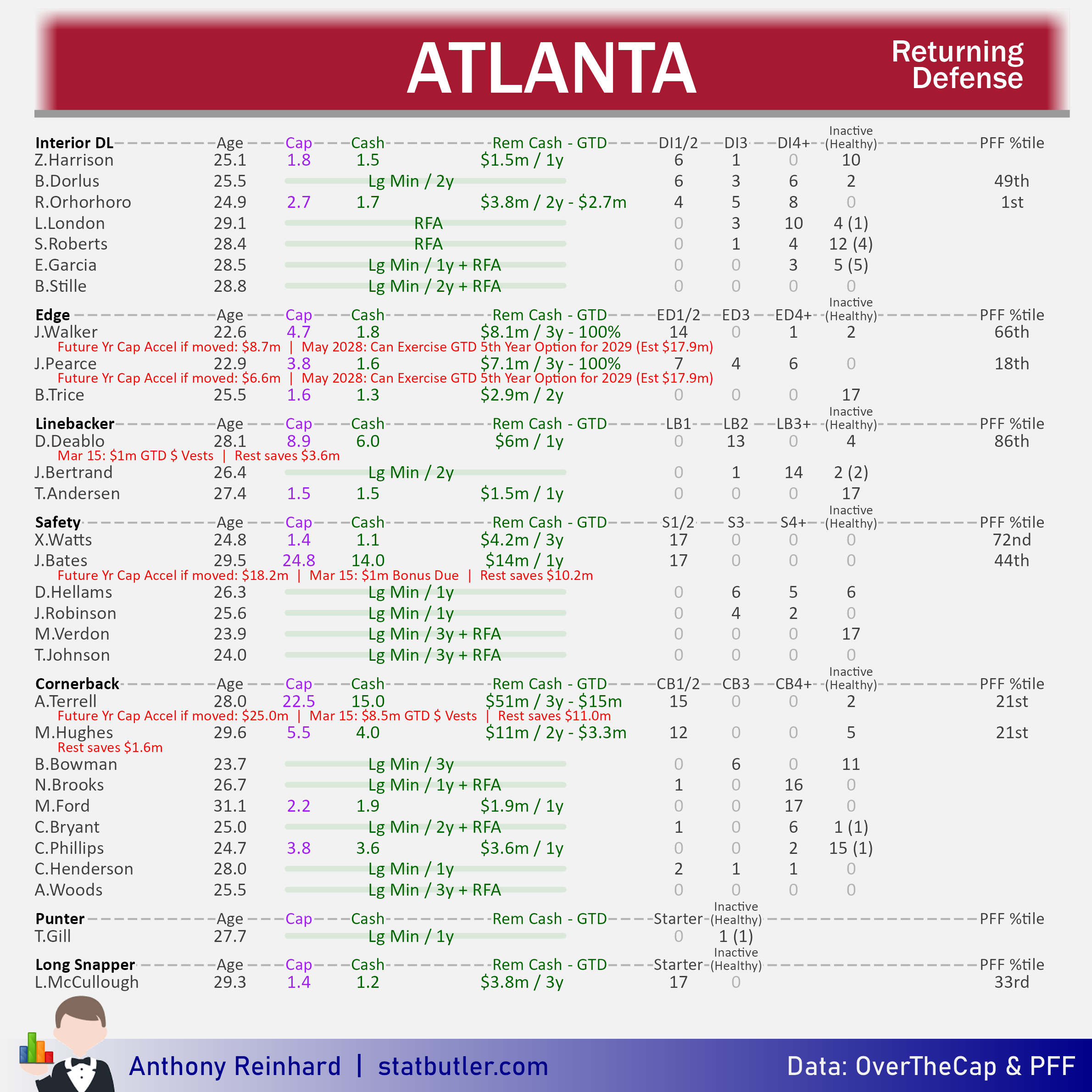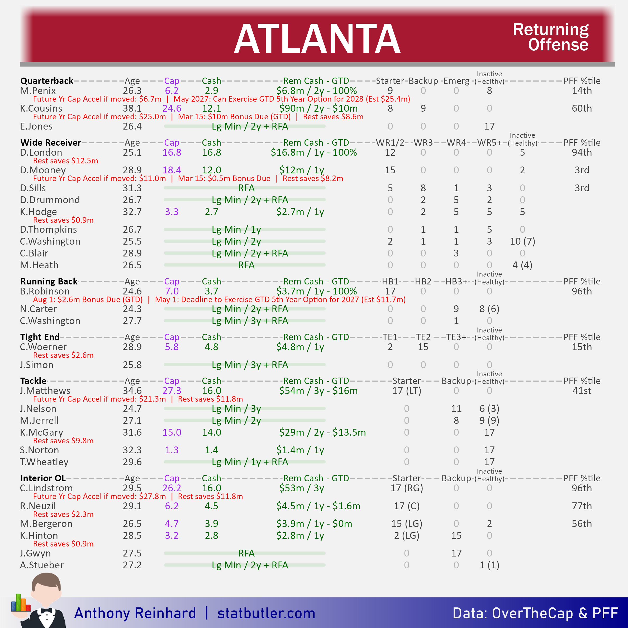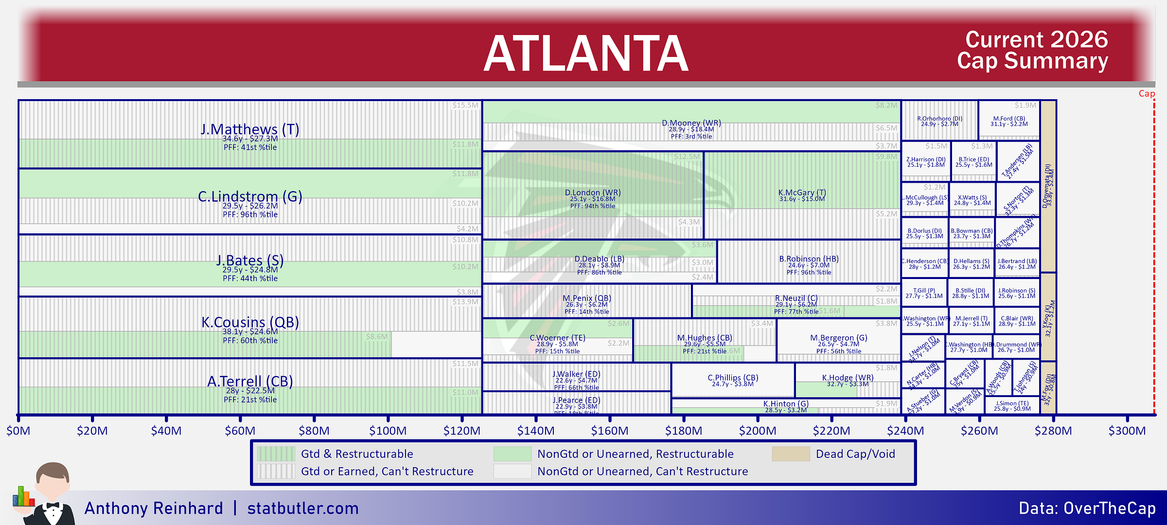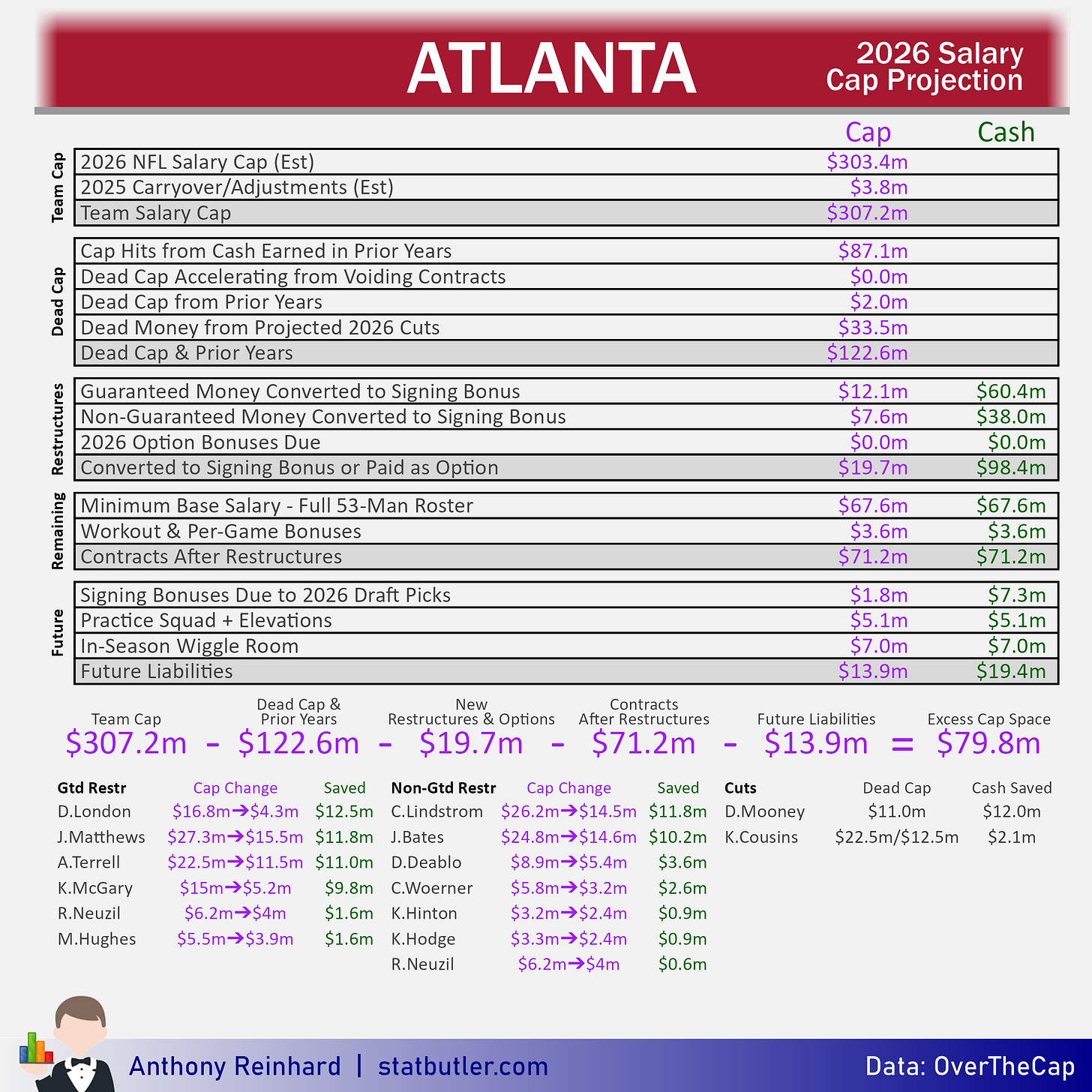 Below, I’m projecting the Cousins cut and I’m also anticipating Darnell Mooney will be cut after a poor 2025. KhaDarel Hodge, Charlie Woerner, and possibly even Jessie Bates are players to keep an eye on who could be cut or forced into negotiating a pay cut. The Falcons will also pick up Bijan Robinson’s 5th year option for 2027, which should be around $11.7m fully guarnteed.
