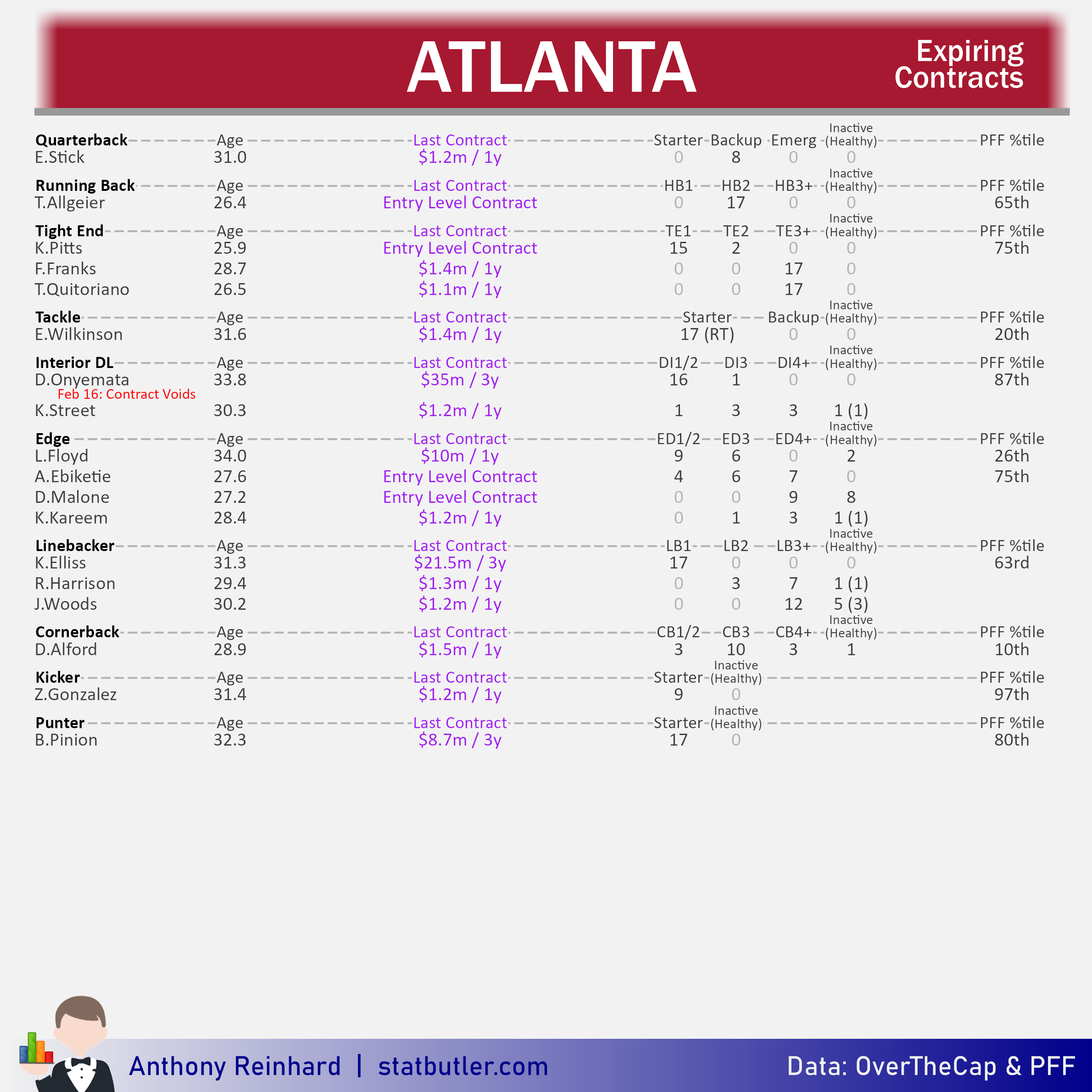 There are a couple names here to zero in on, starting with Kyle Pitts. Pitts had a solid 5th year, but on the whole has been a letdown compared to the sky high expectations that led to his being drafted immediately ahead of some of the game’s biggest stars in 2021. I don’t necessarily expect it, but he could receive the franchise (est $16.3m) or transition ($13.9m) tag in advance of free agency. David Onyemata, Kaden Elliss, and Tyler Allgeier all have made cases that they should land solid deals in free agency.
