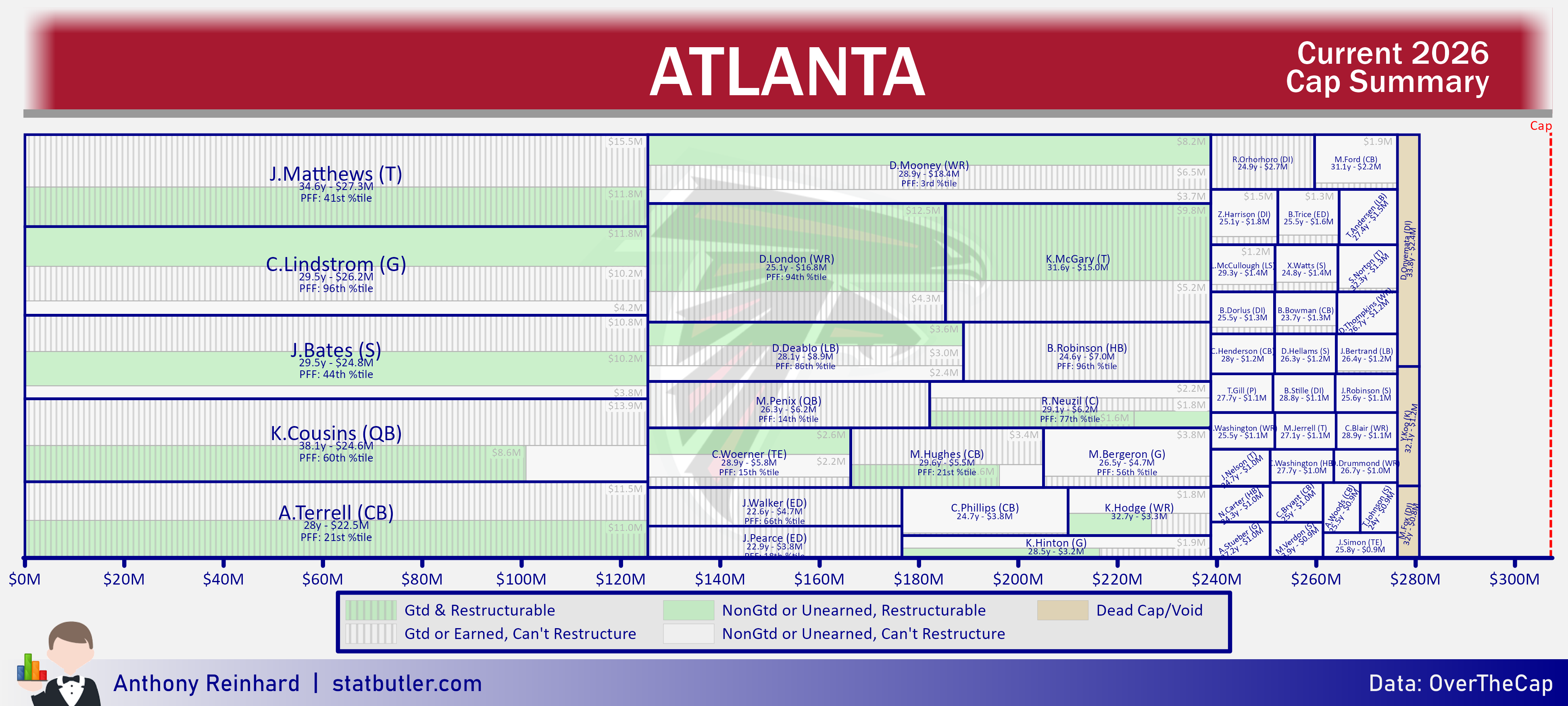 The Falcons won’t need to do much to achieve cap compliance, but I would anticipate a restructure of one or more of AJ Terrell, Drake London, Kaleb McGary, and Jake Matthews given that all of those players have plenty of fully guaranteed cash that can be pushed.