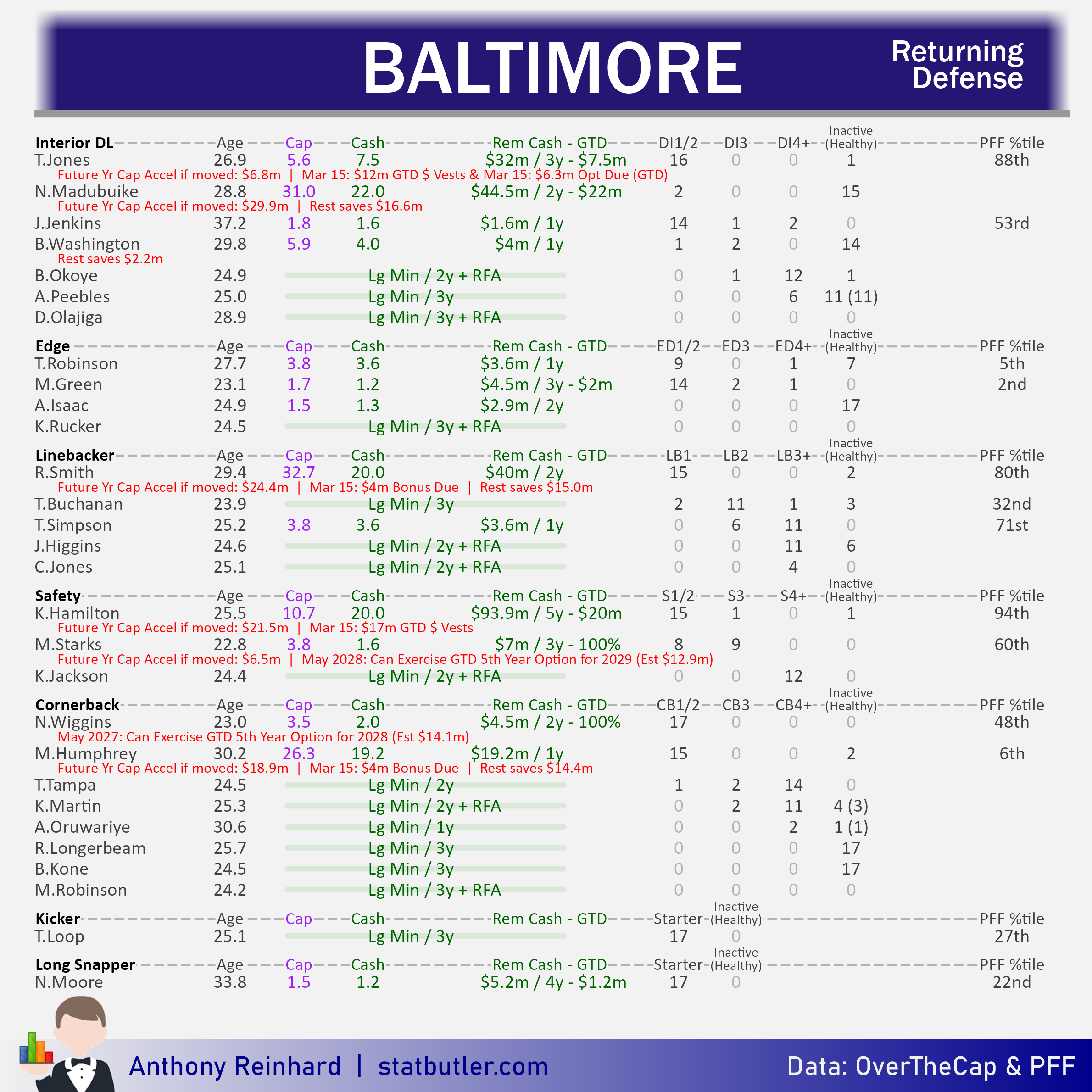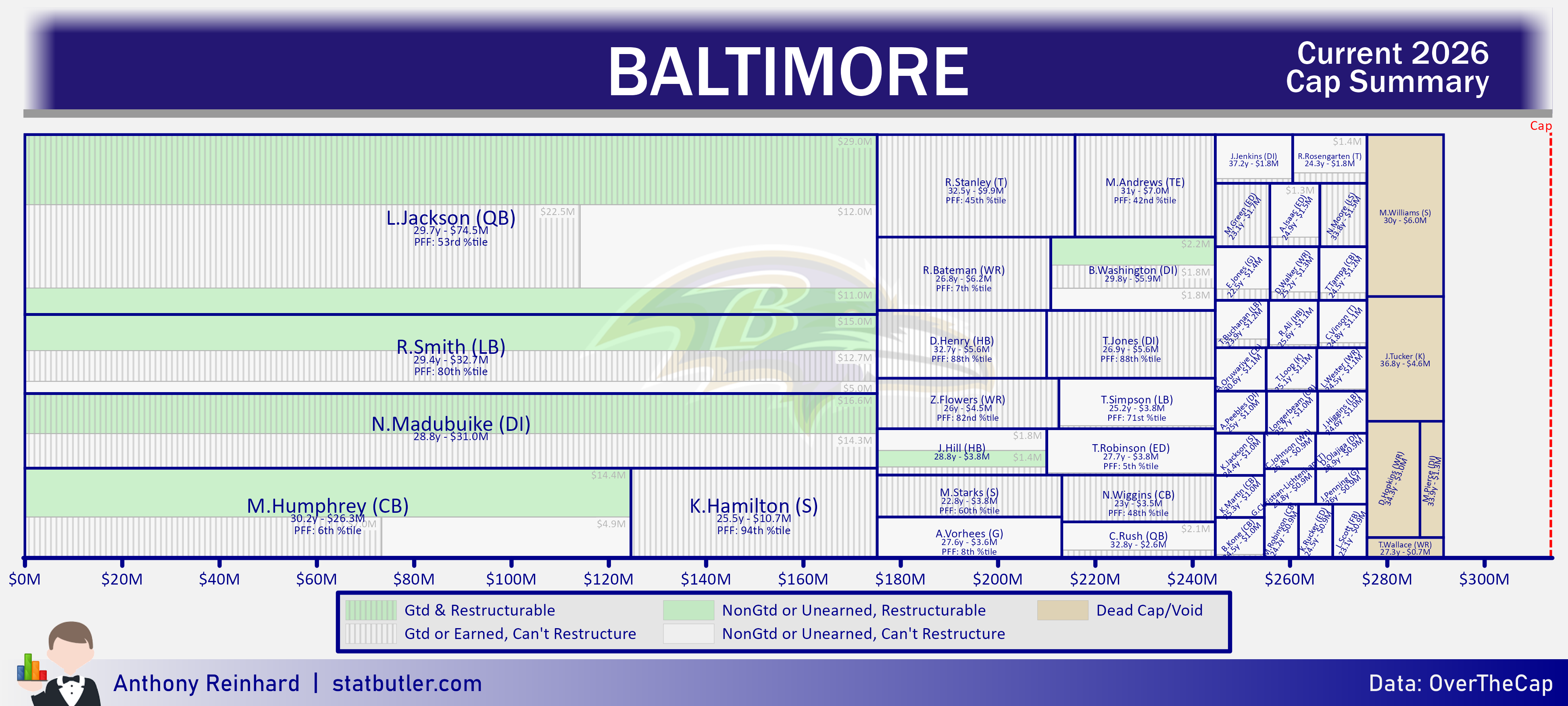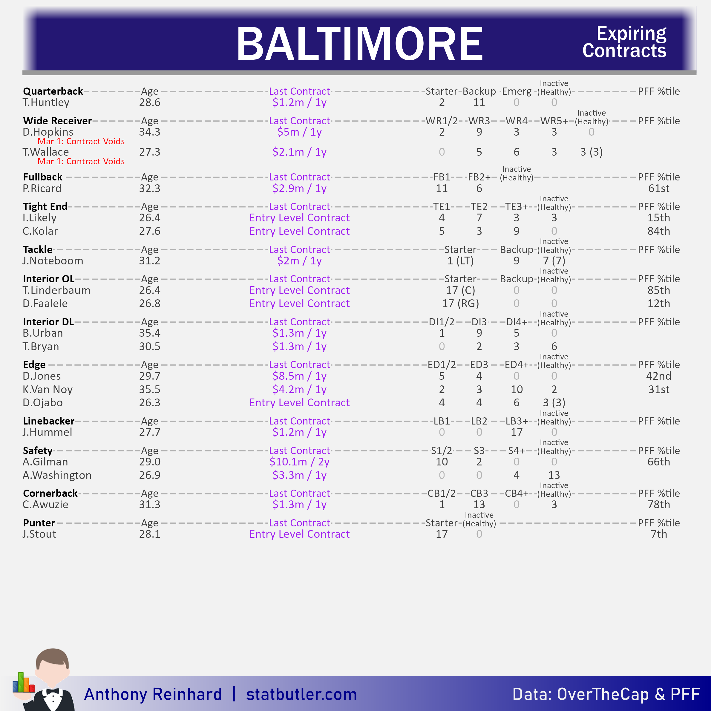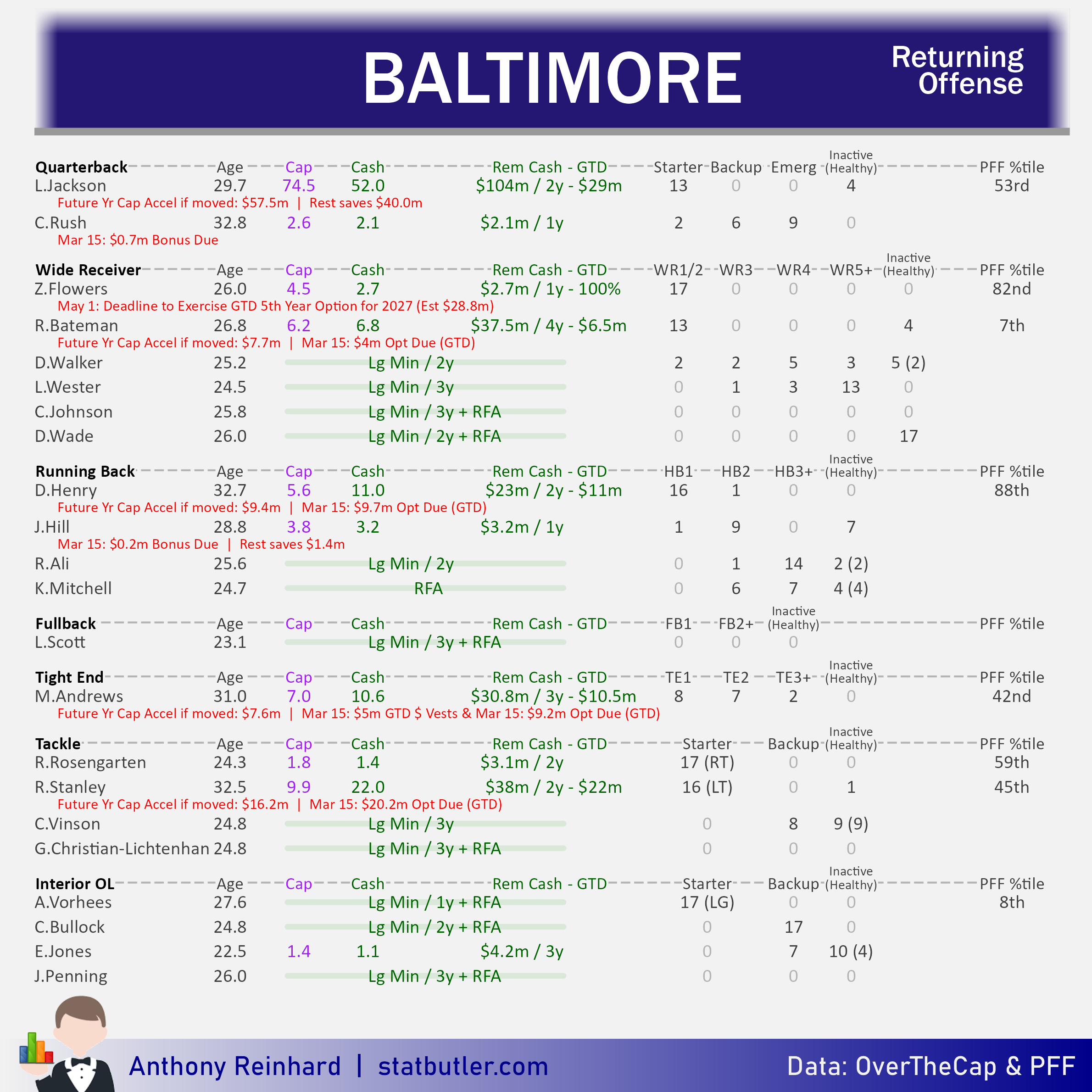 statbutler.com will be compiling offseason previews for all 32 teams in the lead up to free agency. Feel free to share any of the text/visuals below with attribution. All underlying contract data was collected by overthecap.com.