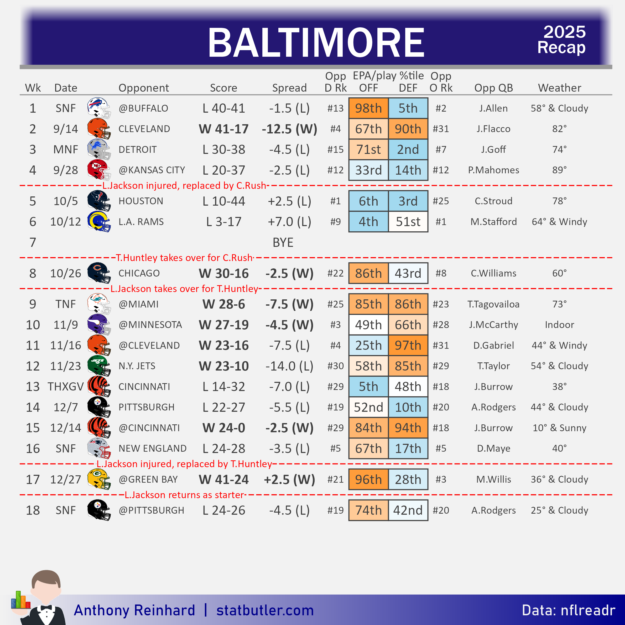 2025 was a down year for the Baltimore defense, especially in the early going. They lost Nnamdi Madubuike for the season in Week 2 and there still isn’t a ton of clarity around the defensive star’s status. Madubuike’s absence coincides with a breakout season from Travis Jones. Jones efforts were not enough to life the Ravens pass rush, which ranked 29th in QB pressure rate this past season. Other pieces on defense are solid. Roquan Smith remains one of the best linebackers in football. Kyle Hamilton leads a talented young secondary that may soon get even younger.