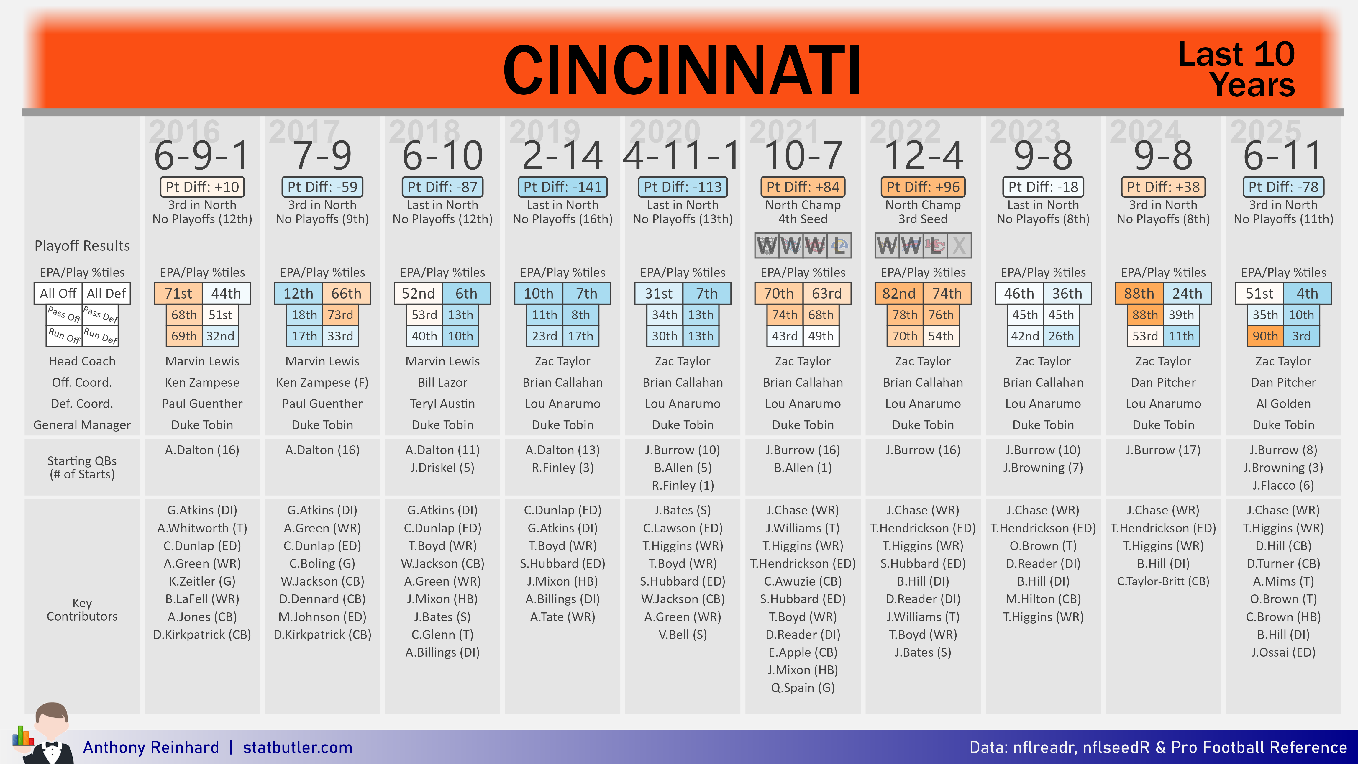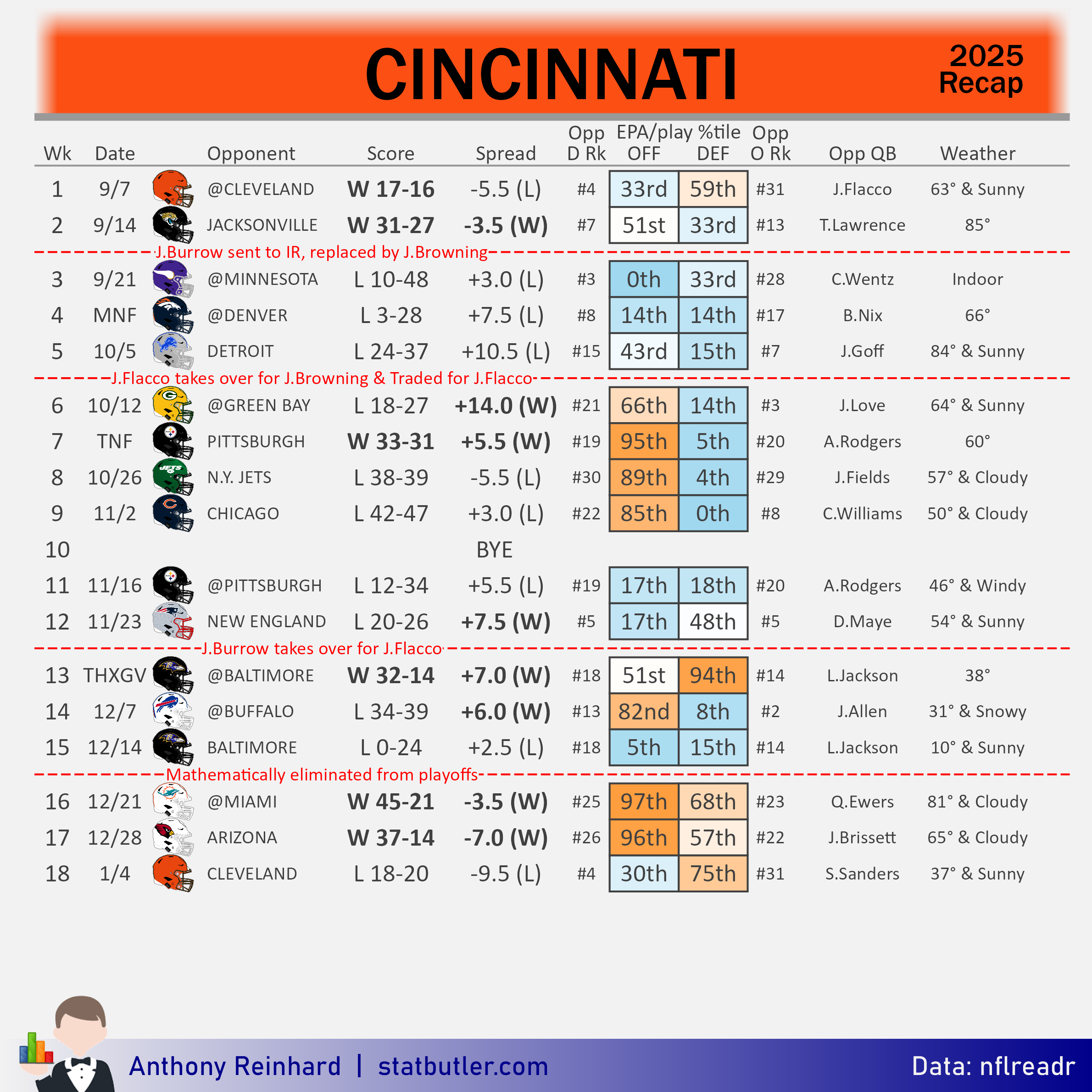 For Cincinnati, 2025 was defined by some of the same issues we’ve seen derail this franchise in the last several years: a serious injury to star QB Joe Burrow, poor pass protection, and inadequate defense. Burrow kicked the season off with a pair of wins, but then landed on IR. Jake Browning was unable to successfully take the reigns and the Bengals traded the Browns to bring in Joe Flacco until Burrow could return.