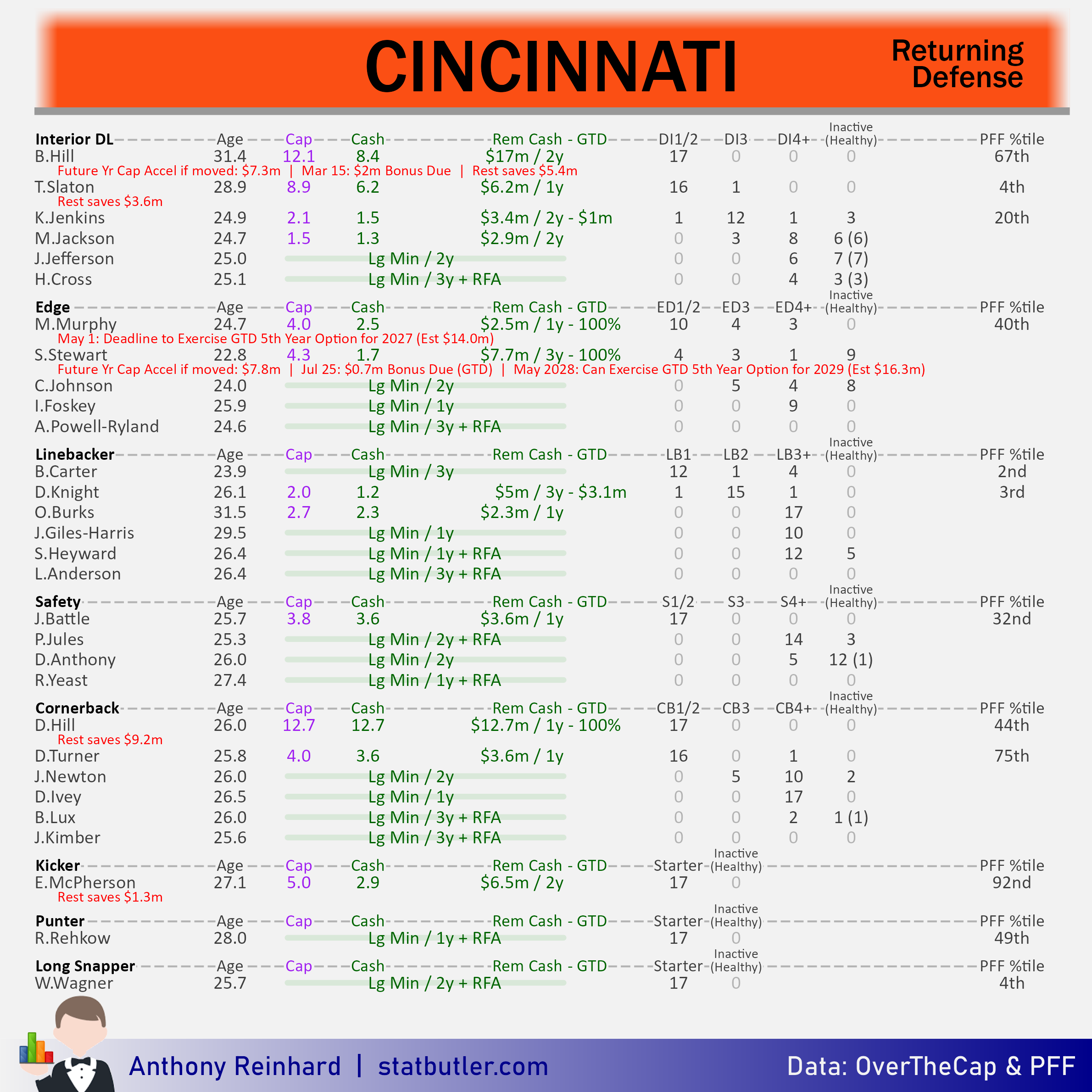 The only pre-free agency moves I have Cincinnati making are releasing Orlando Brown and T.J. Slaton as cap casualties. Franchise tagging Trey Hendrickson (which I believe would cost $34.8m) was probably a more serious consideration before he missed time this past season. It’s likely a little rich for a tag & trade as well, so I expect him to either work something out with the team on a traditional extension or hit unrestricted free agency. Elsewhere, Myles Murphy has a 5th year option that can be picked up for an estimated $14m for 2027. I expect the club to exercise that.