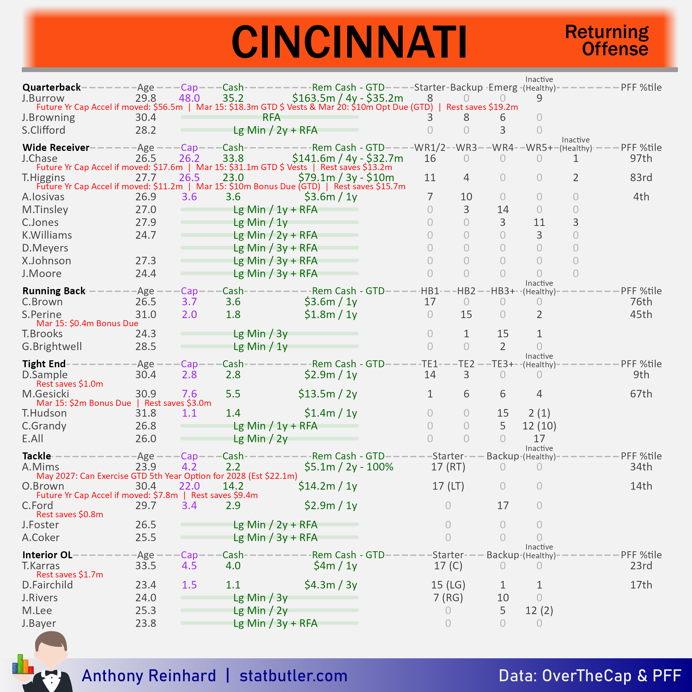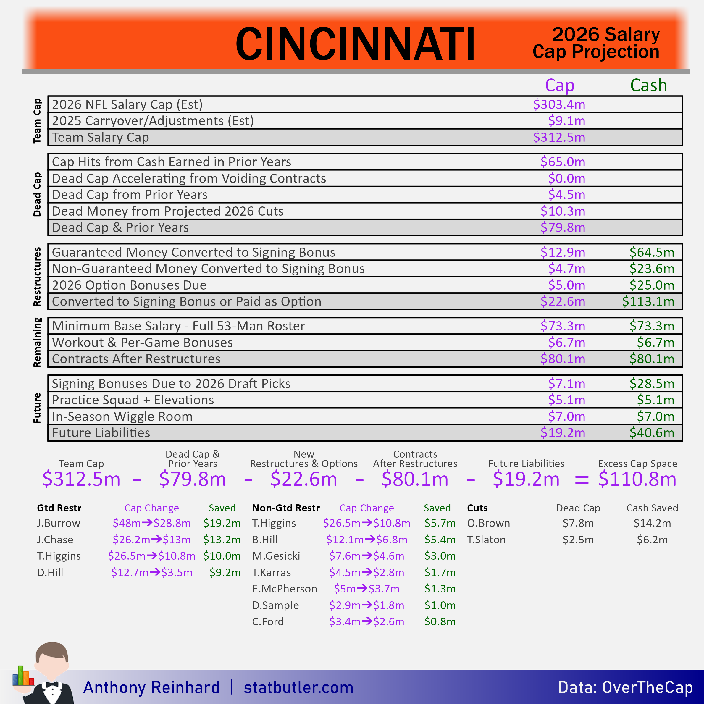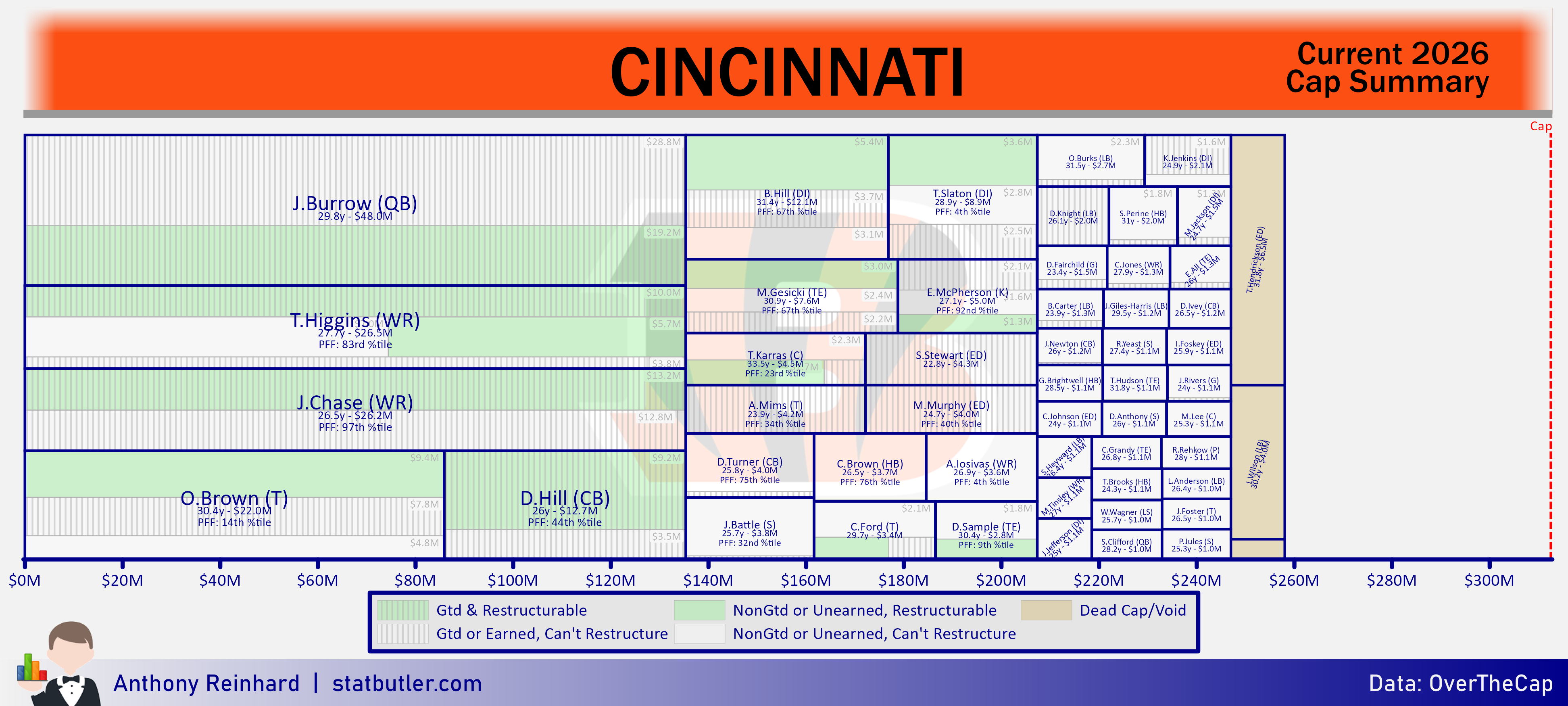 On top of the cap space they have currently, the Bengals can nearly double it by only restructuring the guaranteed portion of cash due to their core players in 2026 (Burrow, Chase, Higgins, Hill). In terms of current cash outlay, I have Cincinnati sitting at $233m (22nd). They’ll have plenty of room to build up their roster if they so choose.