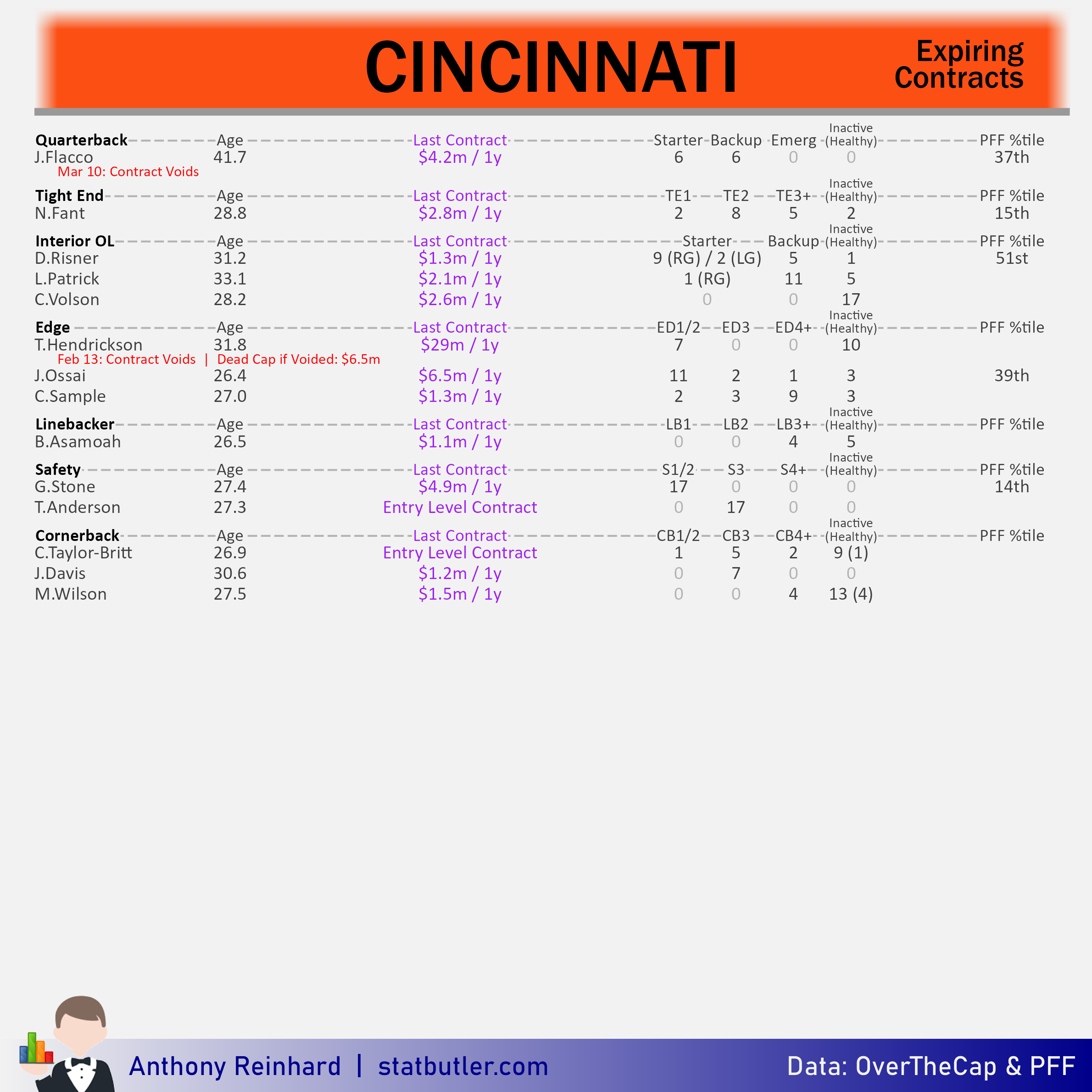 In terms of pending free agents, the big name is Trey Hendrickson, who will be coming off an injury shortened 2025 following a failed negotiation for a long-term deal. One of his peers in that position group, Joseph Ossai, should be able to catch on with a plus rotational deal at the least. Cincinnati should be searching for another edge to add to the rotation with Myles Murphy & Shemar Stewart going forward. Dalton Risner is a veteran that makes sense to bring back to fill out the offensive line.