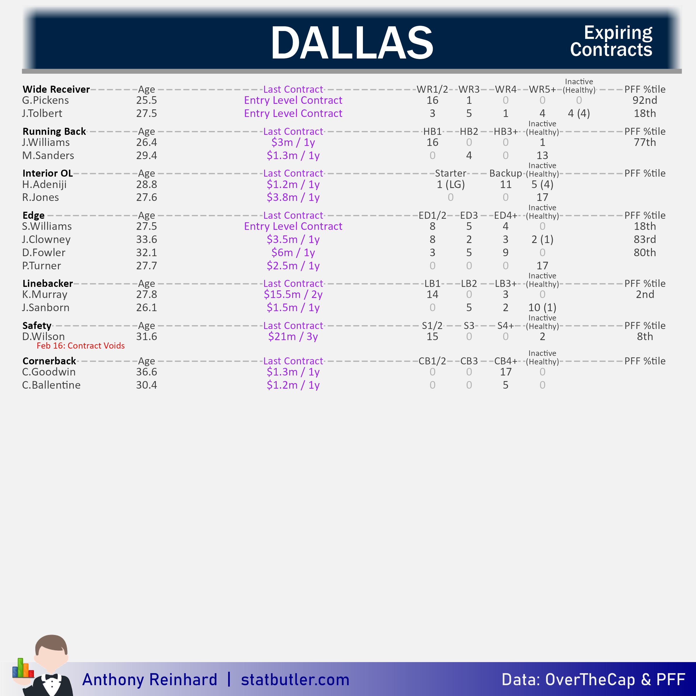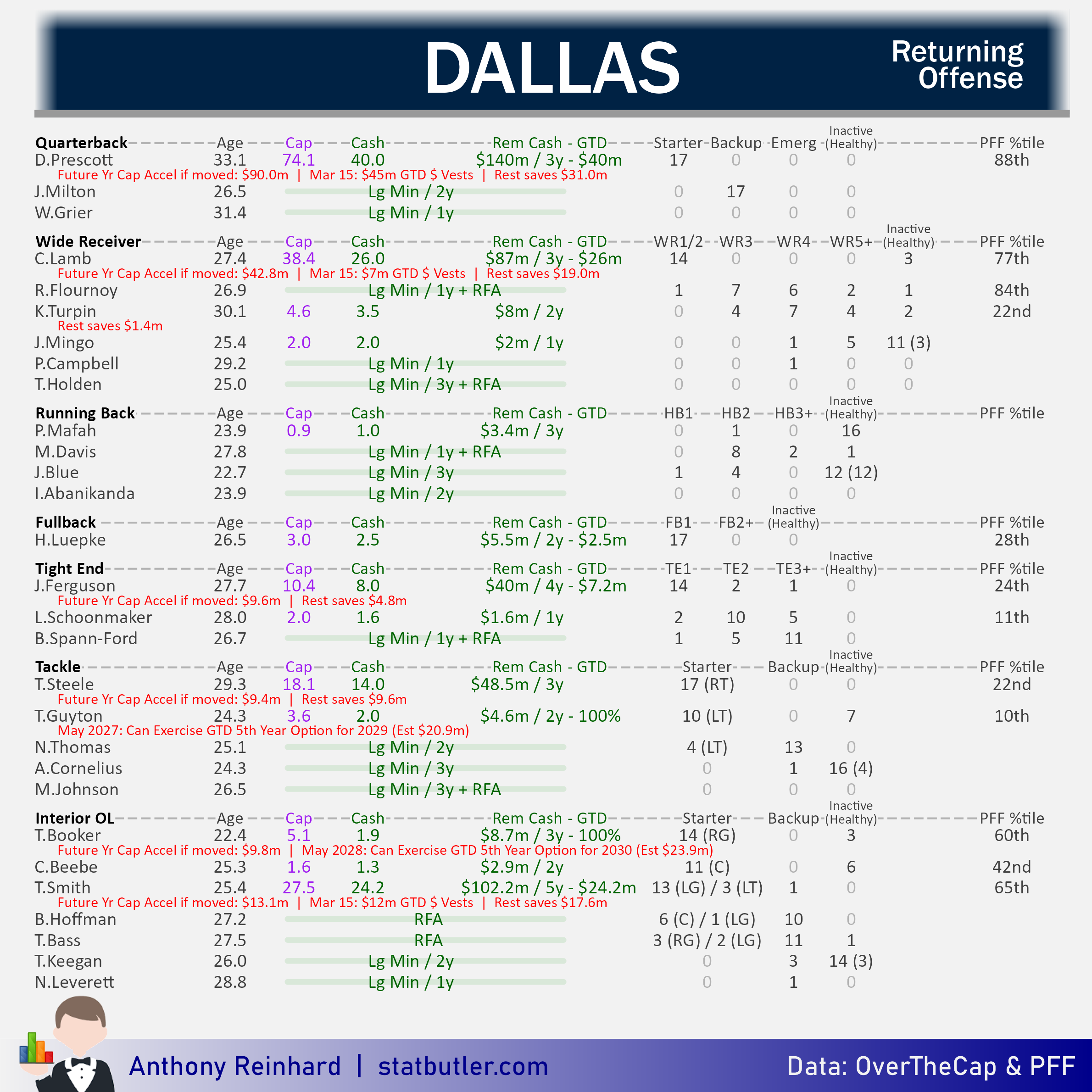 To me, cornerback feels like it is the most important piece that is missing without a clear replacement opportunity. The linebacker and running back groups are in worse shape, but those should be areas with sufficient options in free agency and the draft. On offense, I think Dallas just needs to do what they can internally to get better at tackle and see if they can replicate their 2025 success. On defense, they should be open to getting better at every position beside the interior defensive line.
