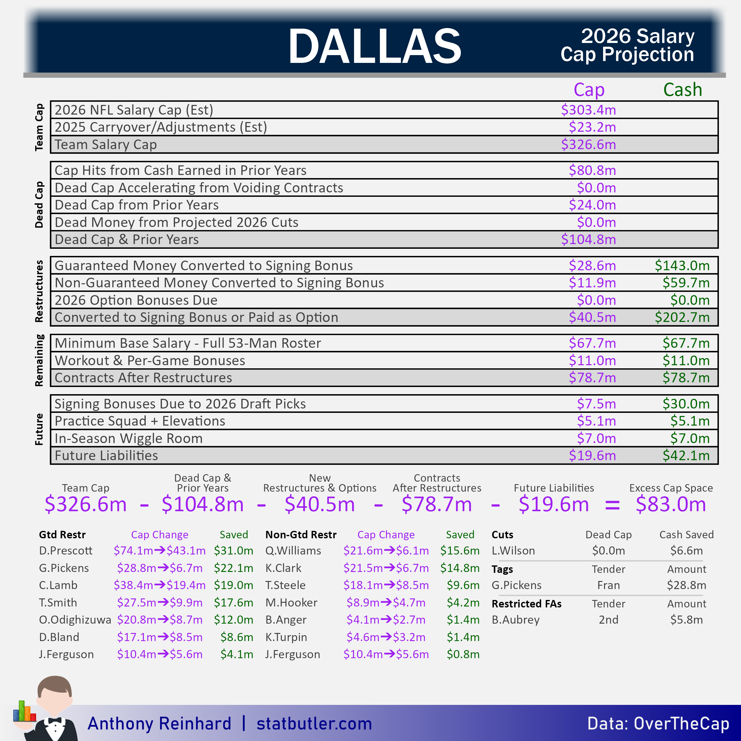 With that being said, after I build in my assumptions that include the Pickens franchise tag, Aubrey’s RFA deal, draft pick signing bonuses, and other future costs, I have the Cowboys slated to be spending $324m in 2026 which is 3rd in the league behind only the 49ers & Lions. Even though they don’t have any other major extensions to work on this year, I would be surprised if Dallas is willing to spend another $40m in 2026 cash on free agents and trades. If the Pickens deal gets done, which it should, don’t expect anything else too splashy from this team.