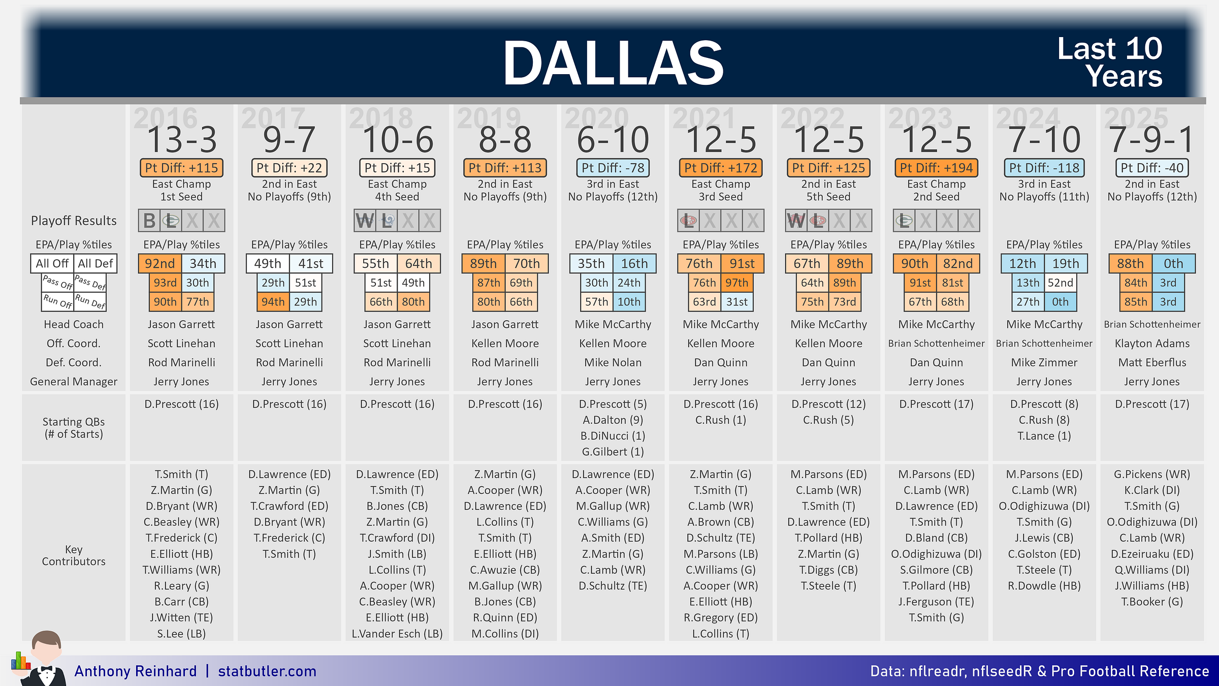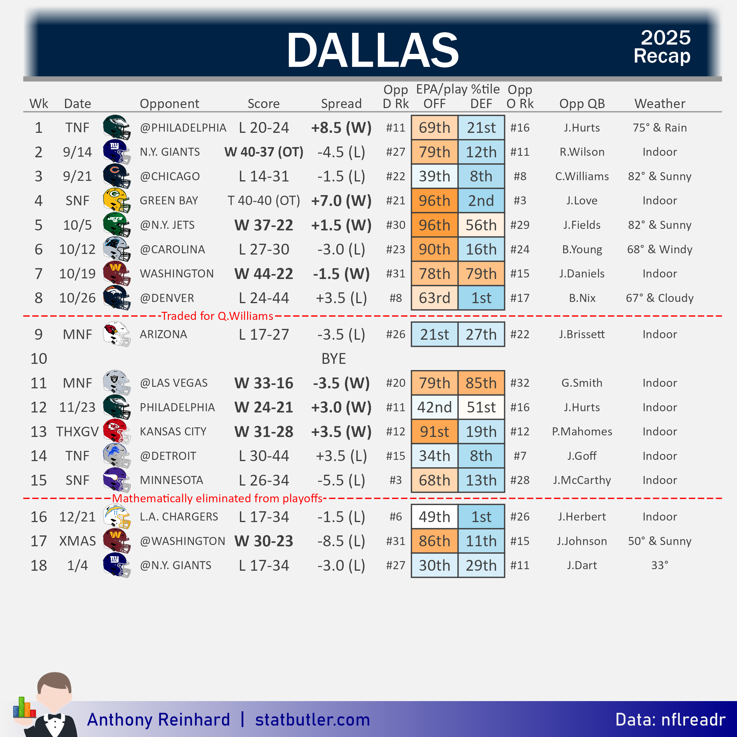 The Cowboys missed the playoffs in their first year under Brian Schottenheimer, but the offense rebounded strongly after a disappointing showing in 2024 where Dak Prescott missed most of the season. The defense, on the other hand, took a step back after star Micah Parsons was dealt to Green Bay.