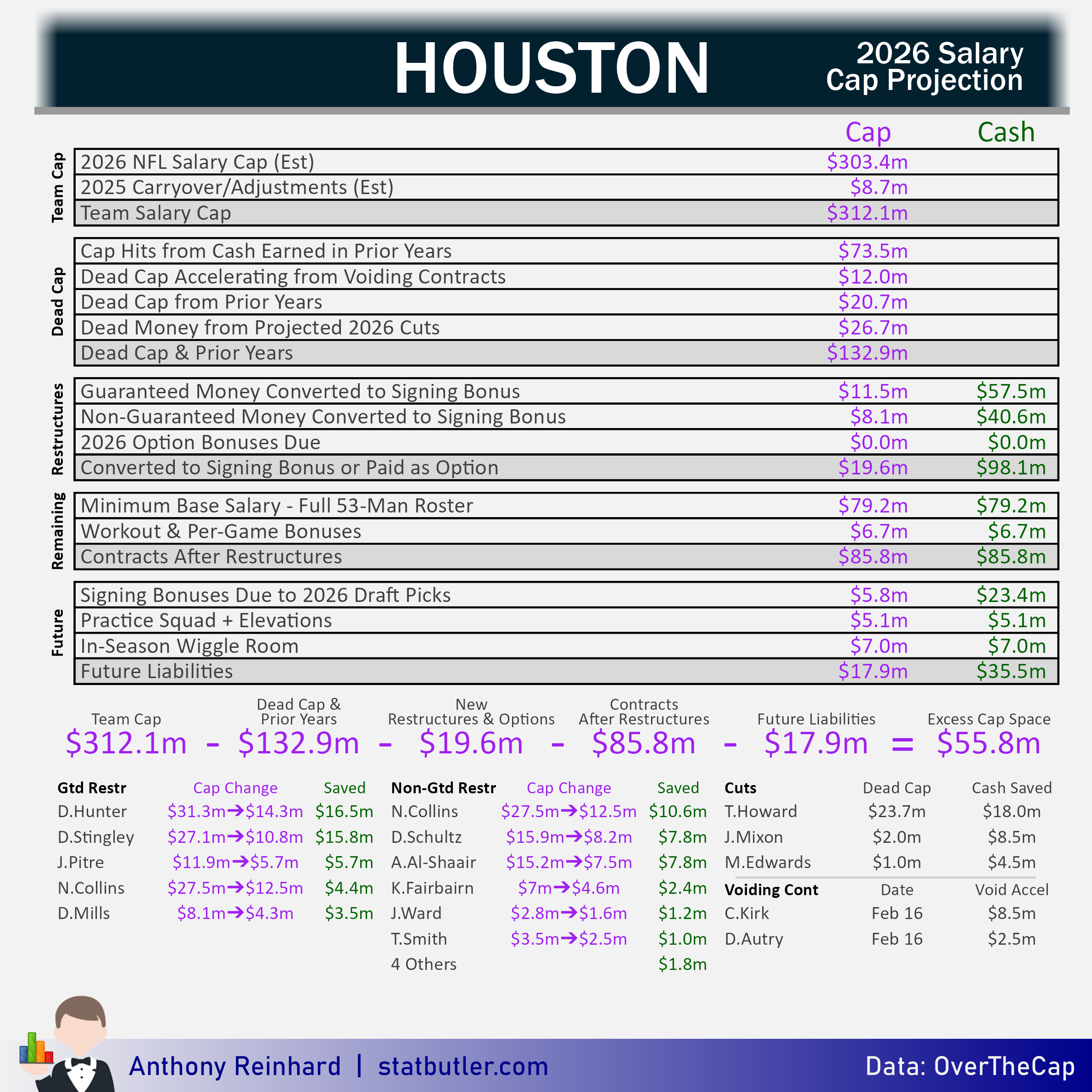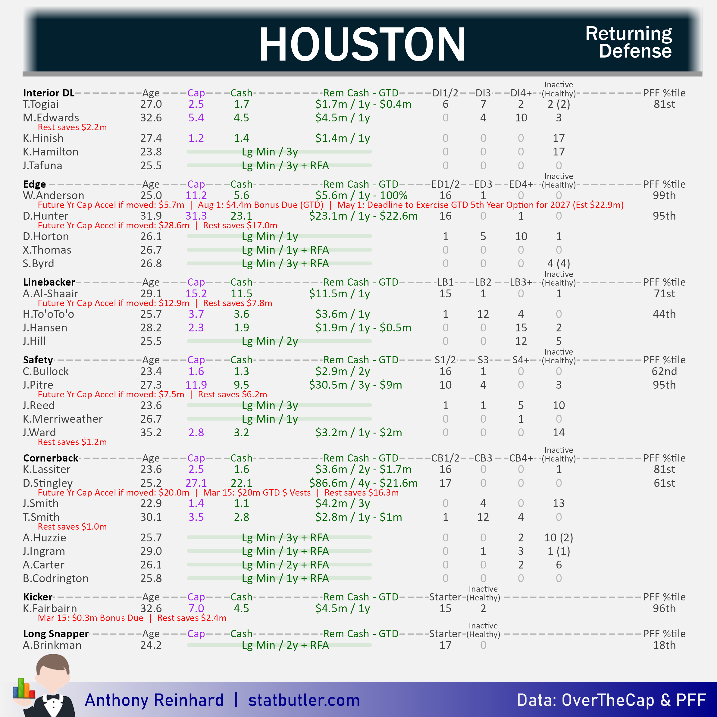 For the moment, Houston is expected to be right at the cap number. They’ll gain some space with the obvious restructures along with a few cuts.