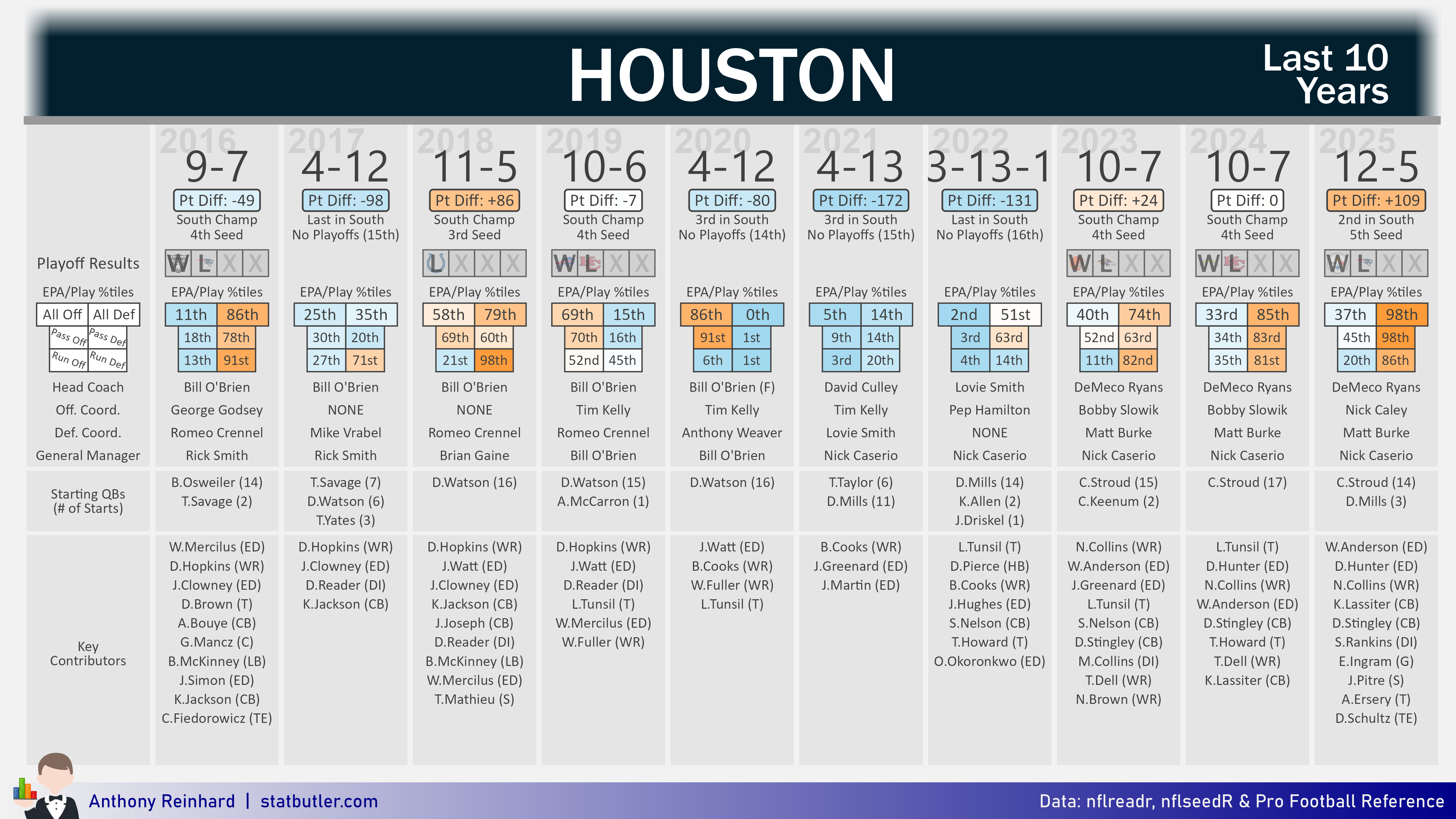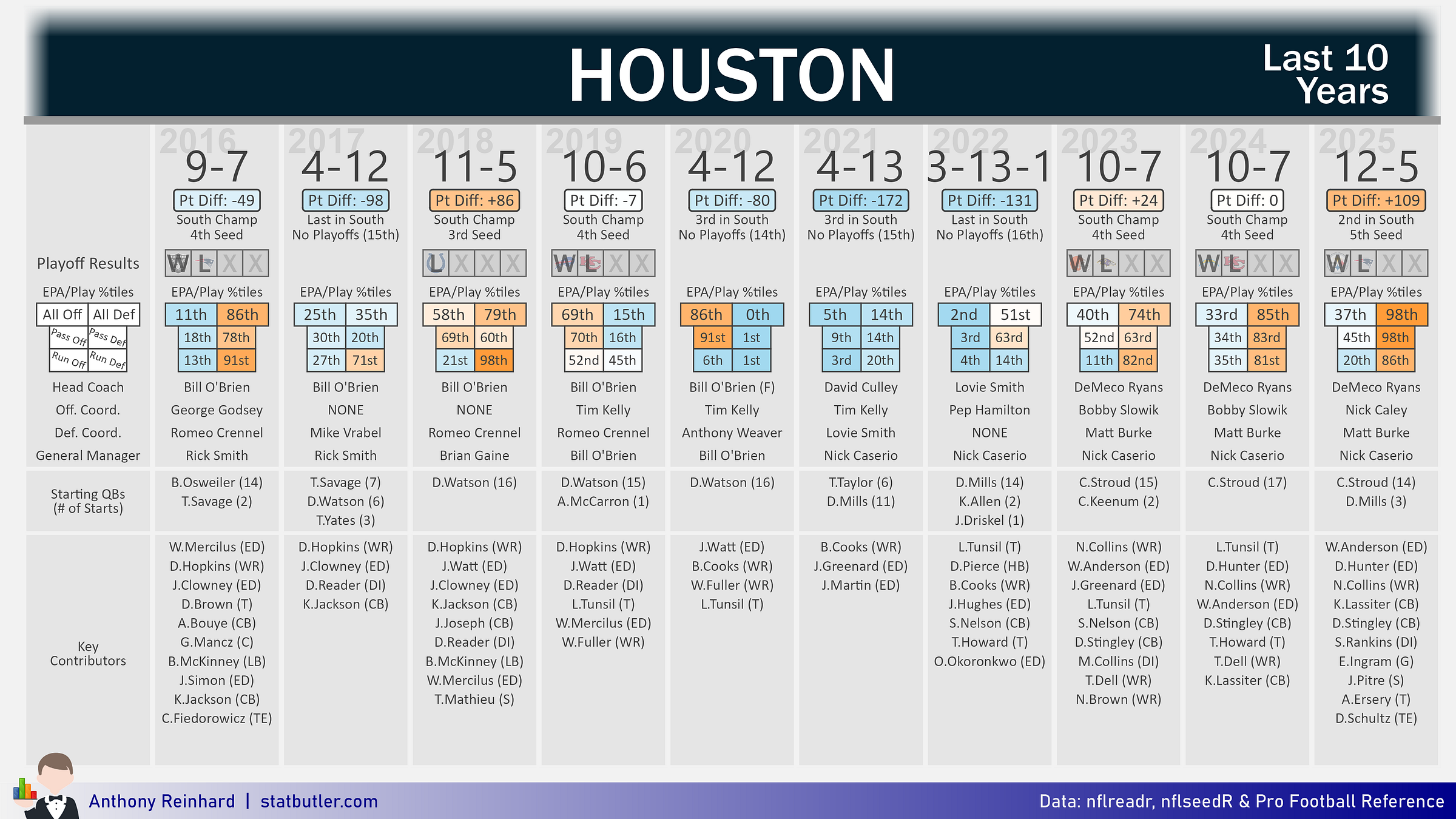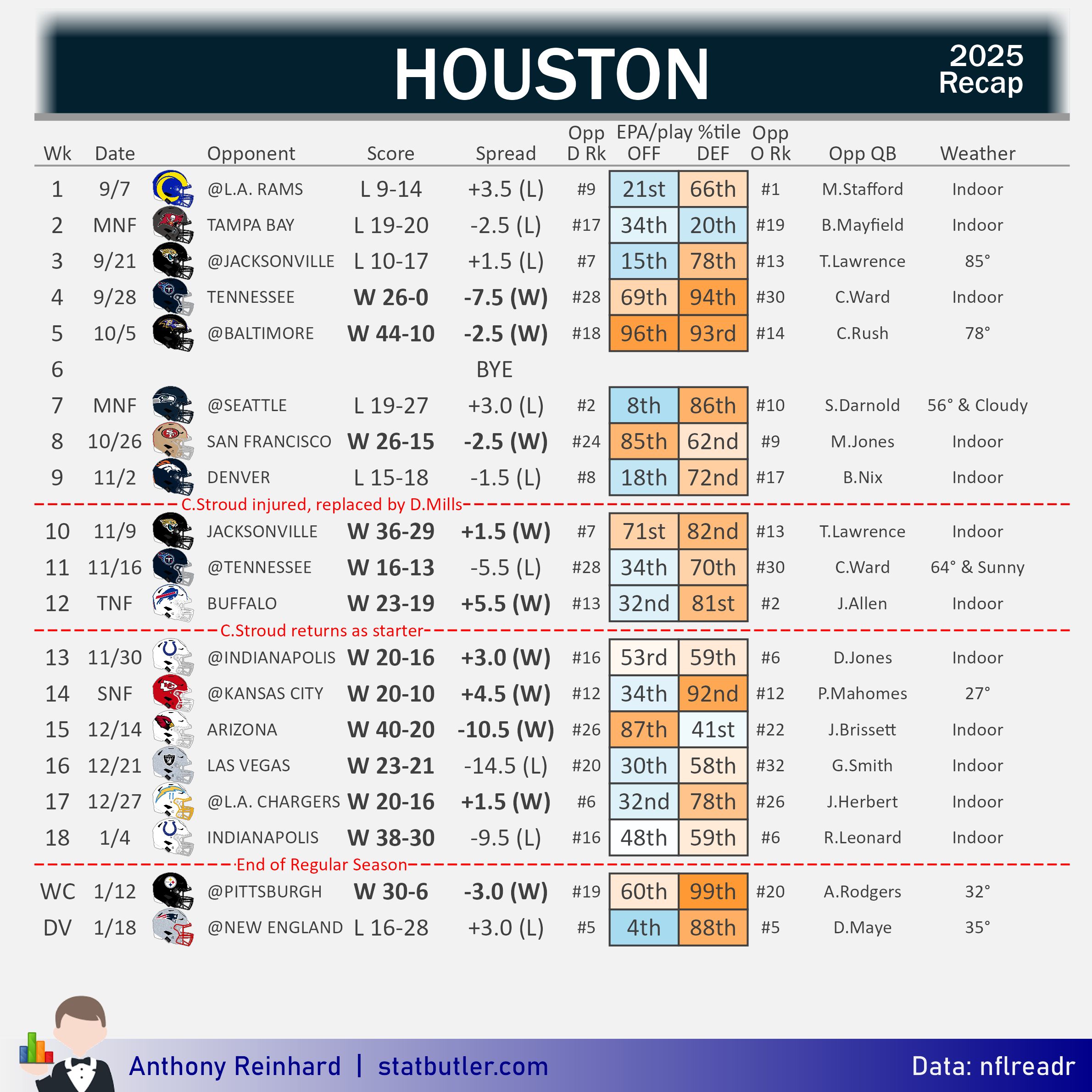 Houston began 2025 with three straight loses. Following that stretch, the Texans defense would go on to cement themselves as the one the top units in football. The season ended for Houston when their 10-game win streak was snapped by New England in one of Stroud’s worst ever performances.