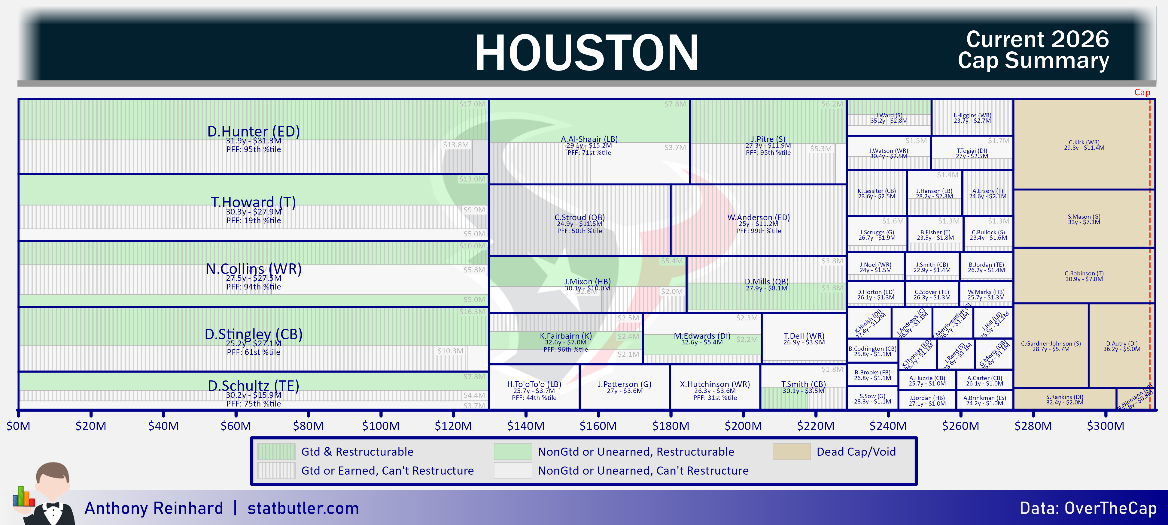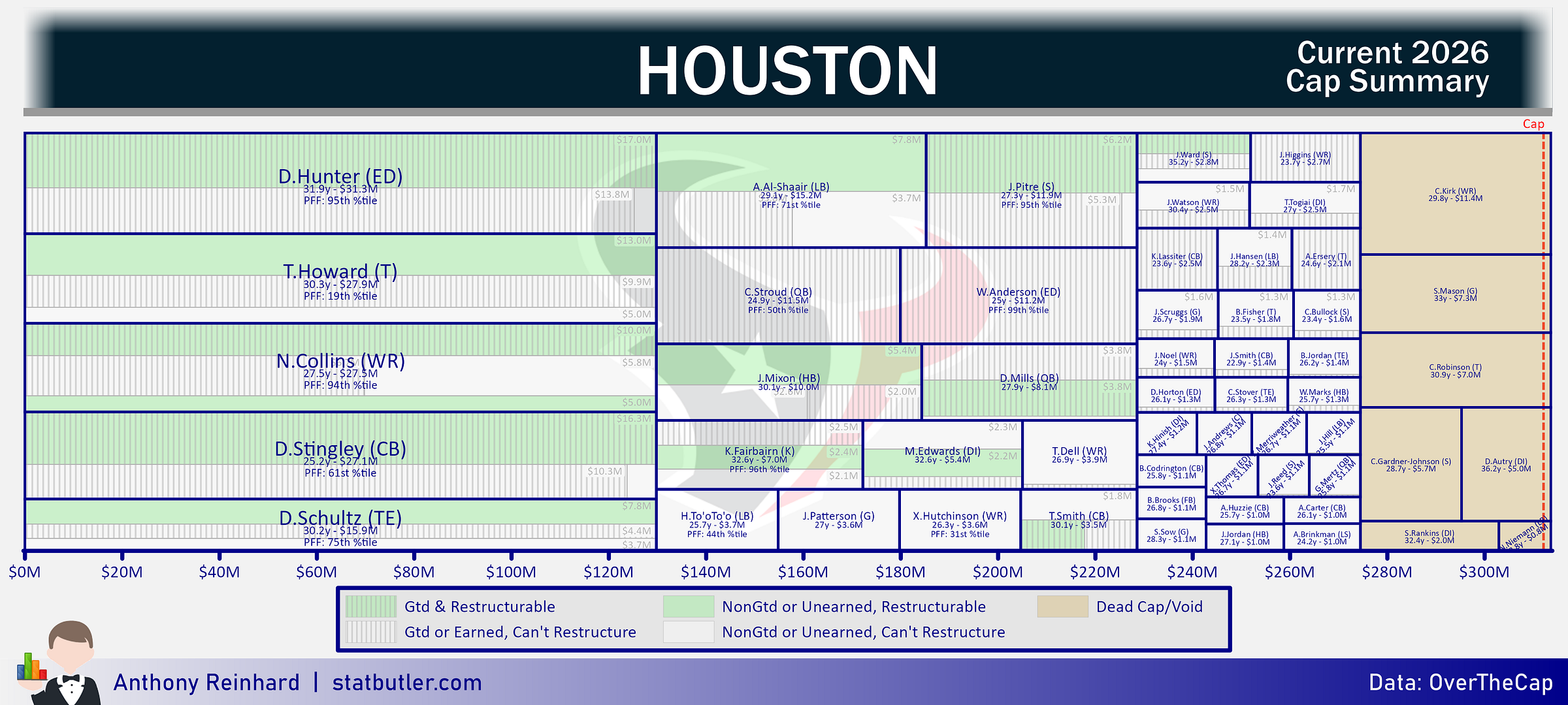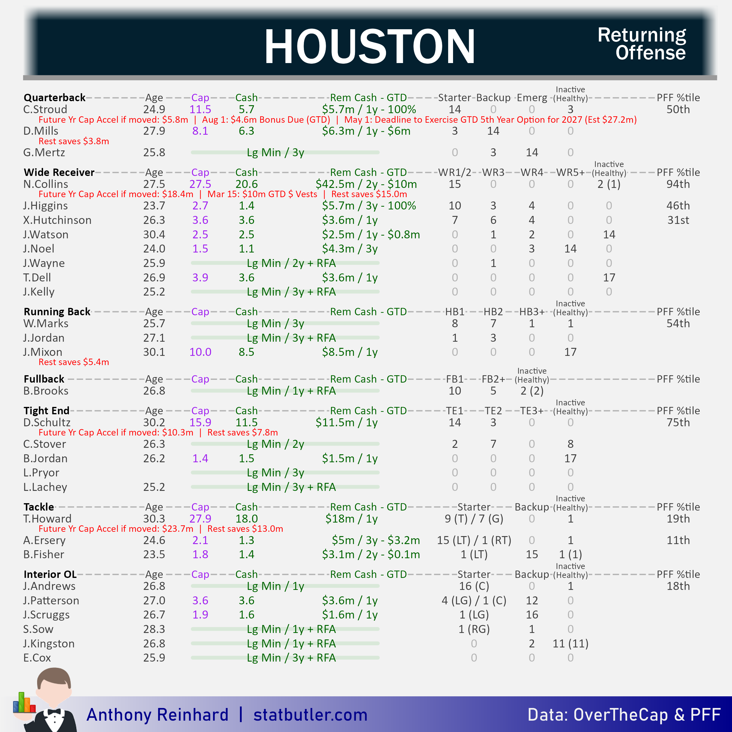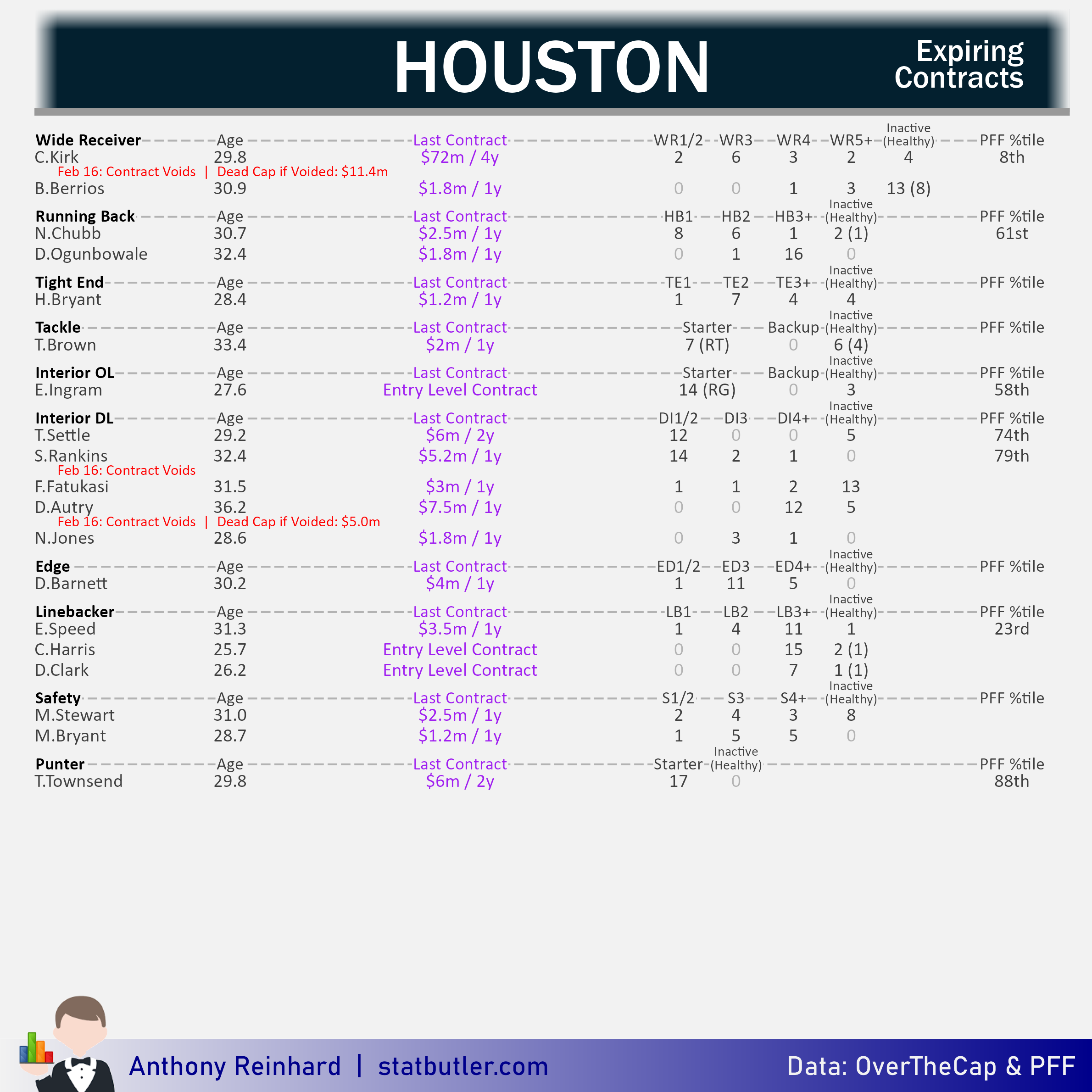 statbutler.com will be compiling offseason previews for all 32 teams in the lead up to free agency. Feel free to share any of the text/visuals below with attribution. All underlying contract data was collected by overthecap.com.