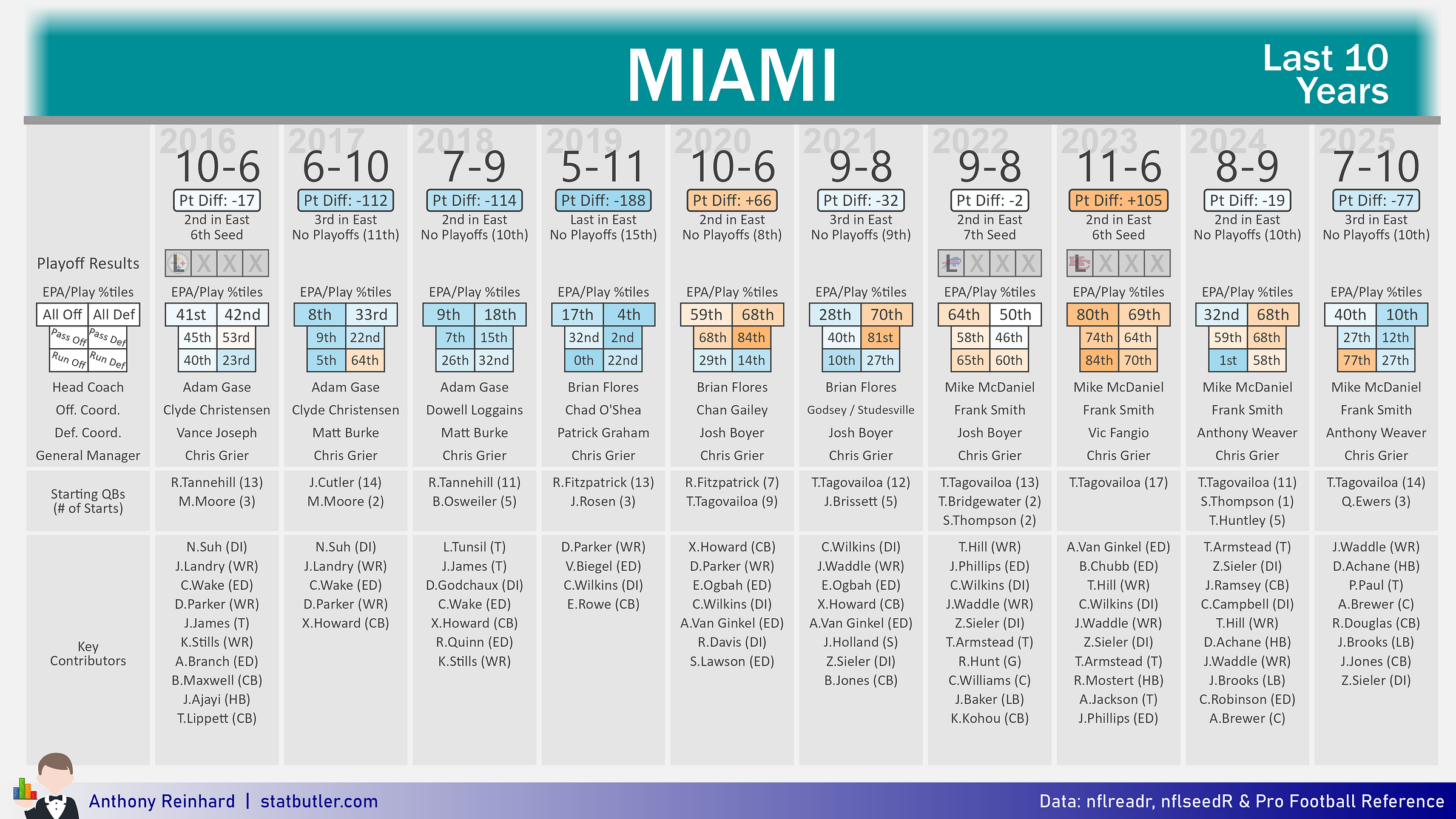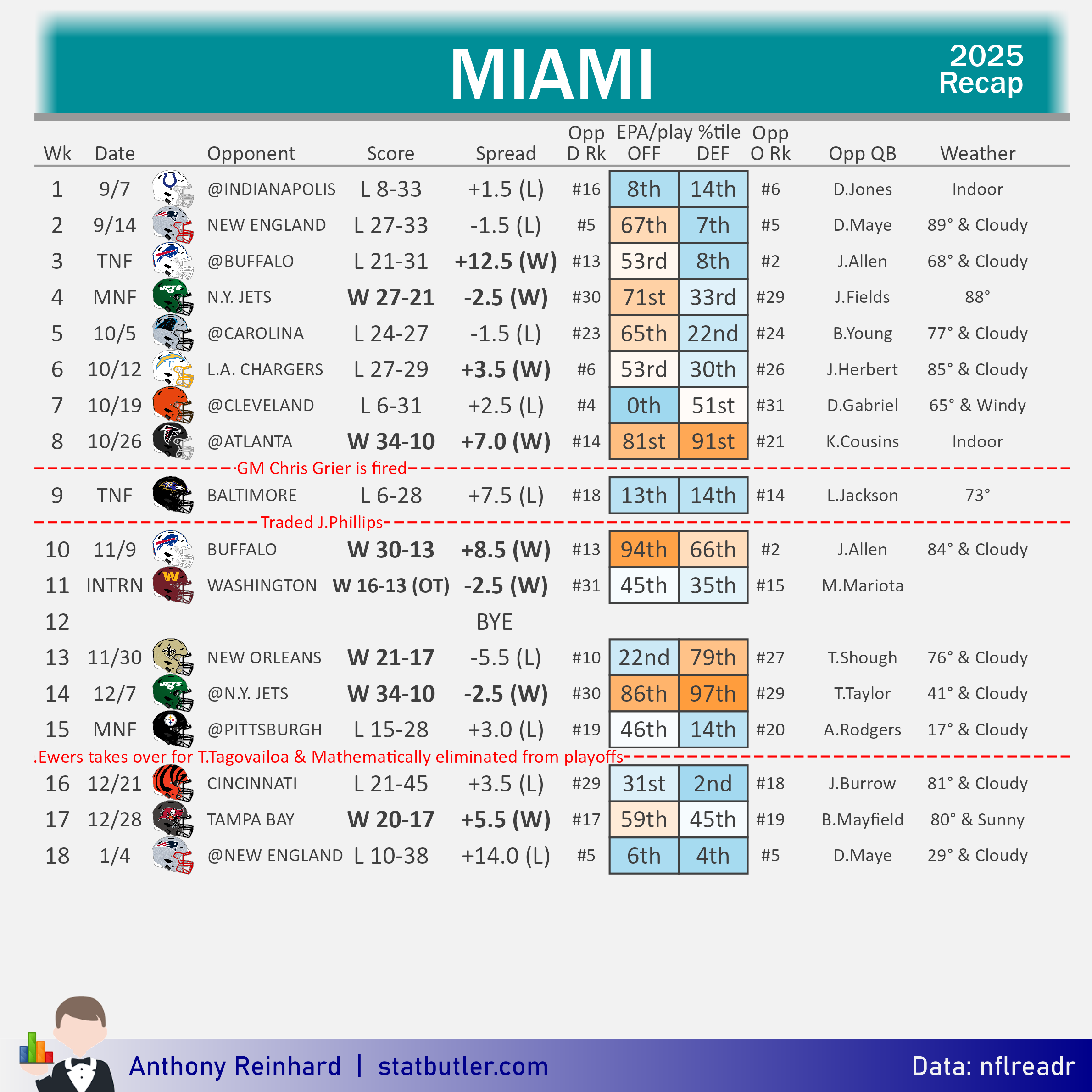 Miami began the season 1-6 and rebounded to close out the year with 7 wins. The slow start was apparently enough to fire general manager Chris Grier, who had logged a series of poor drafts in recent years. After being eliminated from the playoffs in Week 15, Tua Tagovailoa was relegated from starter to the emergency QB role. Head coach Mike McDaniel held on until the end of the season, but was eventually fired as well. During the season, the team traded away top pass rusher Jaelan Phillips to Philadelphia and lost star receiver Tyreek Hill to a season-ending injury in their Week 4 win on Monday Night Football against New York.