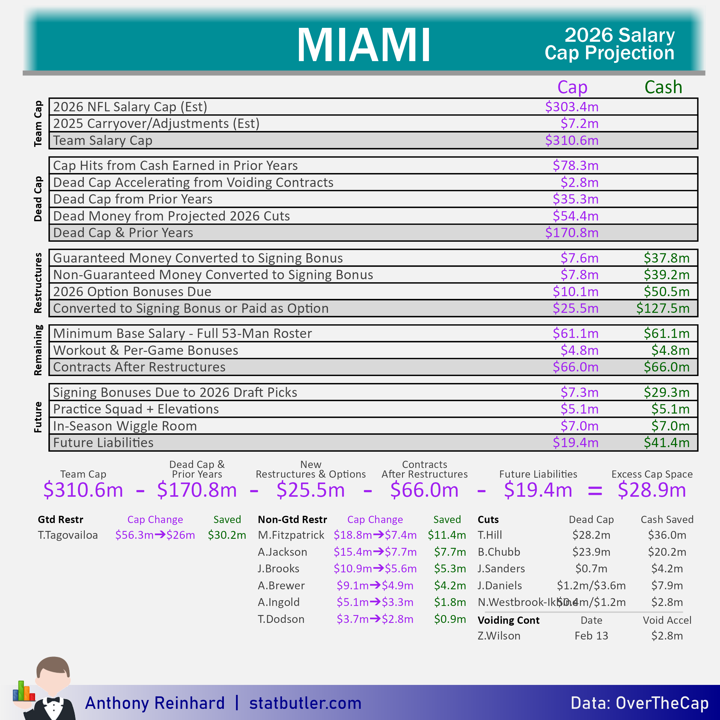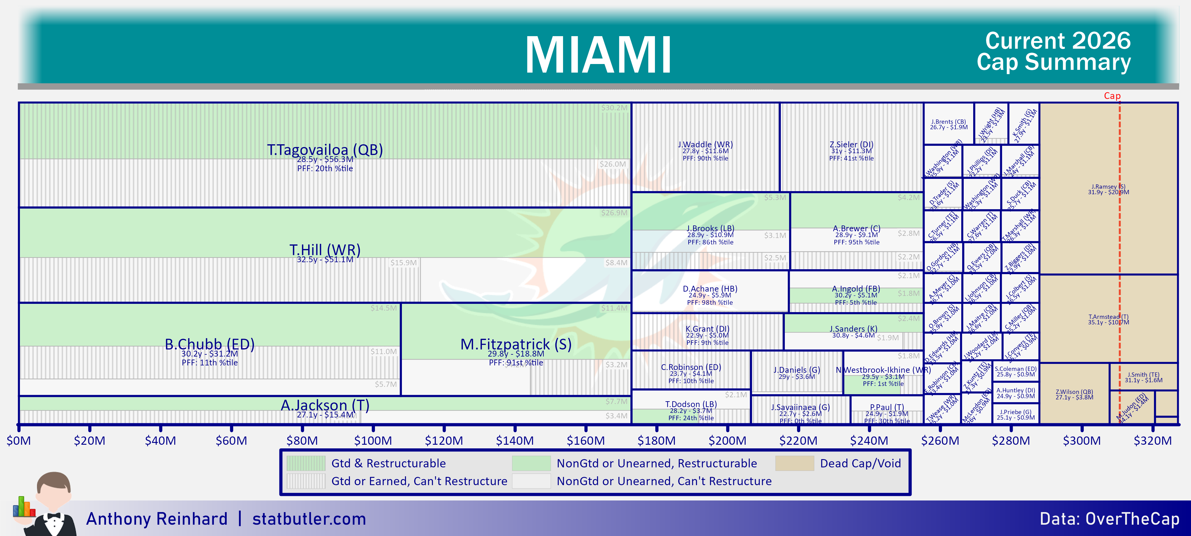 The future of Tua Tagovailoa’s contract is really the most complicated piece of how Miami moves forward. Understanding the flow of cash is always the best place to start putting the puzzle together. Tagovailoa is due to earn $55m in 2026 and $54m of that is already fully guaranteed. He has another $3m of his salary next year that will vest into a full guarantee on March 15th. If cut, Miami would only relieve itself of $4m. My initial thought was that it positions him well to take on a backup role. However, there is a catch. The contract already has an additional $17m of 2027 salary that is guaranteed for injury. If Tagovailoa were to finish the 2026 season with an injury, he would earn that money when cut. Given his unique injury history, this is a real risk. It serves as a poison pill to his contract that makes playing him or trading him a risk.