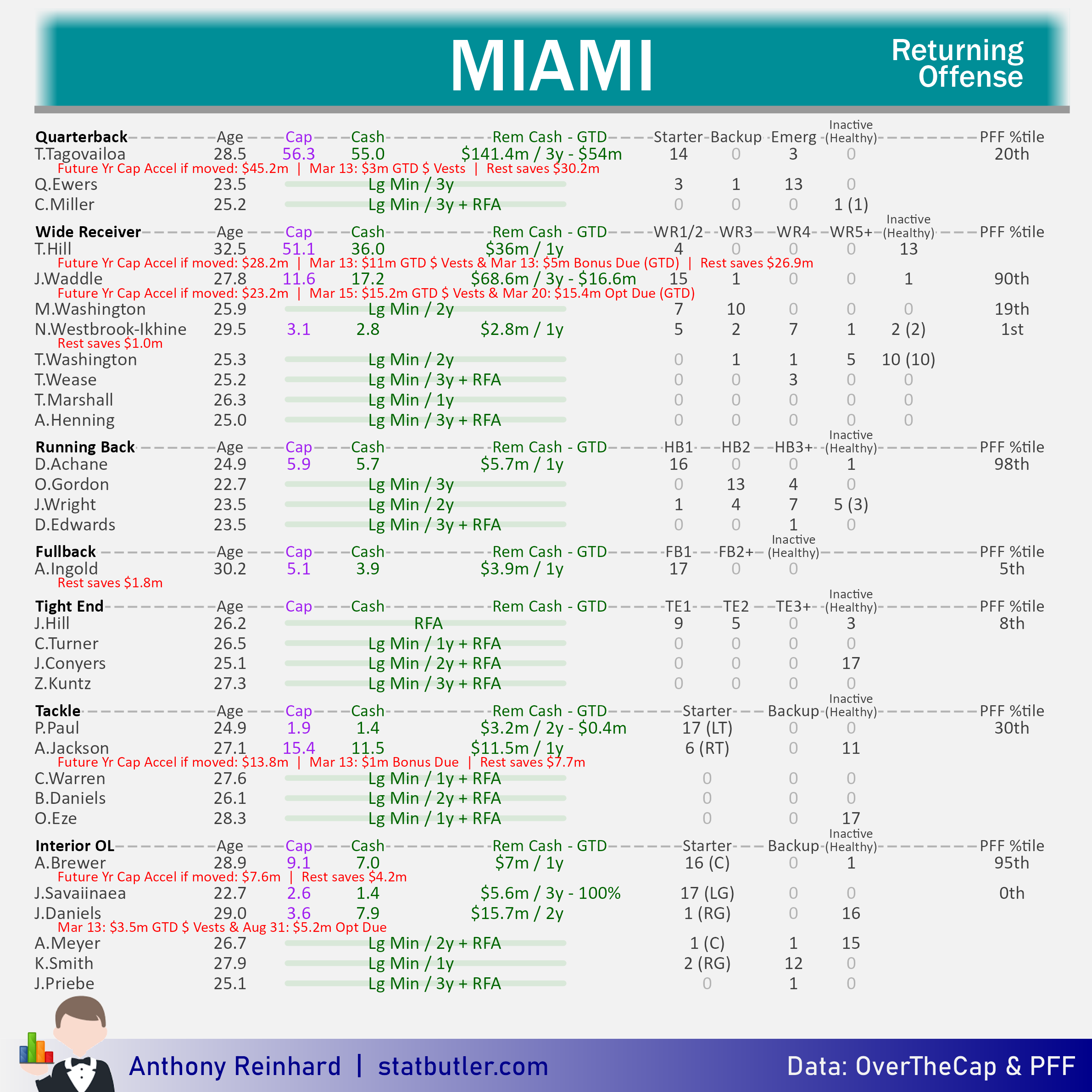 Cutting Tyreek Hill will get the Dolphins to cap compliance, but I suspect the only way for them to have a serious offseason is for the team to also restructure Tua’s contract. It’s a tough situation that is exacerbated by needing to exit a number of contracts simultaneously.