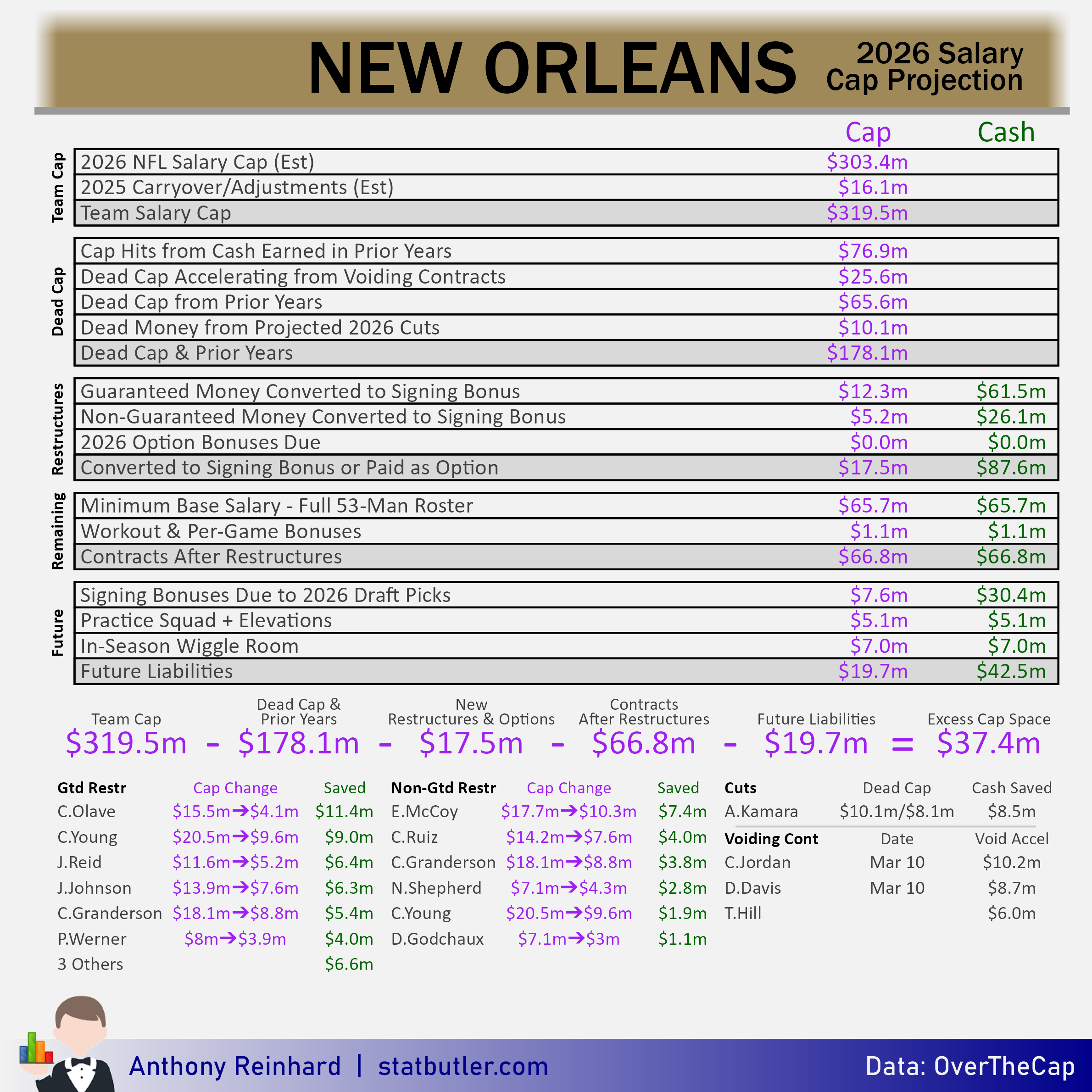 In the breakdown above, I’m assuming New Orleans will take every possible max restructure (they won’t, but they may leave the option open), cut Kamara, and allow the contracts of Jordan, Davis, and Taysom Hill to void. That leaves them with $37m in “Excess Cap Space” (29th) to be used for extensions, free agents, and trades. If Cam Jordan signs before his void date, I’d say that’ll add another $8m or so. Davis could tack $7m on to that. In terms of planned cash spending at this point, I have New Orleans under $200m with only six other clubs, most of whom have $100m+ in excess space. This paradox is a consequence of overspending from prior seasons.