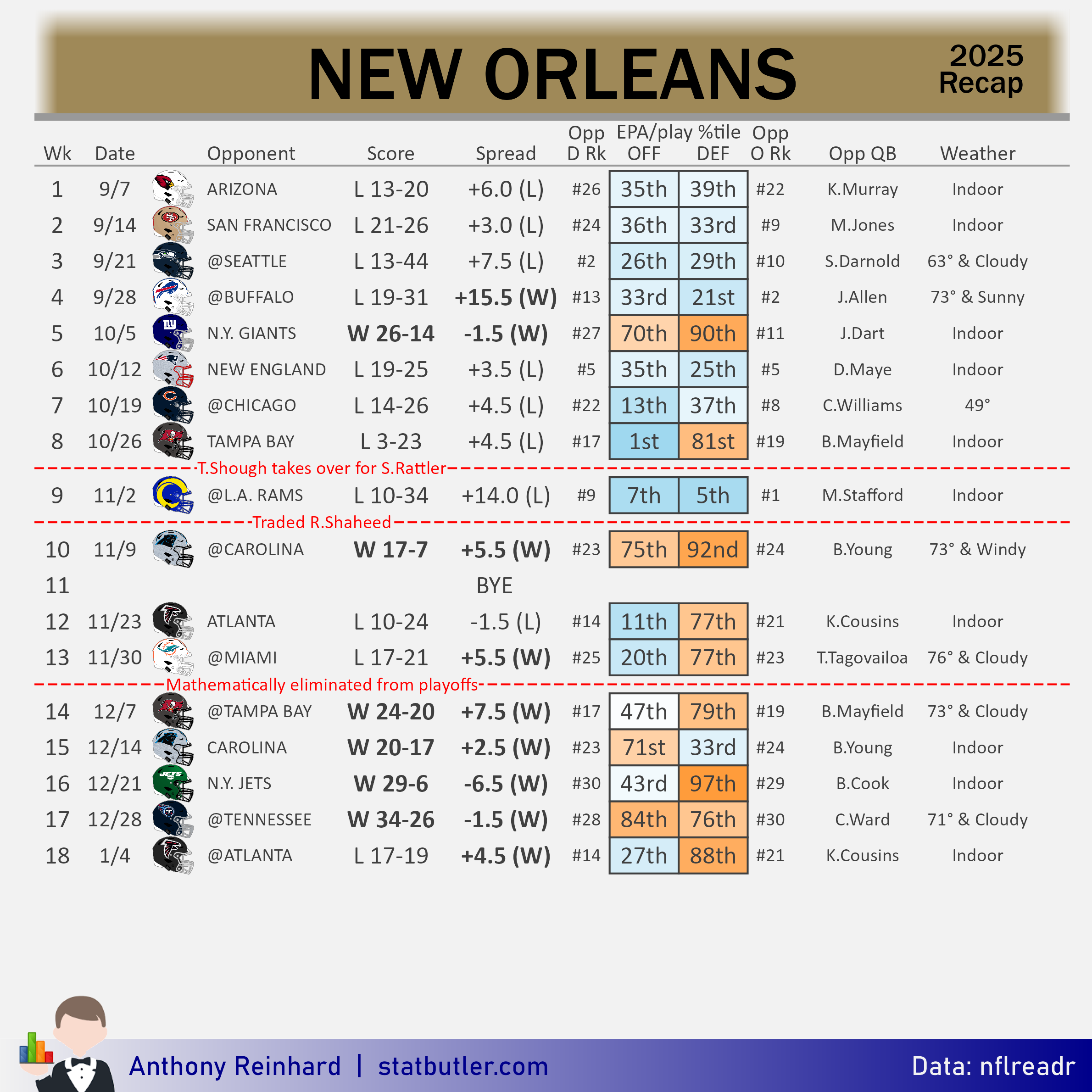 The Saints finished 2025 on a tear. They covered in 7 of their last 8. After their Week 11 bye, New Orleans had the 4th best EPA/play on defense. The offense surged behind rookie QB Tyler Shough. To be fair, this team had a major tailwind from the ease of their schedule down the stretch. After falling 34-10 to the L.A. Rams in Week 9, New Orleans faced exclusively teams that had an offense and defense at or near the bottom half of the league. This team will be in the rare category of missing the playoffs without changing their head coach, coordinators, general manager, or starting QB.