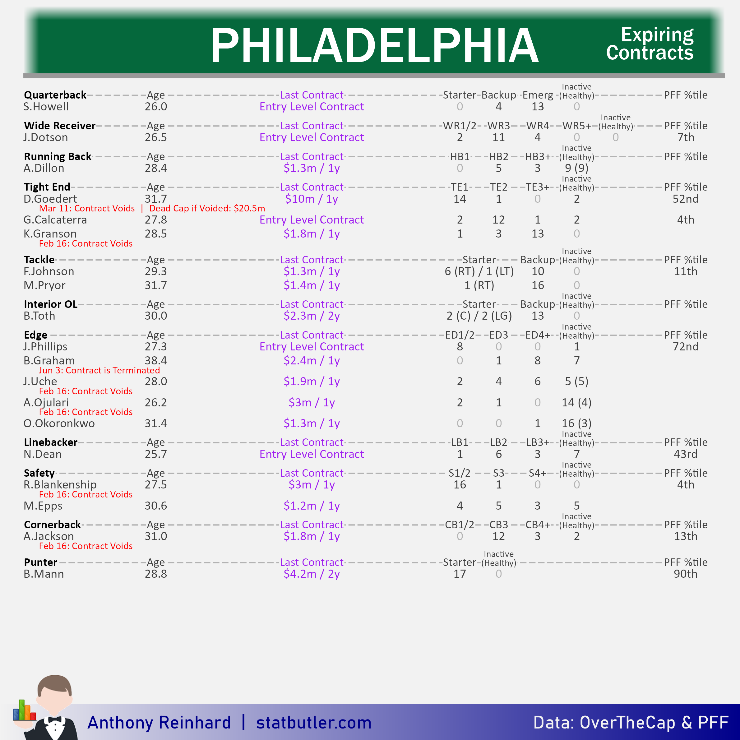 Now we get into the tough part. Jaelan Phillips pretty much has to be a guy that gets extended given that they sent a third round pick to Miami to bring him on last season. Dallas Goedert carries a meaningful cap boost if he can ink an extension before his contract voids on on March 11th. If Goedert does not sign before that point, he’ll count as $20.5m against the Eagles cap. If he can get a deal done however, a $12.9m portion of that hit can remain in future cap years. The new deal might carry a cap hit of $4m or so, so the extension should open up at least $9m of space. It should be noted that if the deal is for a single year, they’ll be back in the same spot at this time next year.
