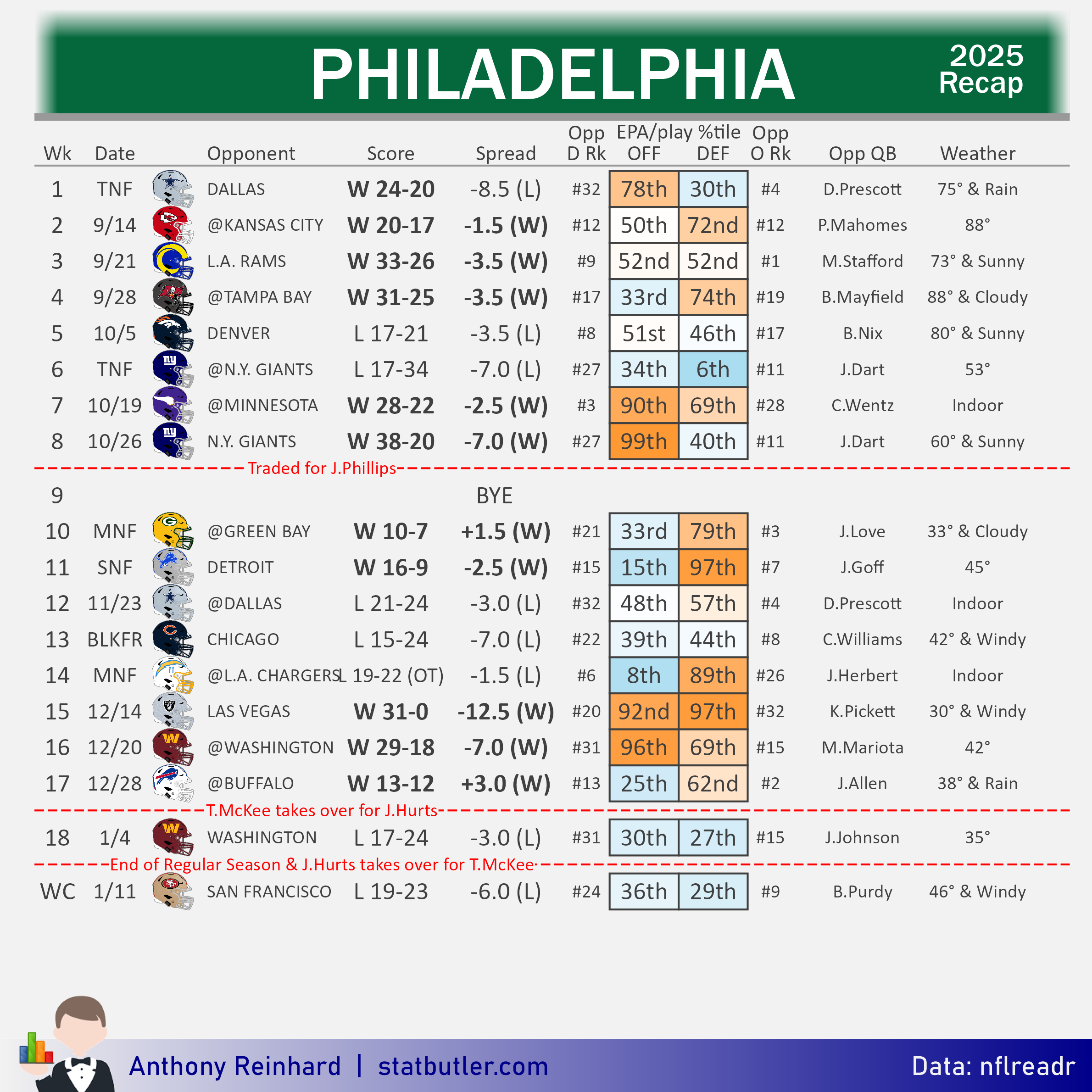 I would say the truest driver of Philadelphia’s consistent success over the last four years has been their offensive line. The 2025 edition was good, but perhaps was a bit worse than what we’ve come to expect. At receiver, the combination of A.J. Brown and DeVonta Smith were sometimes not as involved as they had been. The tandem averaged 79.2 receiving yards per player game in their first season together in 2022. There were slight drops in 2023 (76.4) & 2024 (73.5), but their average of 62.8 this season should be a wake up call. You can really tell the same story across the board for every face of this offense: they took a step back in some form.