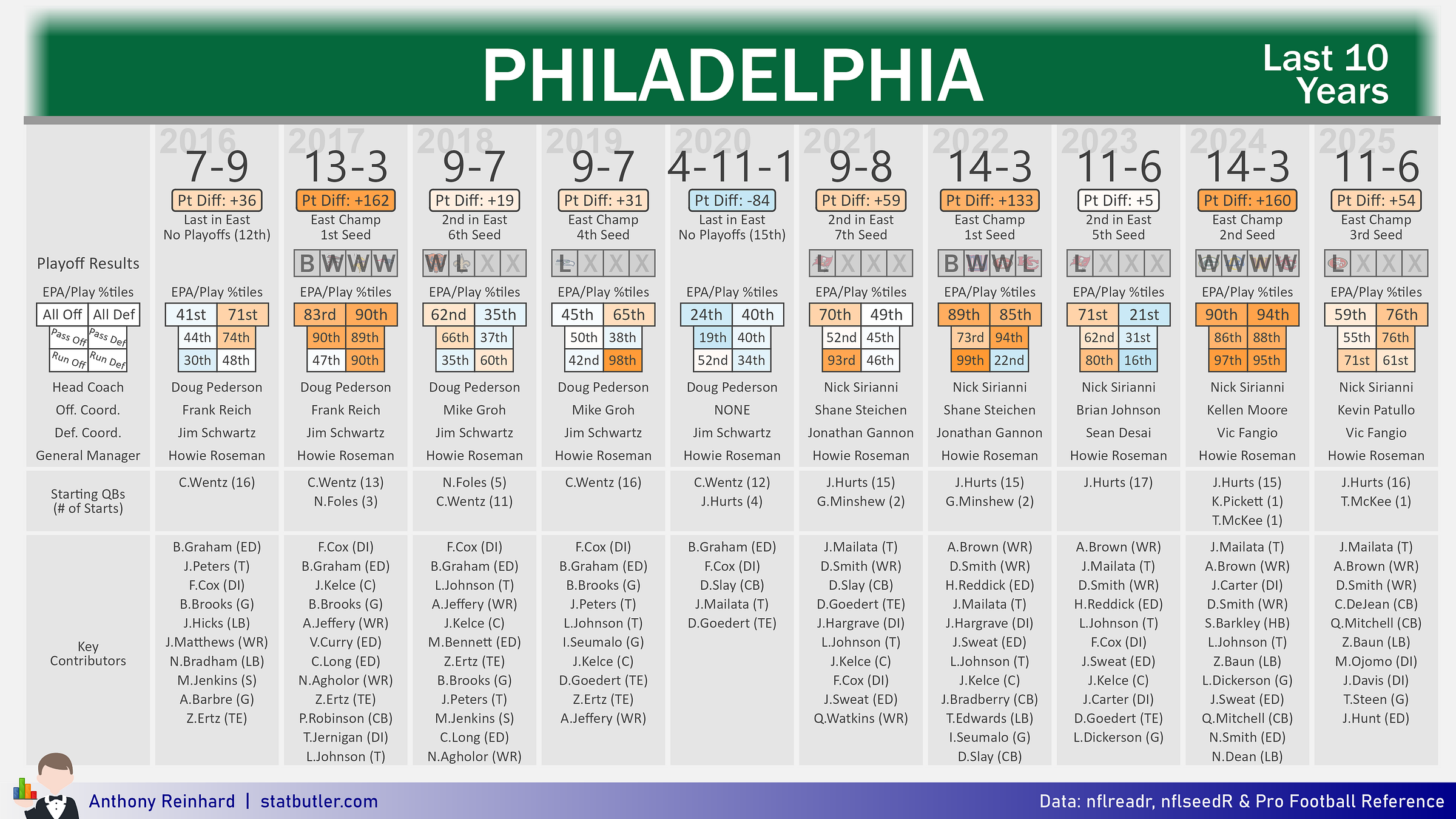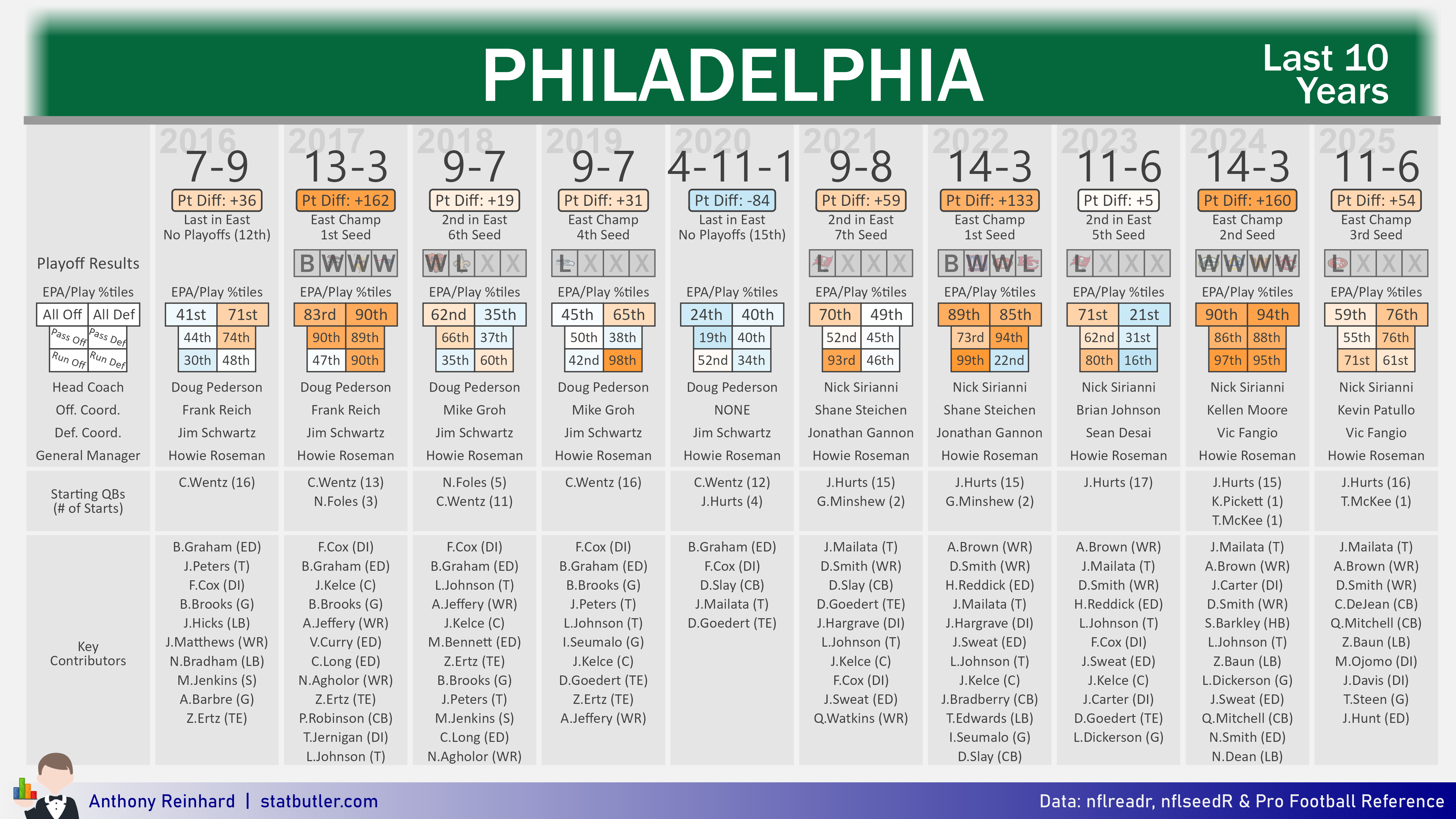The Eagles returned to the playoffs in 2025, but bowed out in the Wild Card round after a turbulent season. At 50-18, the Eagles continue to have the best regular season record in the NFL over the last four seasons.