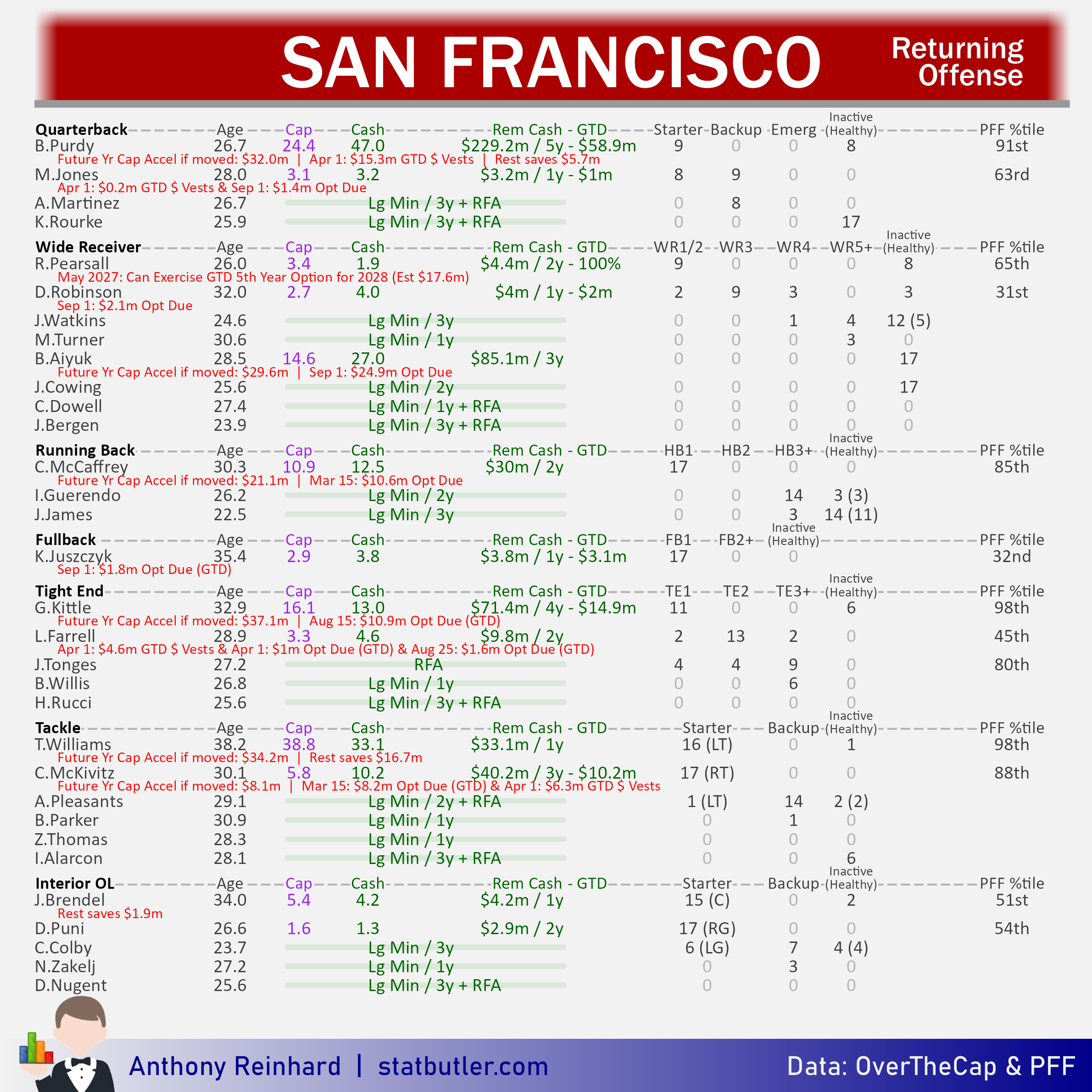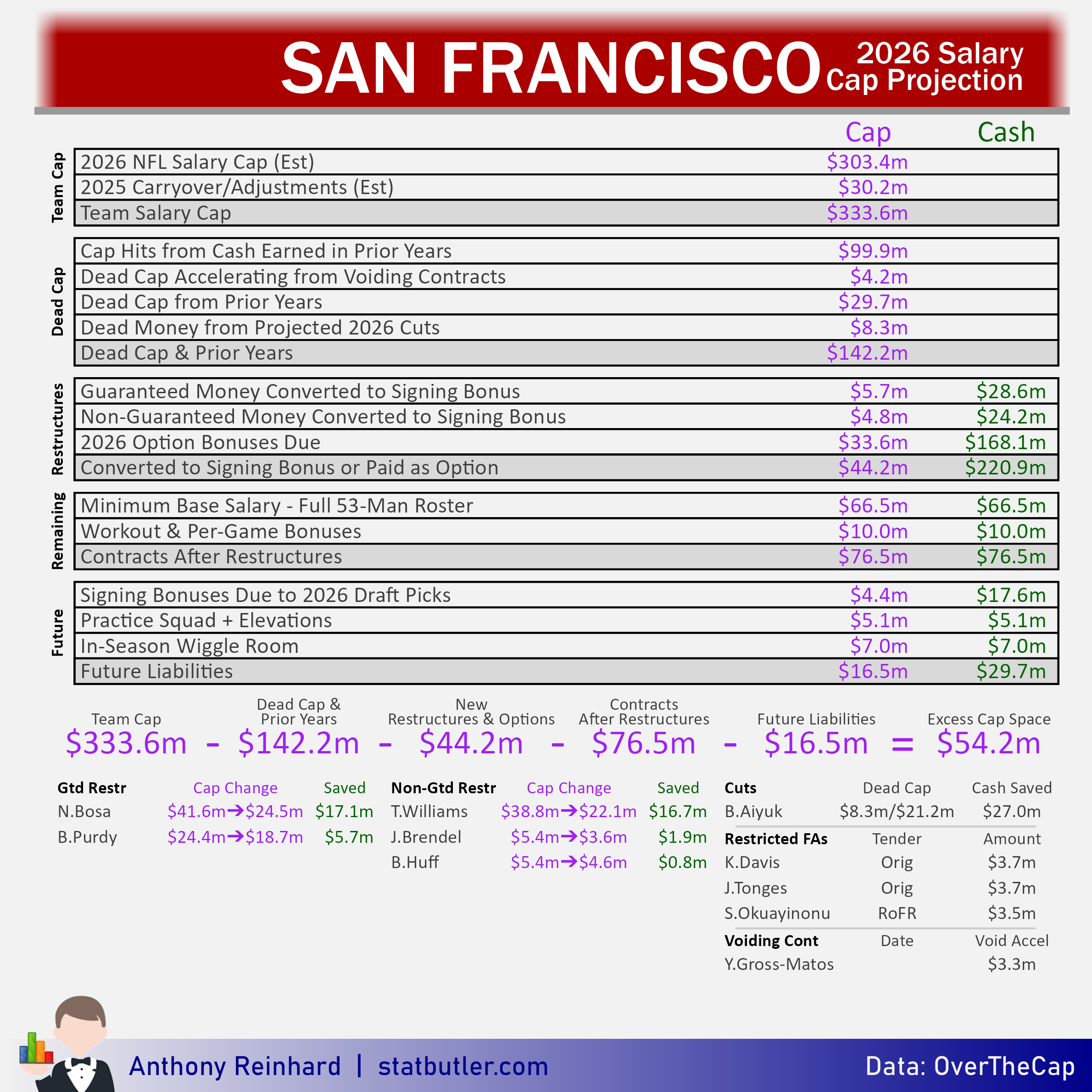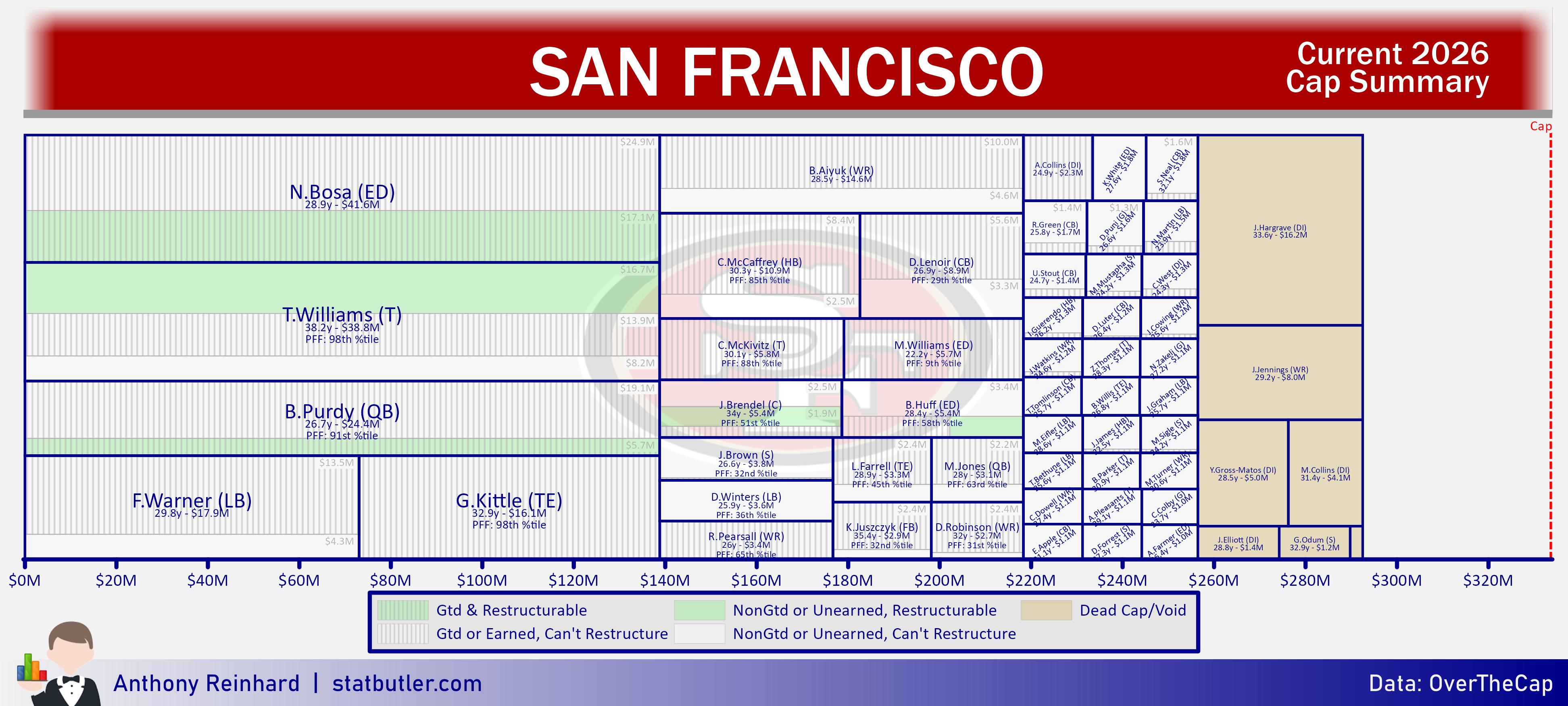 Cap space isn’t an immediate concern for San Francisco. Still, there really isn’t a ton of extra space available to be created from what you see above. The 49ers won’t have the luxury of a wide open offseason.