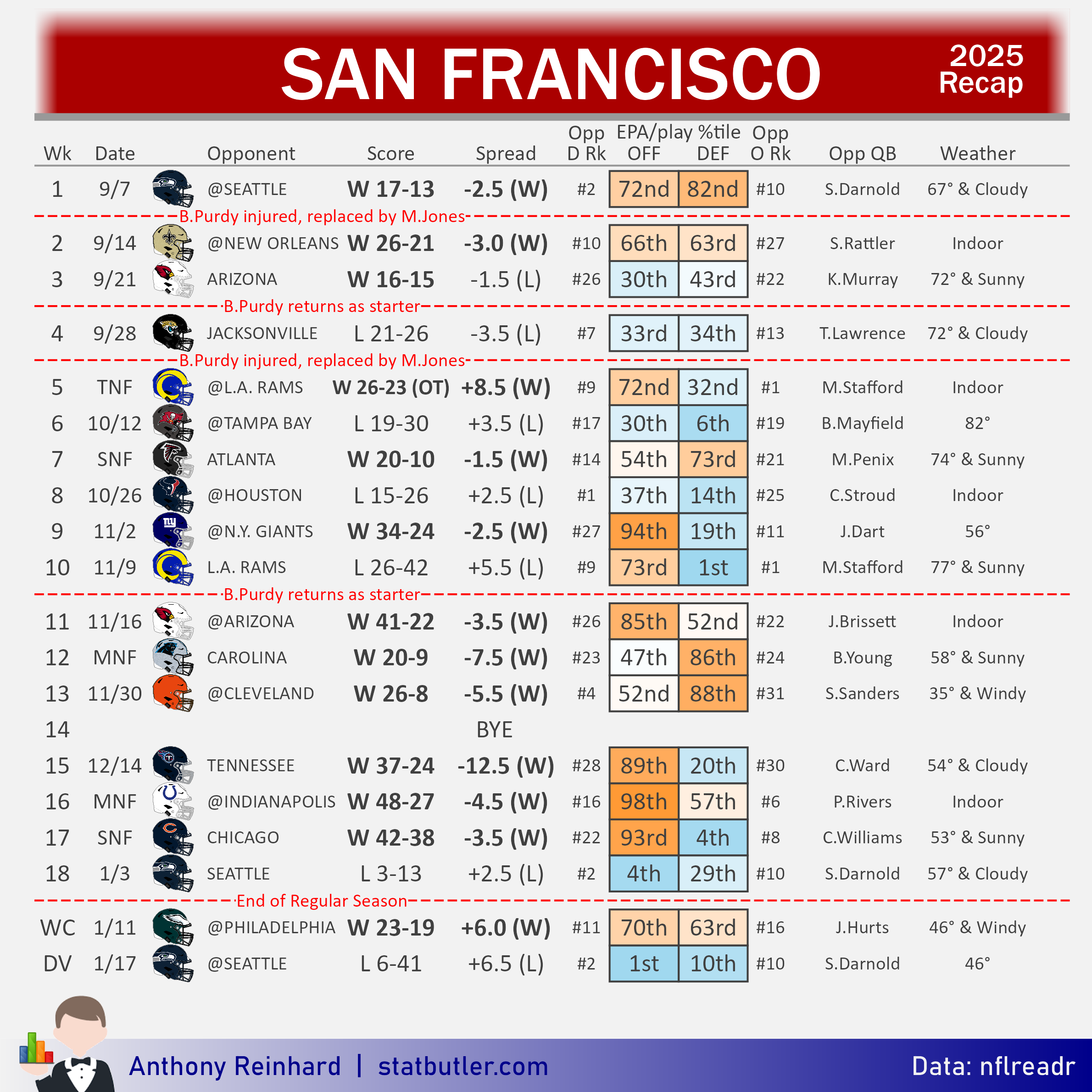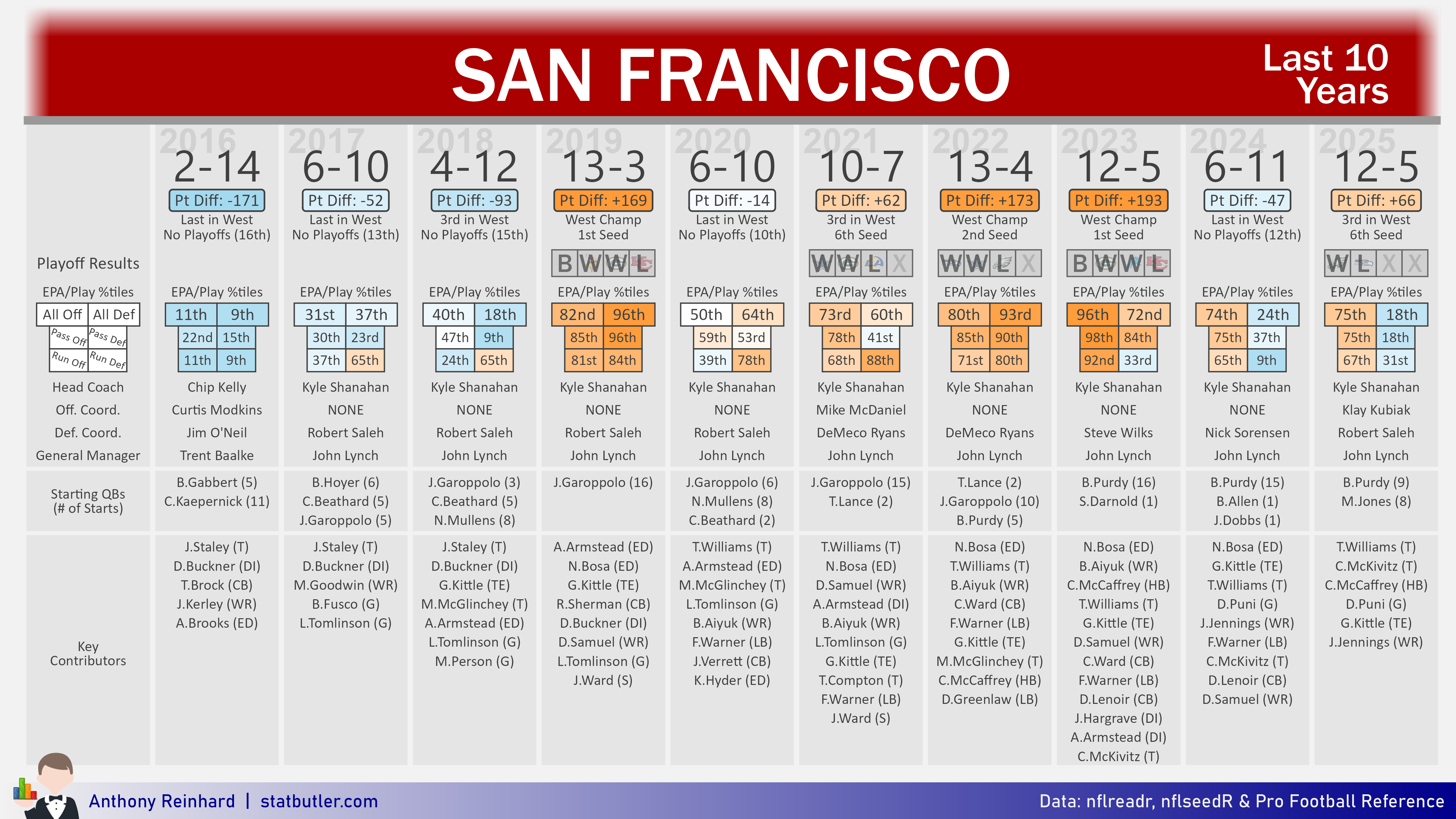 After a disappointing 2024, San Francisco reversed their fortunes and turned in a 12 win season plus a playoff win, despite the fact that they dealt with significant injury issues.