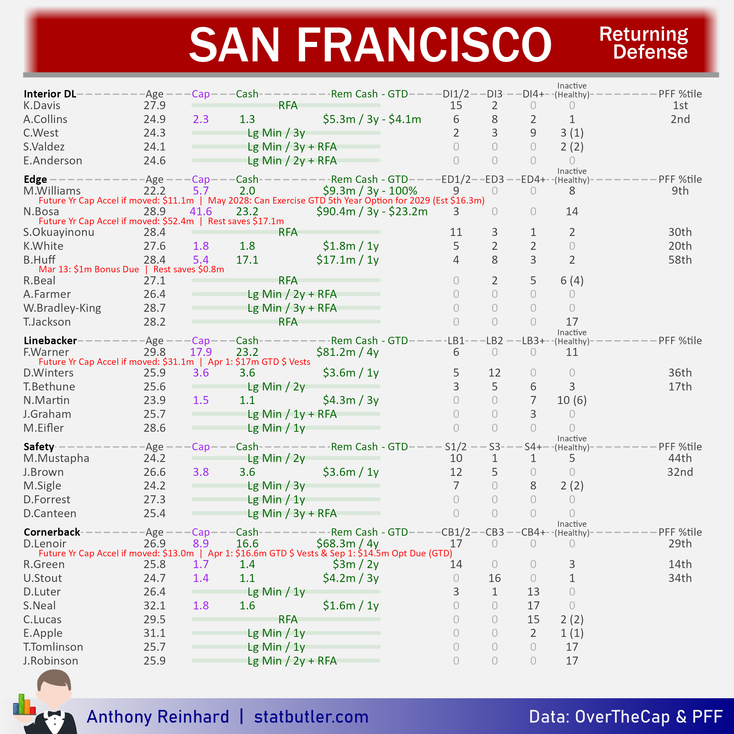 San Francisco’s defense is younger than their offense, but the unit also isn’t quite as strong. There are four defenders due to make $15m+ in 2026: Nick Bosa ($23.2m), Fred Warner ($23.2m), Bryce Huff ($17.1m), and Deommodore Lenoir ($16.6m). Bosa, who missed nearly all of 2025 with a torn ACL, is the only of the four who has any guarantees at the moment and it covers all of his 2026 compensation. Warner missed significant time in 2025, but was playing well prior to that. His offseason is especially significant because he’s due to have his next two years of salaries ($1.7m & $15.3m) vest to full guarantees on April 1st, but at some point will also earn a $21m option which makes up nearly all of his 2026 pay. With that said, Warner can effectively lock in $38m prior to the start of the season. Bryce Huff played well enough to stick at $17m in my opinion, but I’m sure San Francisco would like to see him a bigger load going forward.