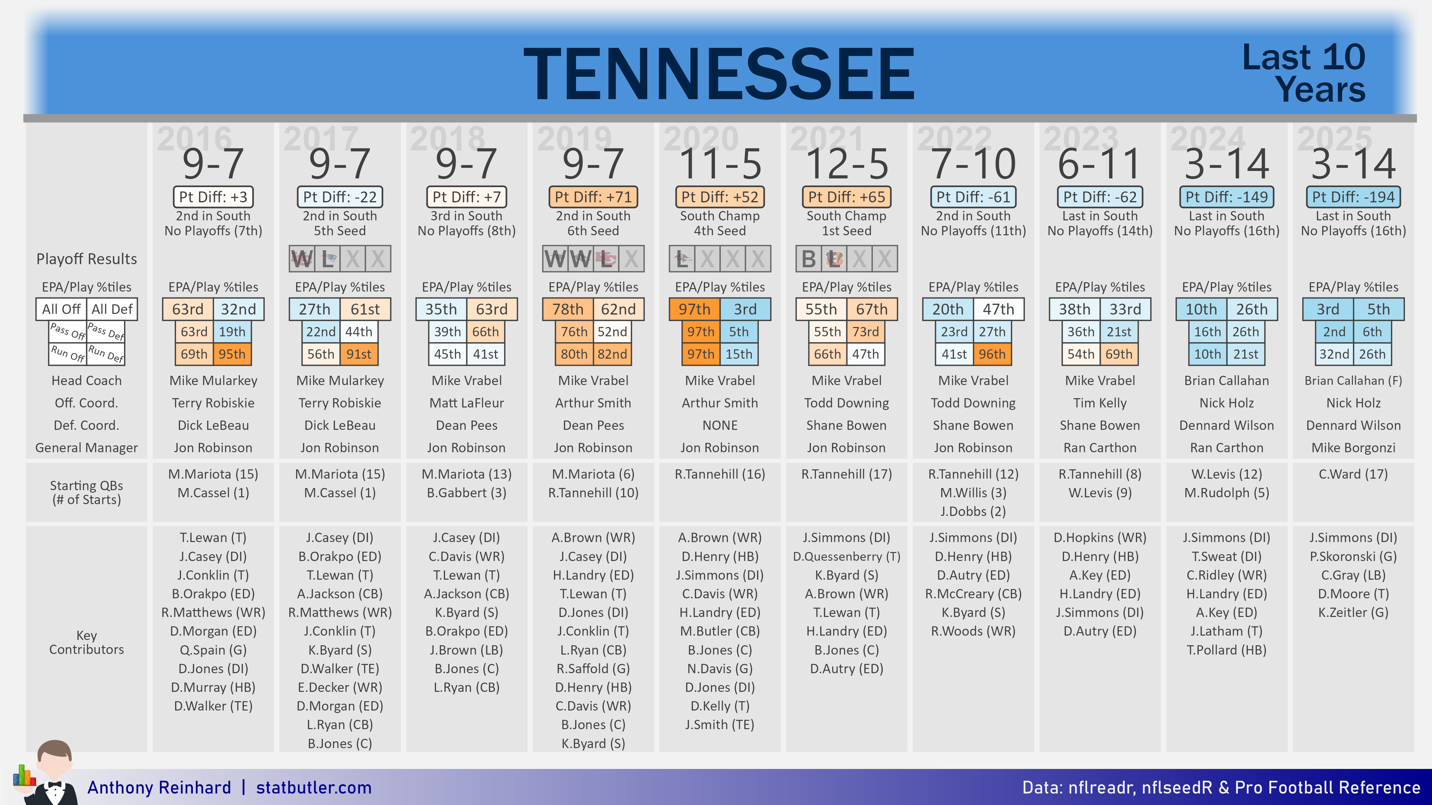 These six non-QBs cost $163m plus a net loss of draft capital. Once this offseason begins, I suspect Tennessee may be down to just one or two of these players, if any. This is a rare series of misses, but it has clearly been a driving force for this team’s struggles.