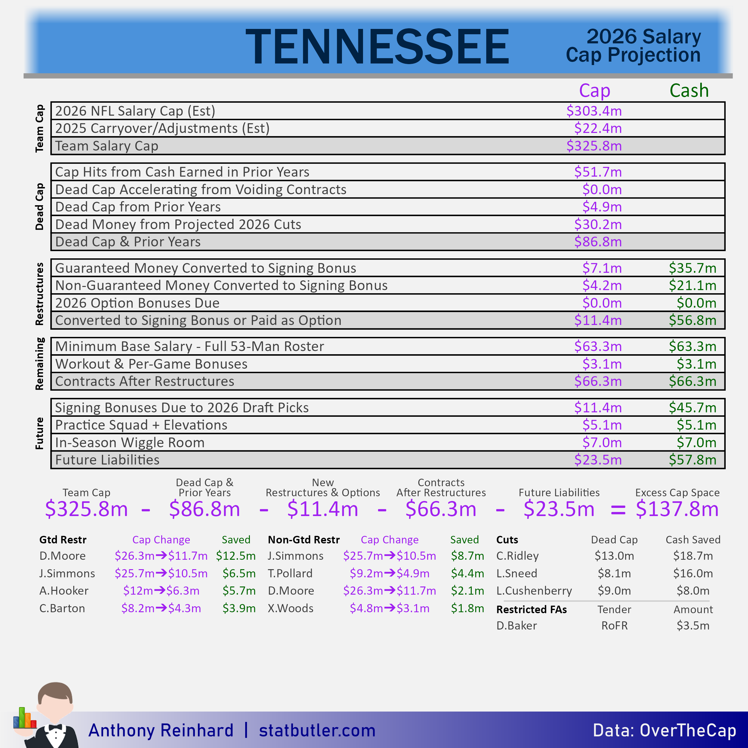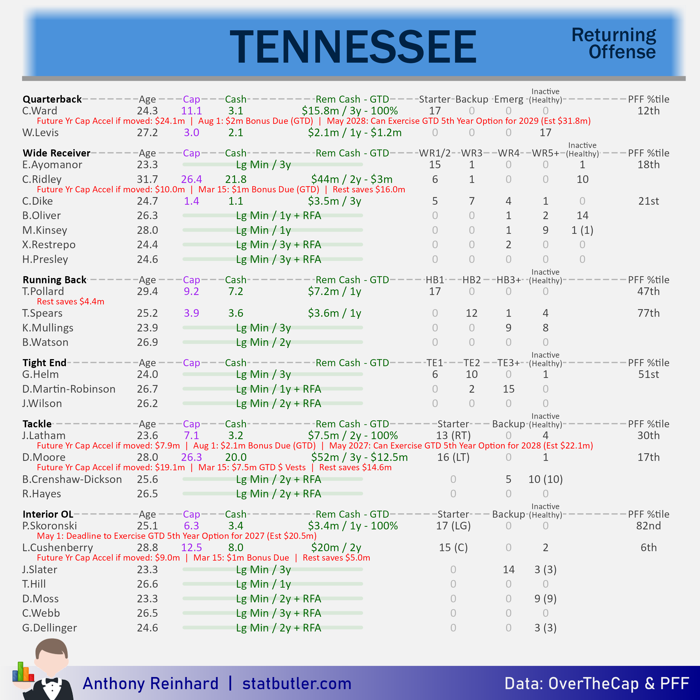 Aside from cuts, I’m thinking CB Darrell Baker is in line for the Right of First Refusal RFA tender. I am estimating that Tennessee can pick up Peter Skoronski’s 5th year option in 2027 at a cost of $20.5m. The number is calculated on all offensive linemen, so it’s a little heavy for a guard, but I think Tennessee will take it. It’s a situation where they’re in no condition to turn down extra years of team control at market price.