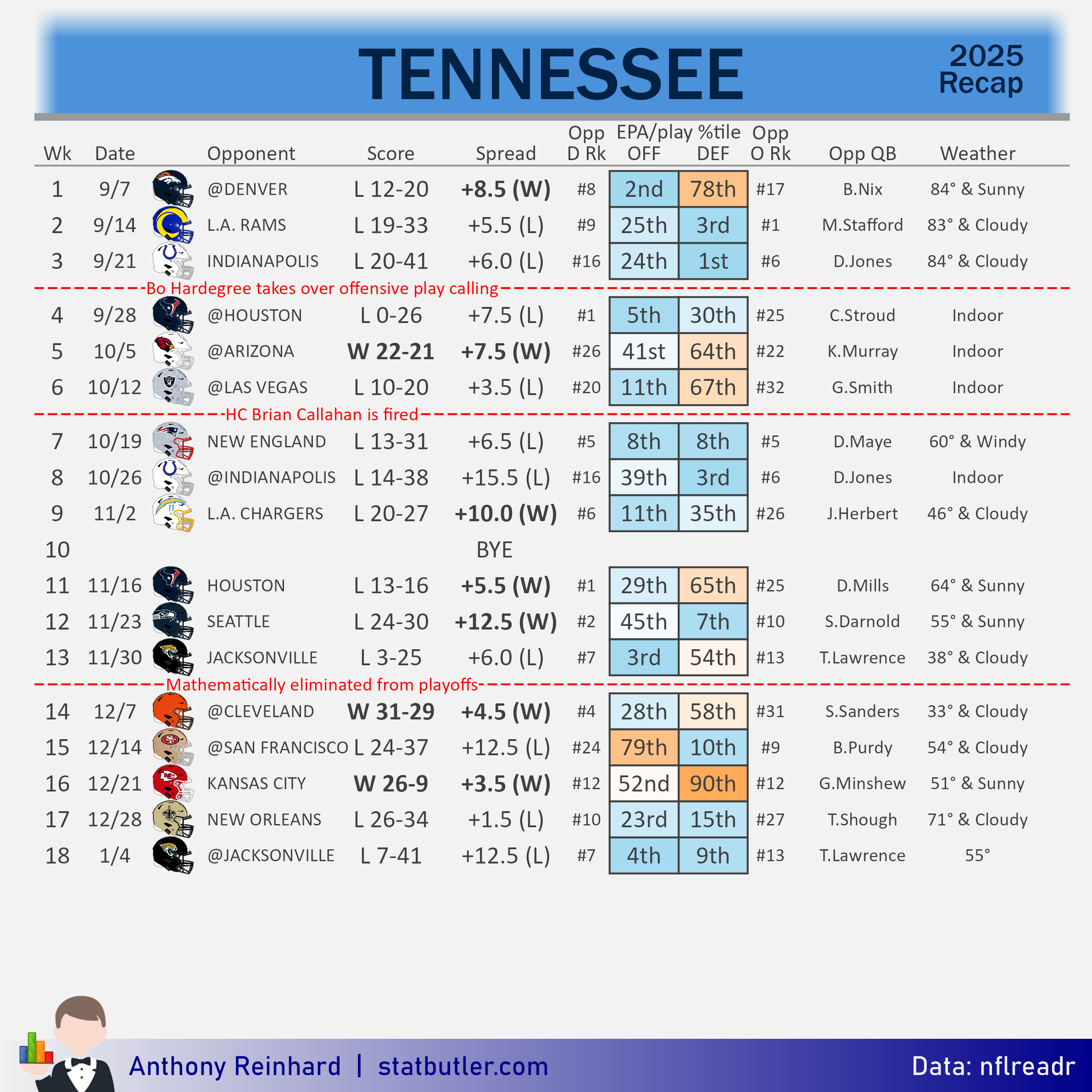 The Titans completed their 2025 season with their second consecutive three win season. I thought there was some chance they’d turn things over quickly if Cam Ward was a superstar right out of the gate, but most were probably not surprised to see a repeat of 2024 given the overall state of the roster.