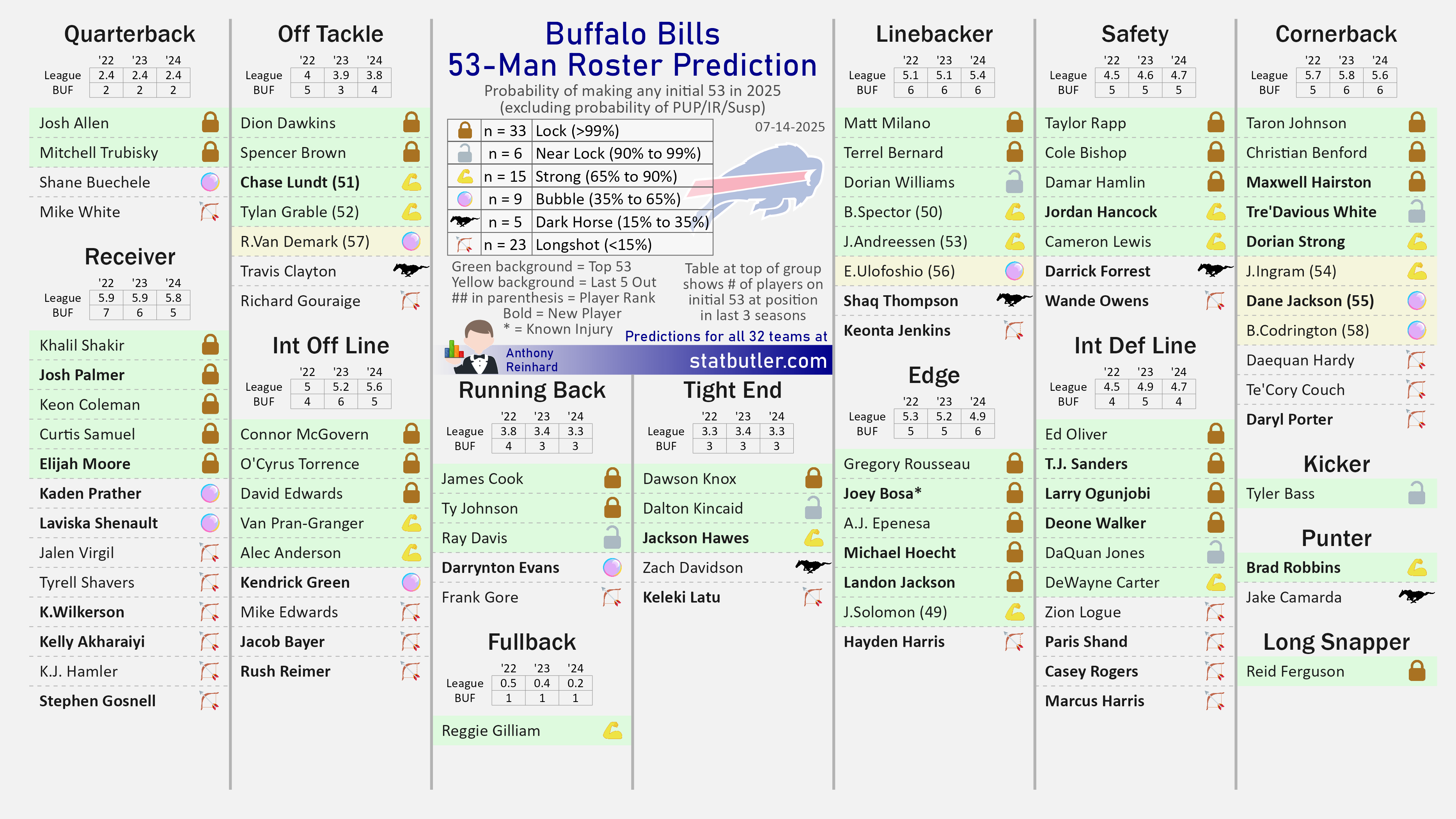 The Bills remain well positioned to take their sixth consecutive AFC title. Buffalo will be returning a league-leading 16 vested veteran players who are under contracts signed prior to March 2025. Adding to that strong foundation is the fact that the Bills 91-man roster features 18 players from the 2024 & 2025 draft. I’m expecting close to 15 of those players to make the 53.