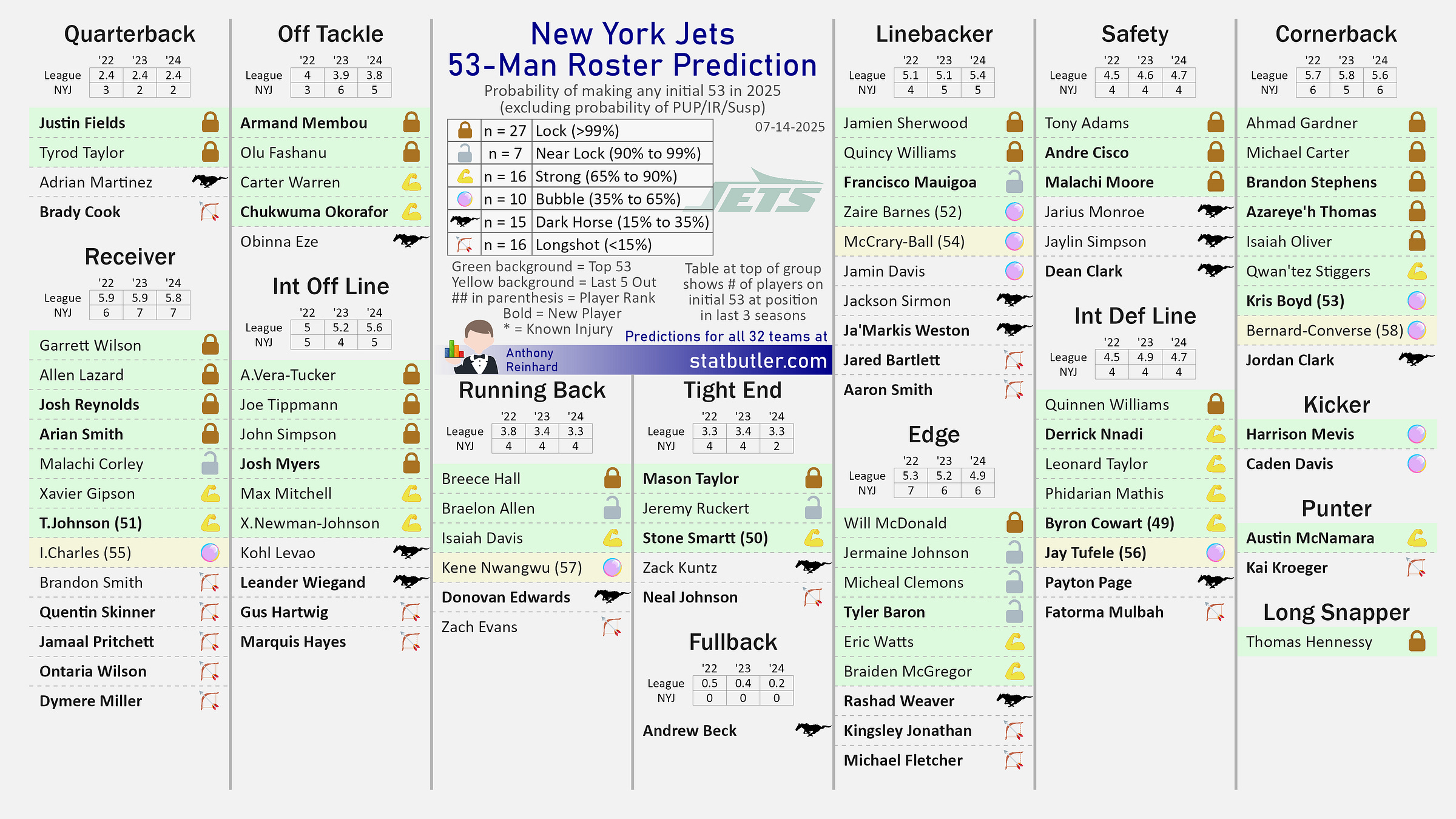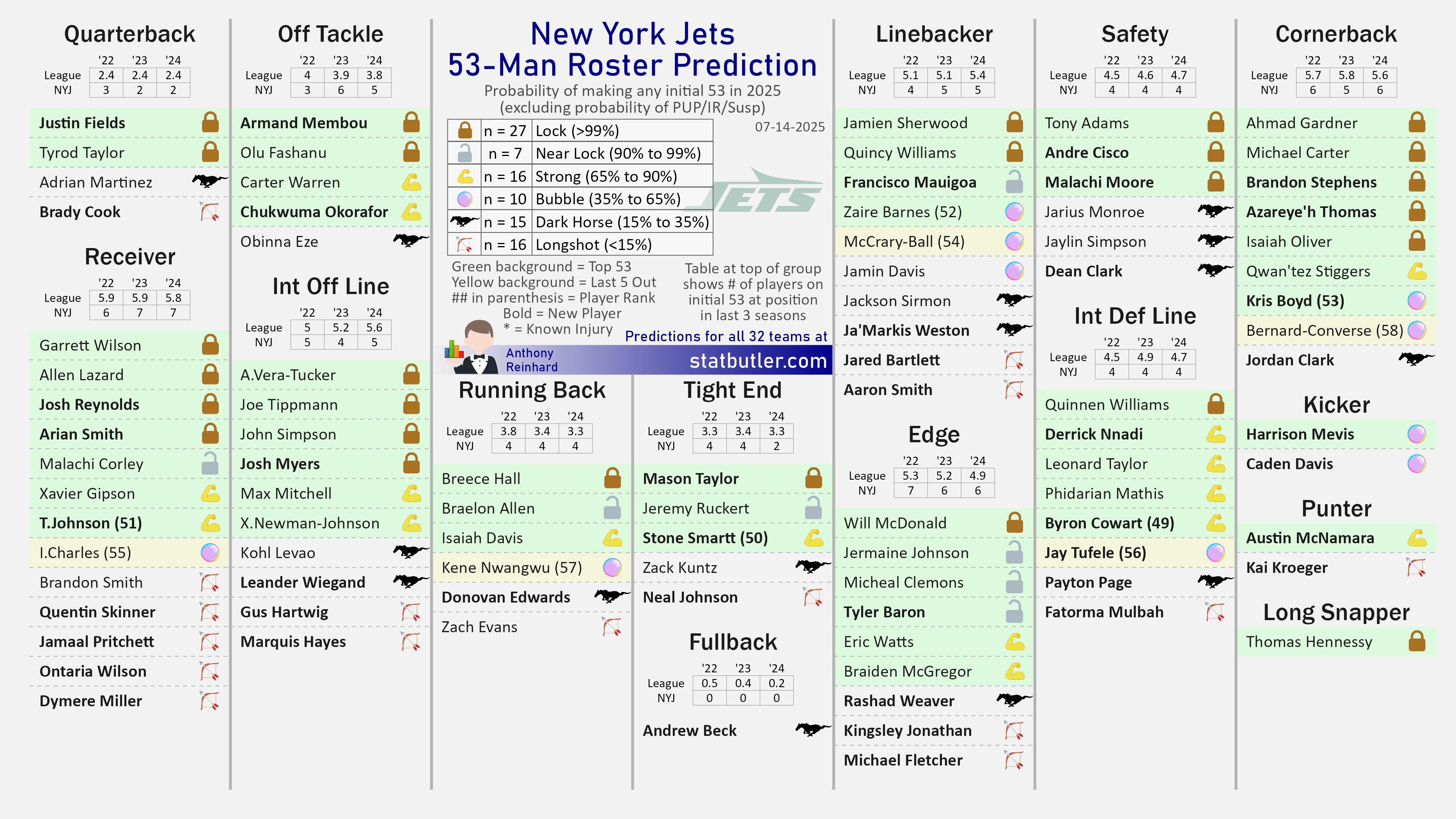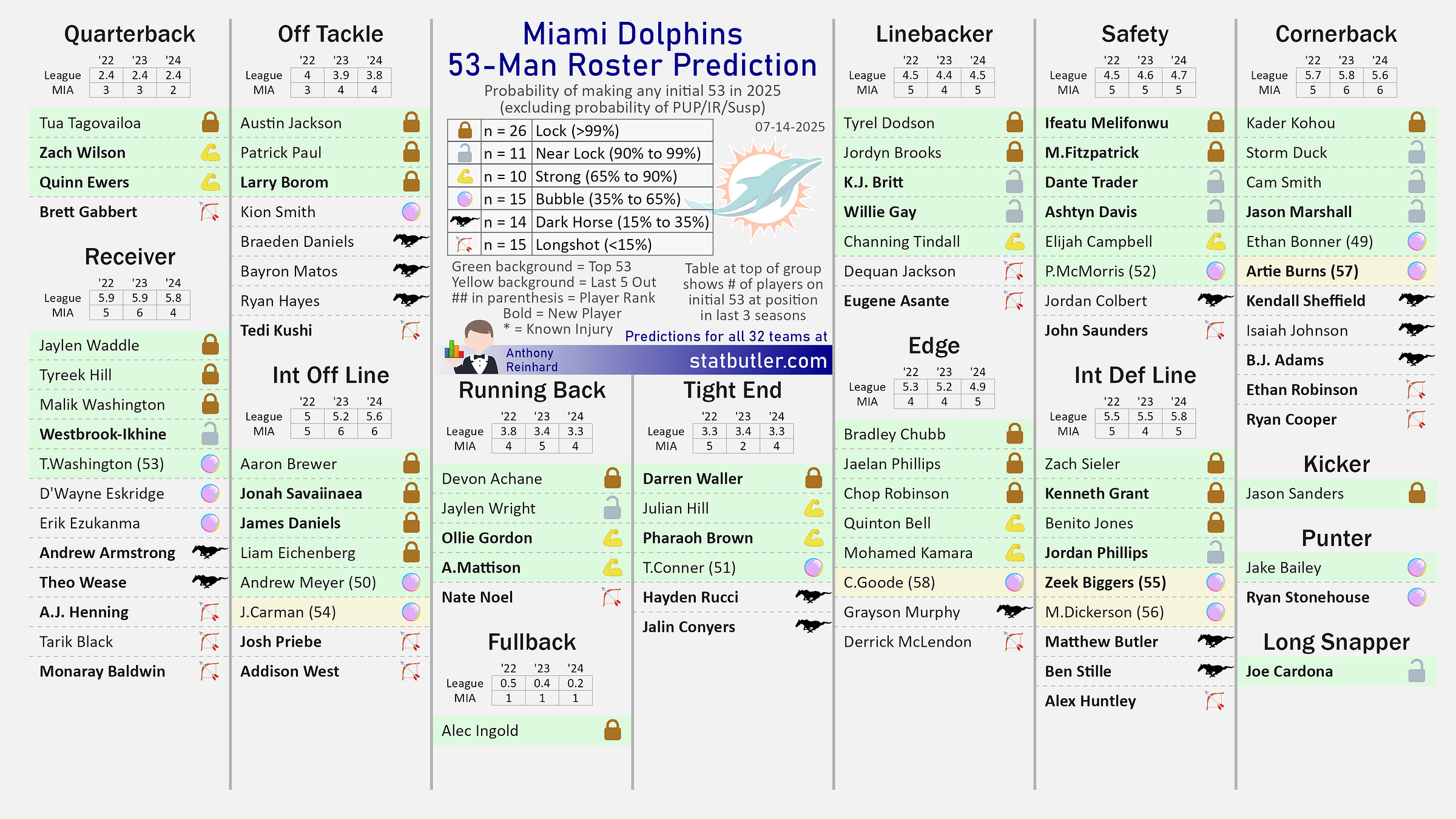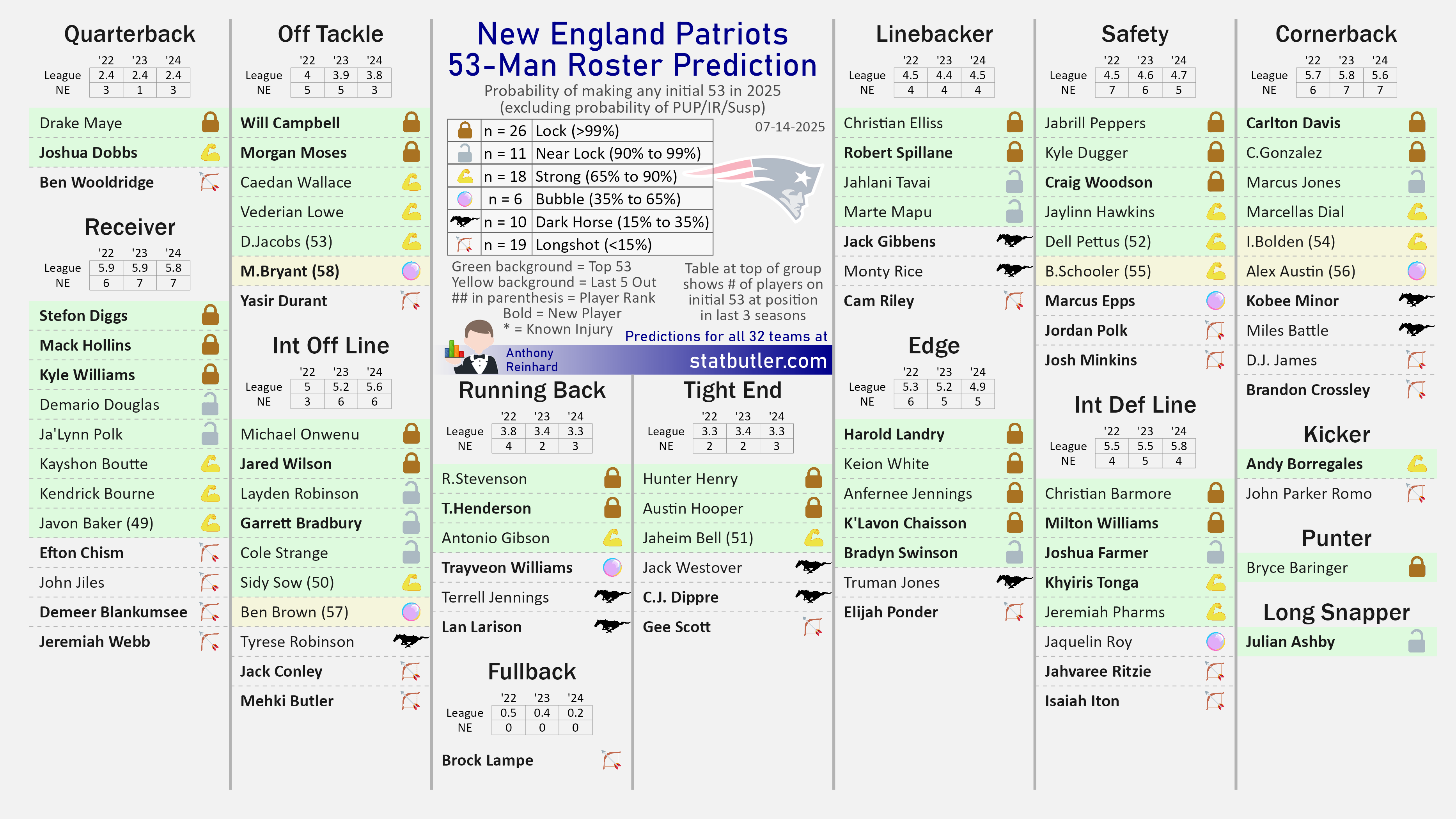 Below, you can find my 53-man roster projection for the AFC East. You’re welcome to share my graphics wherever you please, just so long as you tag my social account or direct them back here! You can even share the graphic below and mark it up with any disagreements you might have! More info on my process can be found here.