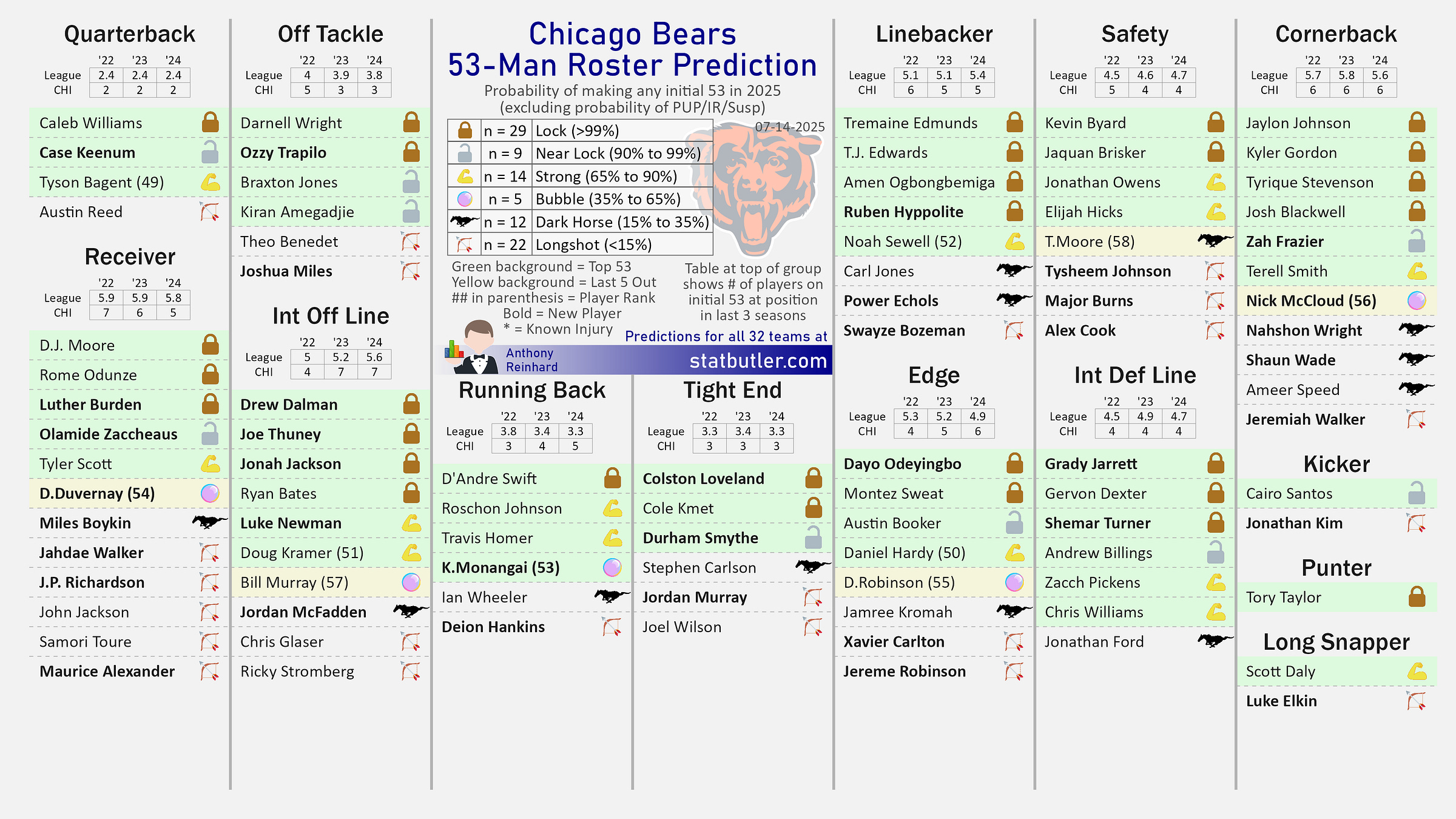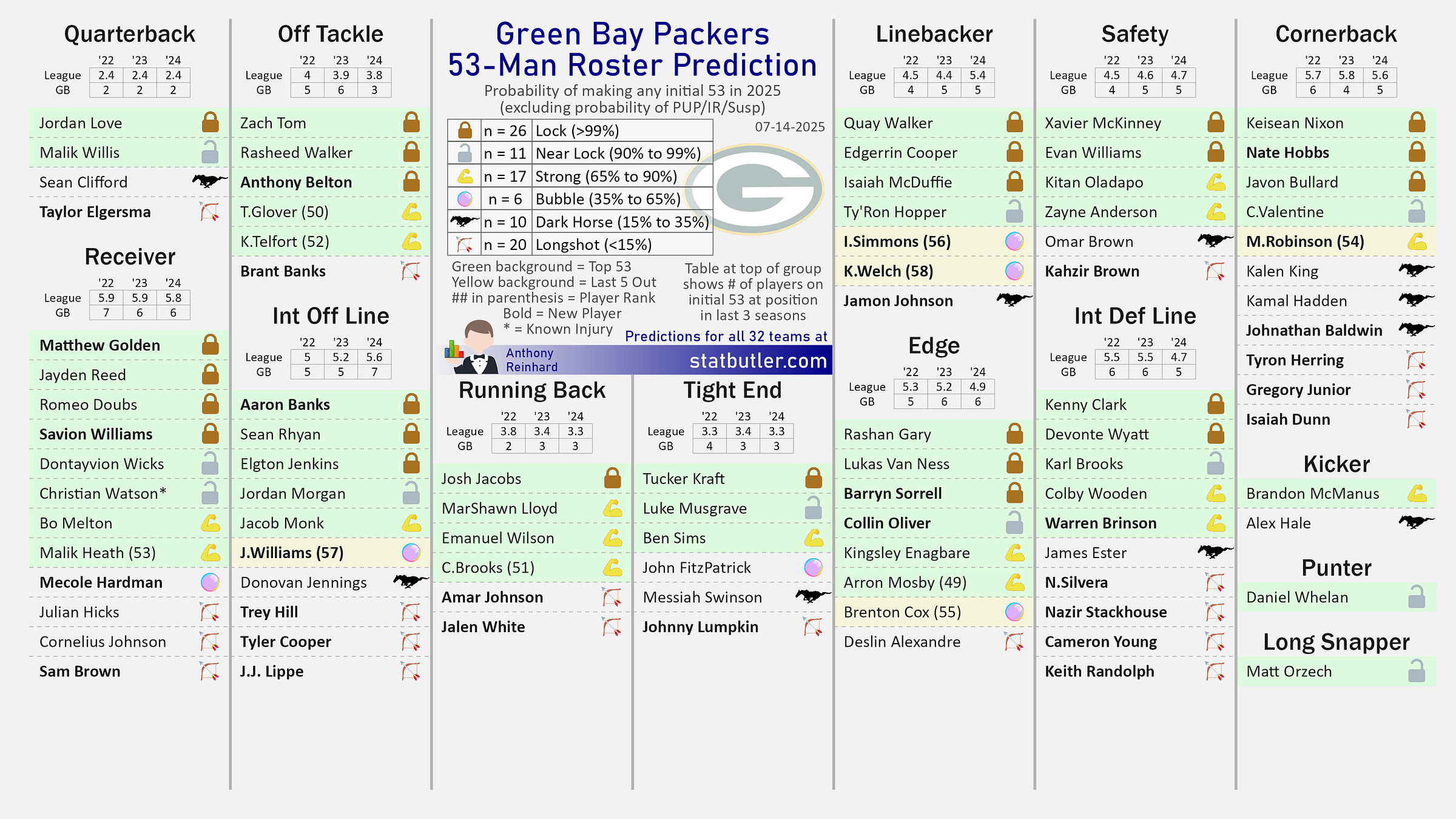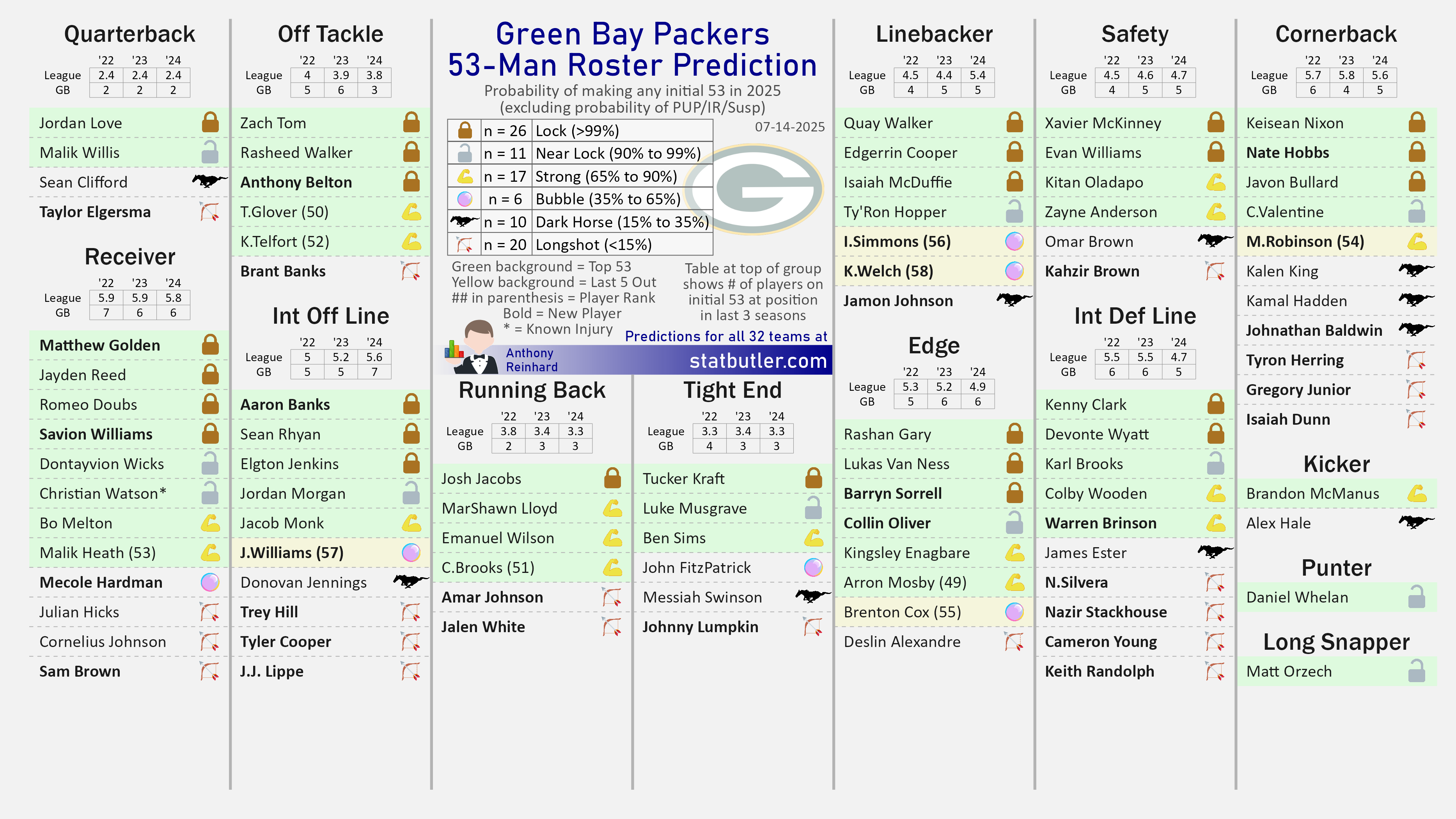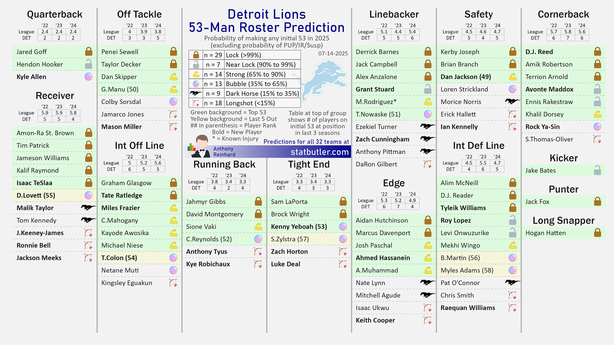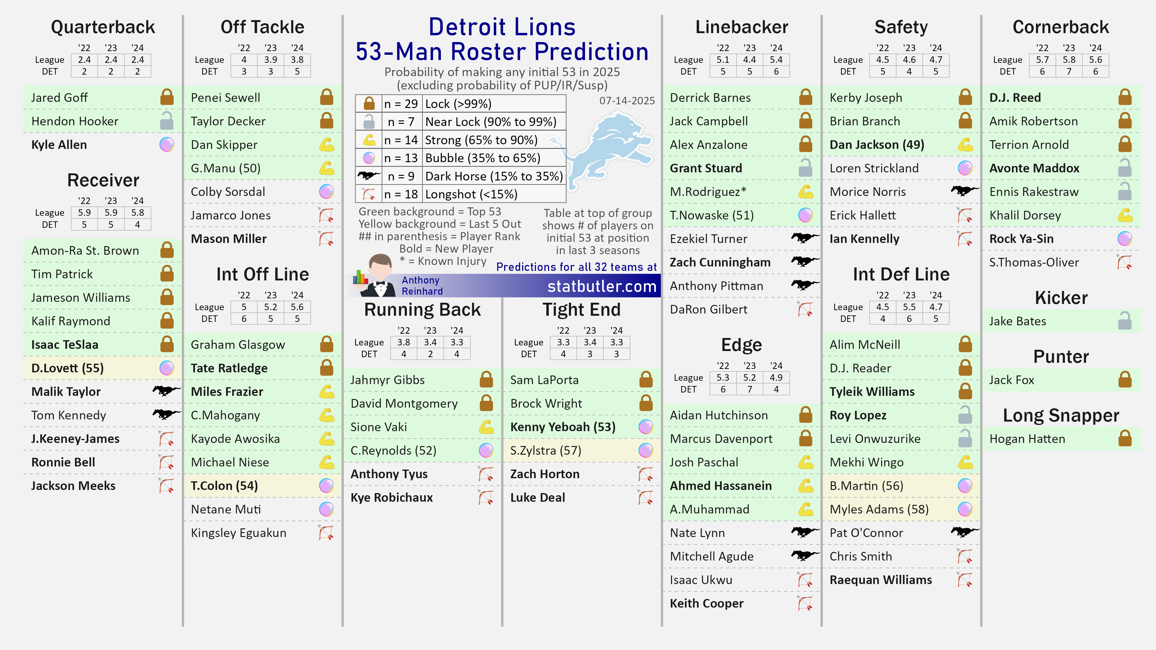 Below, you can find my 53-man roster projection for the NFC North. You’re welcome to share my graphics wherever you please, just so long as you tag my social account or direct them back here! You can even share the graphic below and mark it up with any disagreements you might have! More info on my process can be found here.