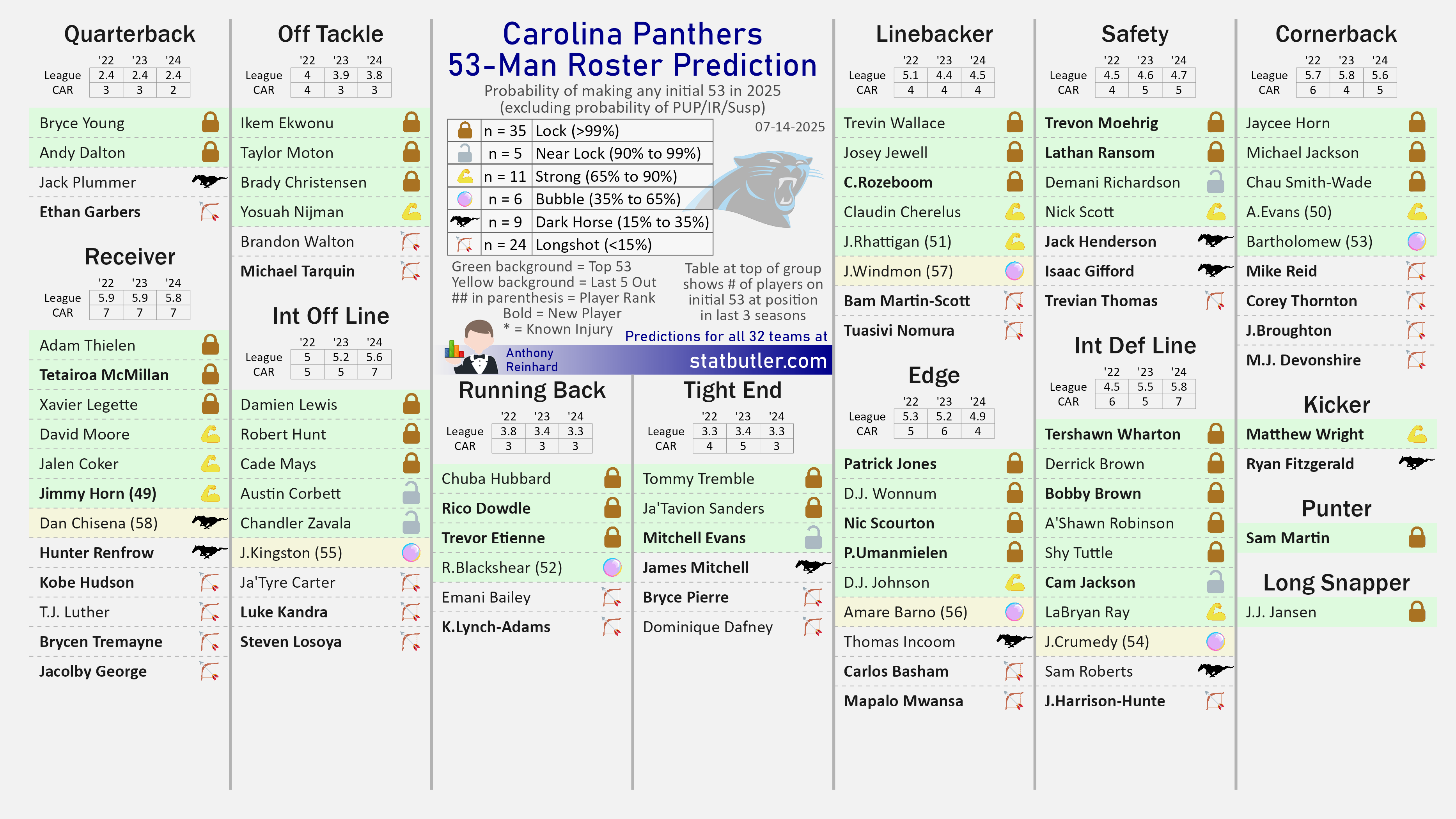 My model has Carolina with a league-high 35 roster locks. Even with a strong UDFA class, I would expect to see fewer interesting positional battles here than we’re seeing with other teams. The Panthers emphasized reloading their defensive line with a pair of day 2 draft picks and a couple free agents. The Panthers didn’t make any changes on the offensive line during the offseason. It is possible they’ll look to add a little depth in the secondary.