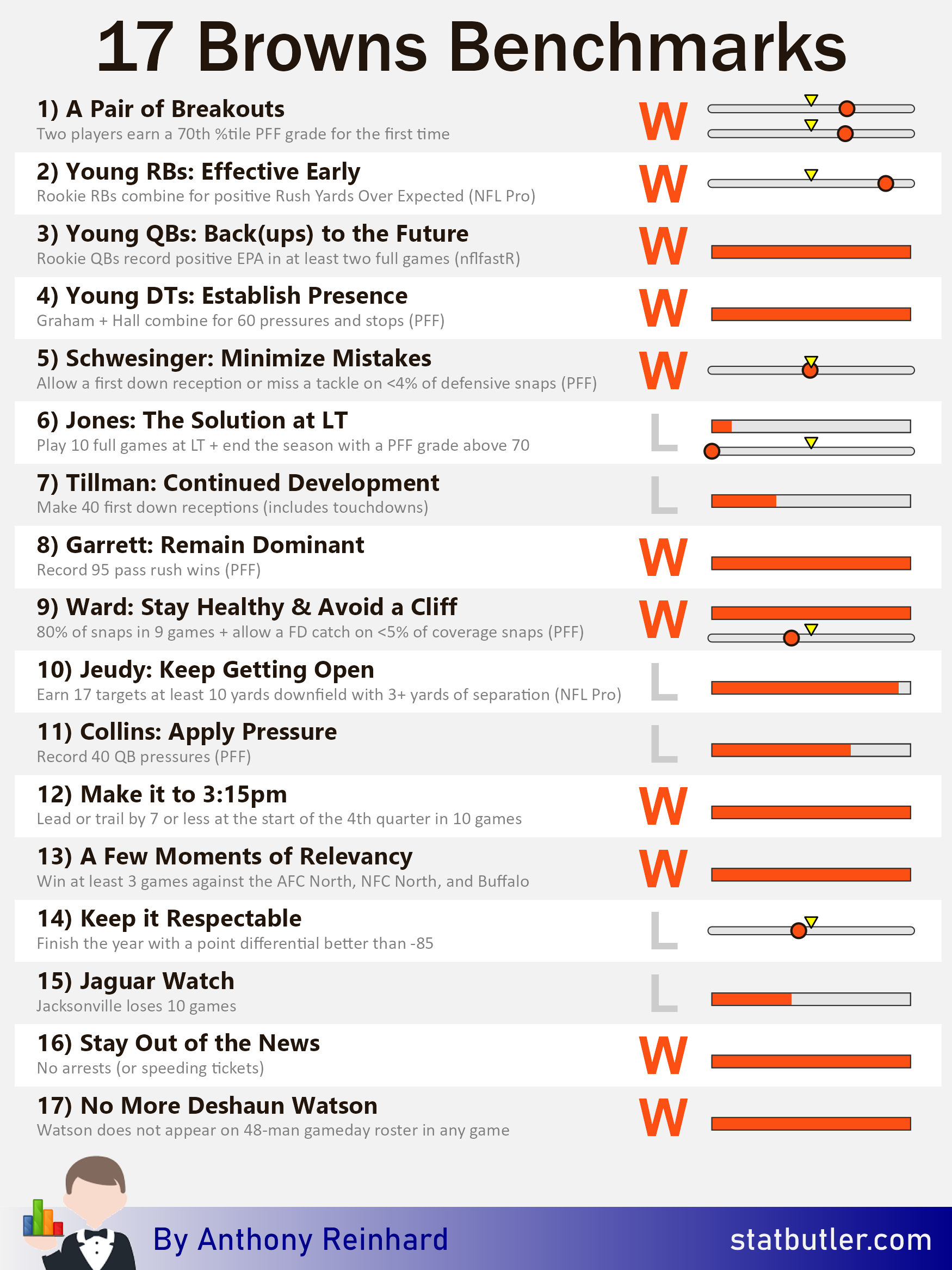 Overall, the win-loss record again my benchmarks is probably a little too rosy. The Browns hit 11 of their benchmarks and failed on 6. Like an actual game, some of these were outright wins, some were wins that felt like losses, one was a loss that felt like a win, and a couple were down right embarrassments.