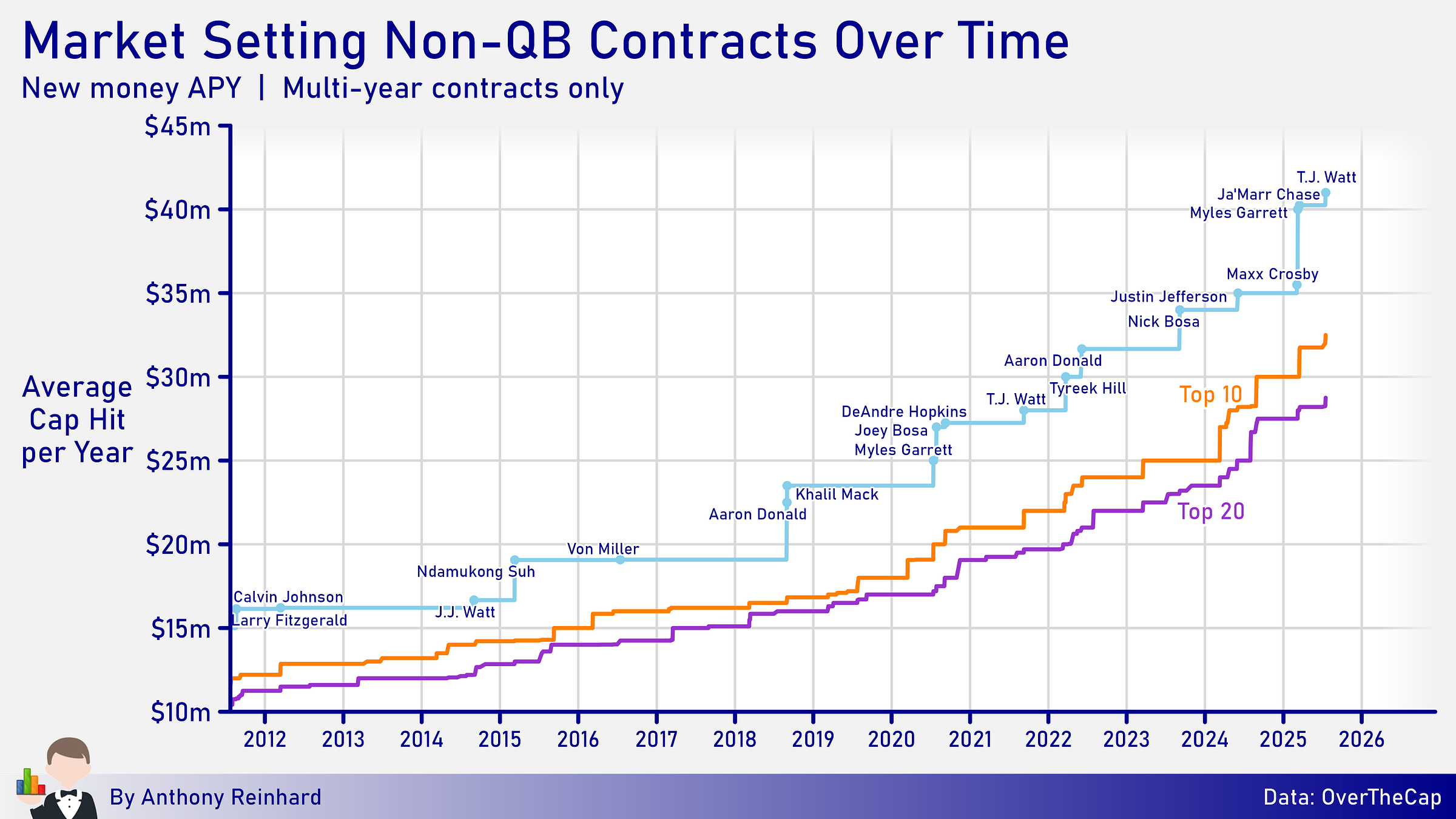 Below, you can see where the biggest non-QB contracts of all-time have stood at each point in time. Contract values are from OverTheCap.