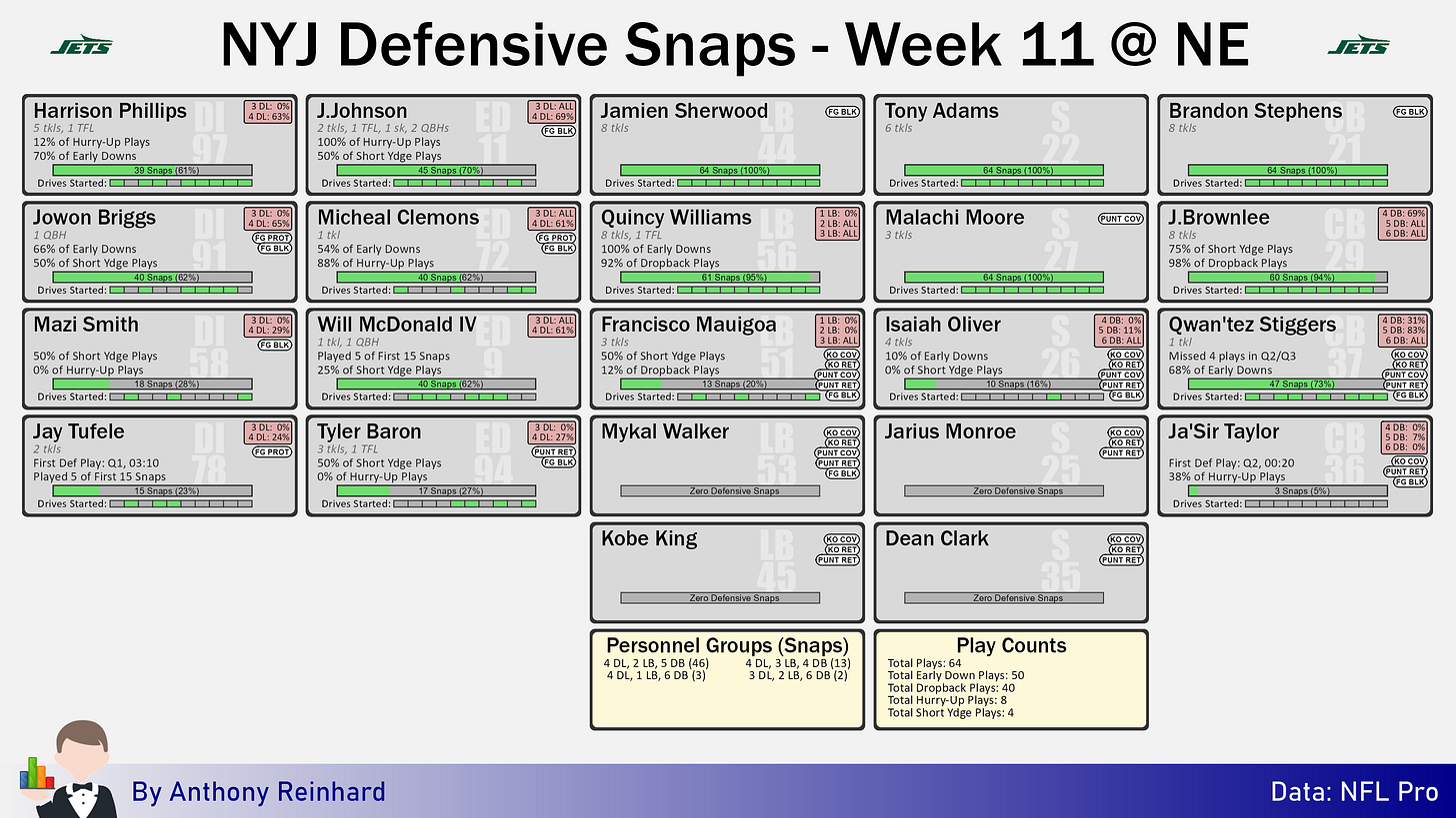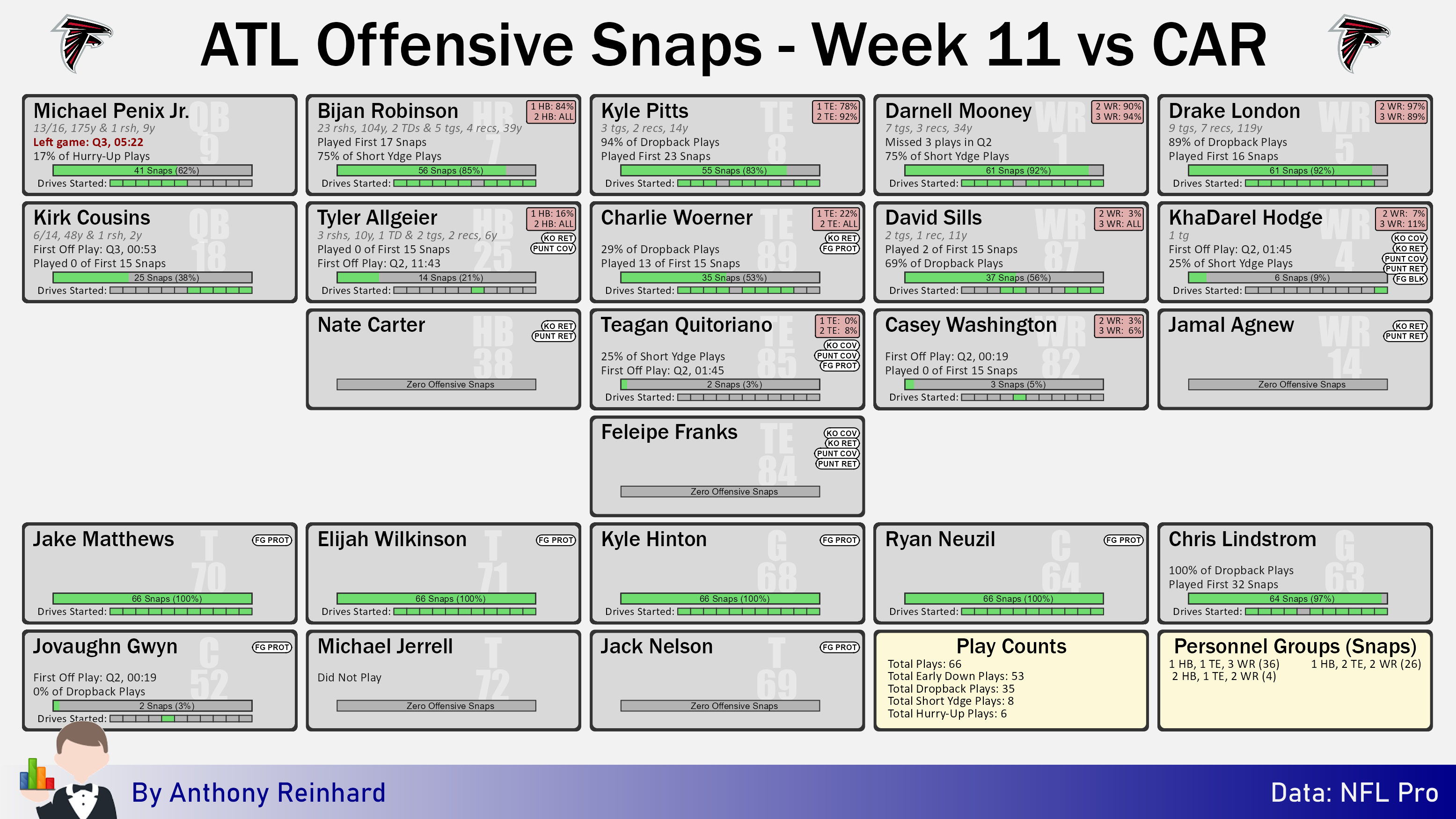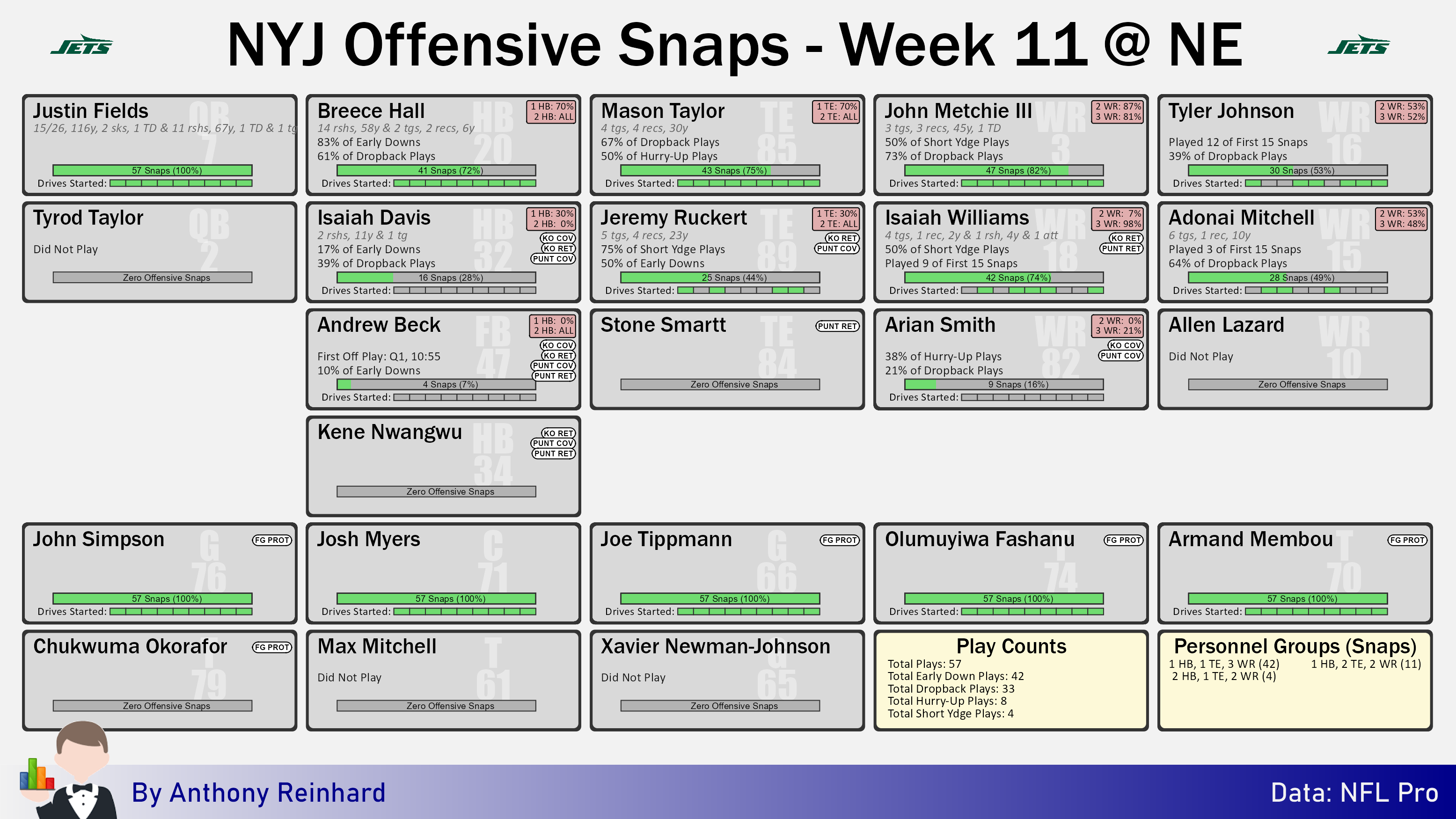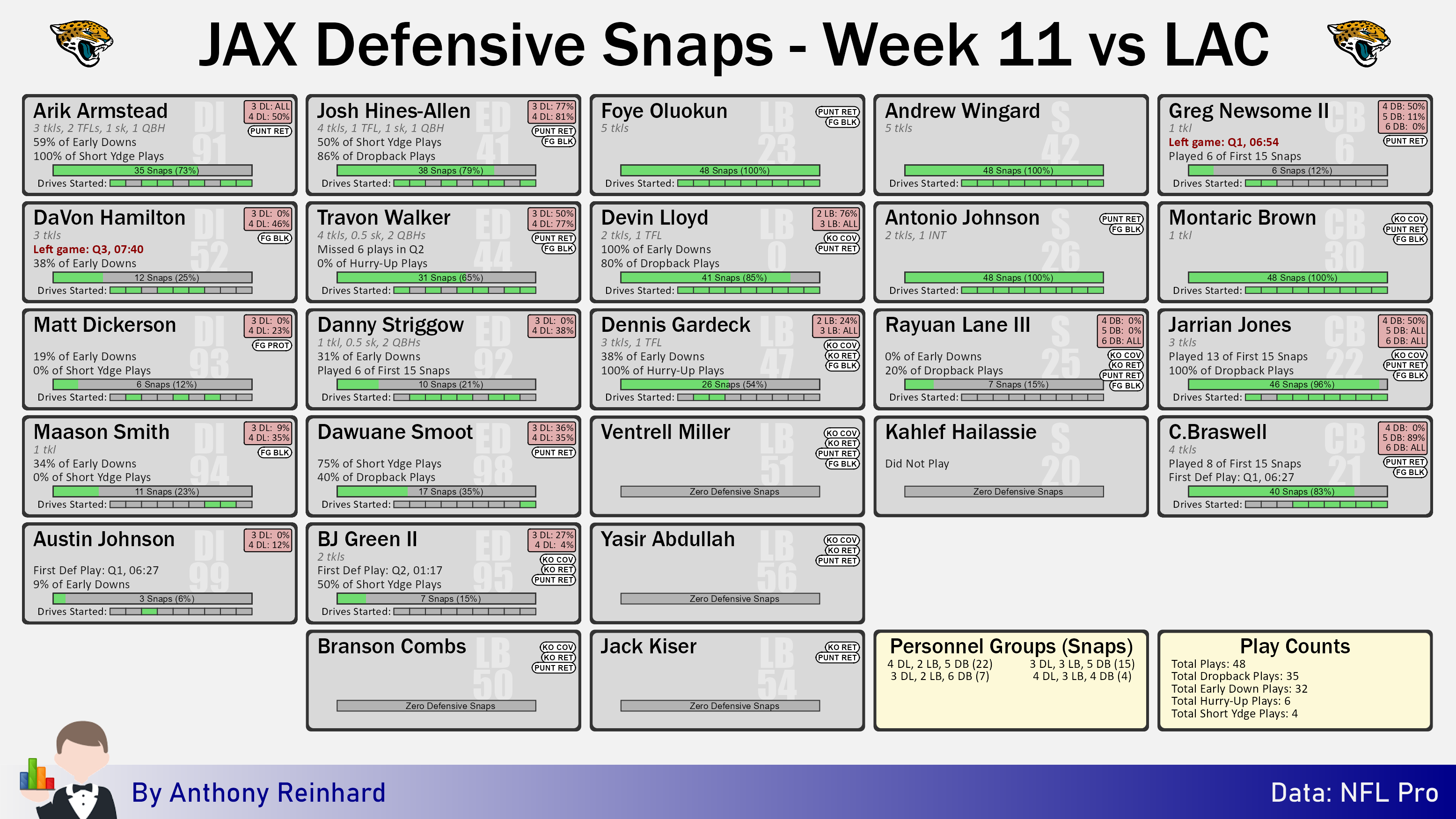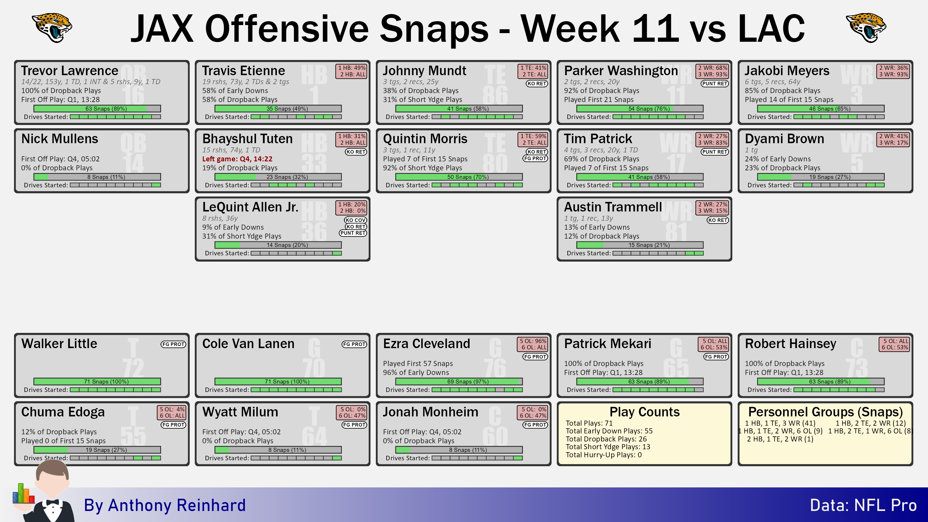 Snap Counts: Week 11Snap Count graphs for each team in Week 11Anthony ReinhardNov 17, 2025ShareNYJ-NEWAS-MIACAR-ATLTB-BUFLAC-JAXCHI-MINGB-NYGCIN-PITHOU-TENSF-ARISEA-LABAL-CLEKC-DENDET-PHIDAL-LVComing Soon!Thanks for reading!SubscribePrevious