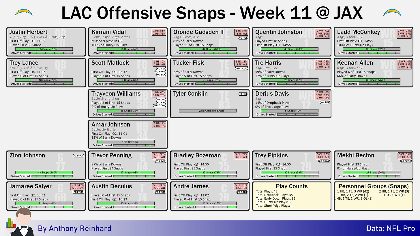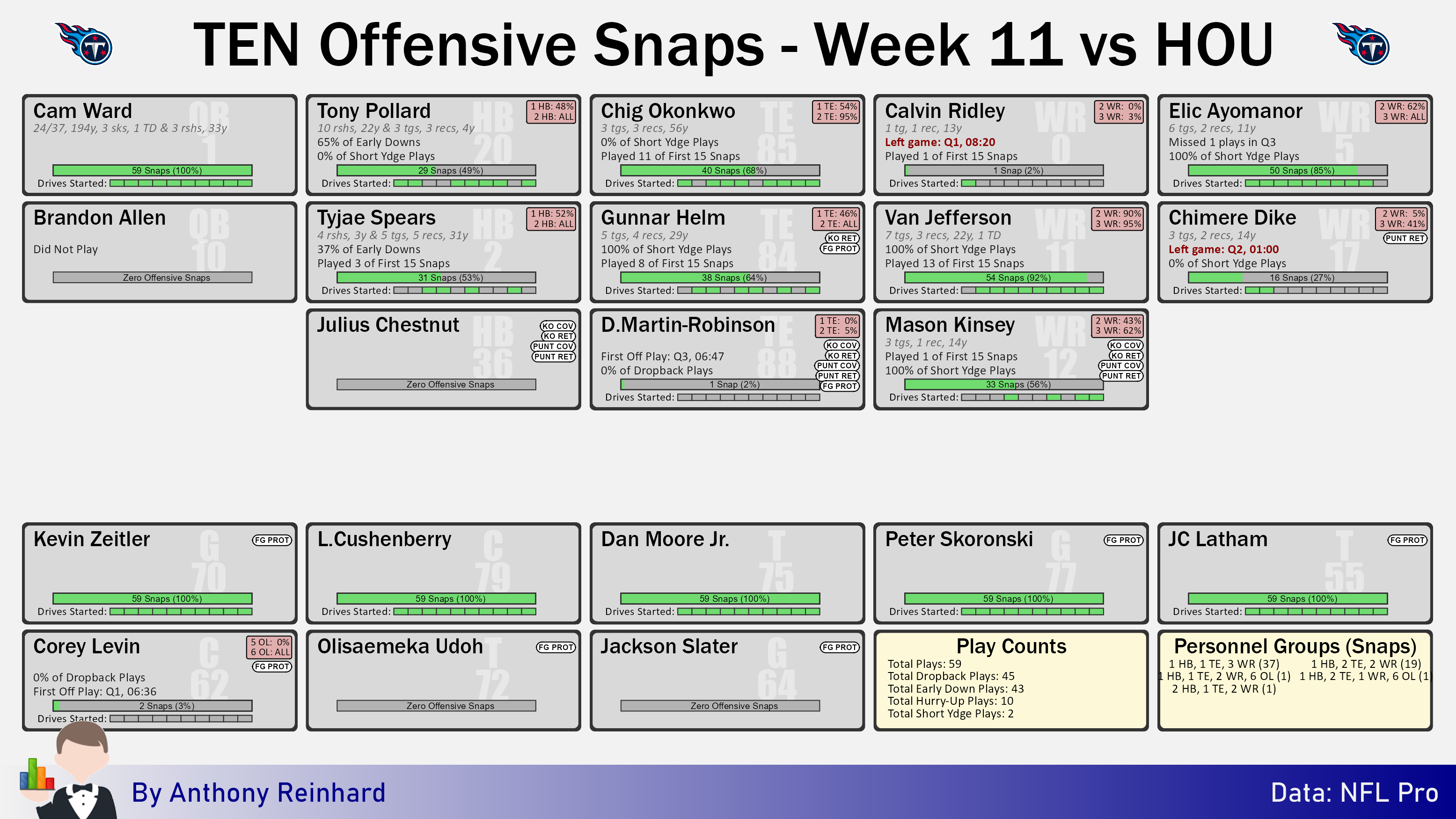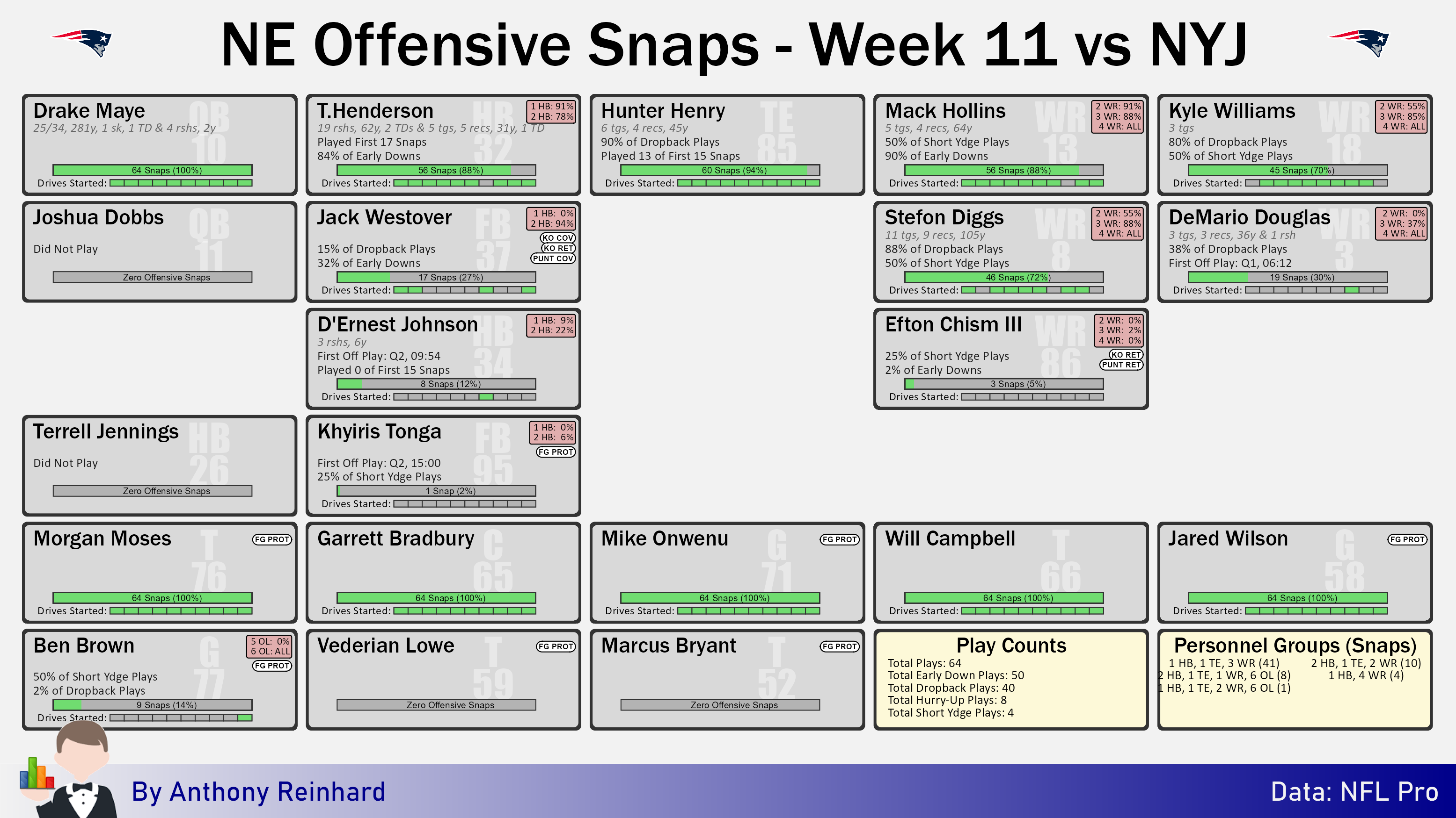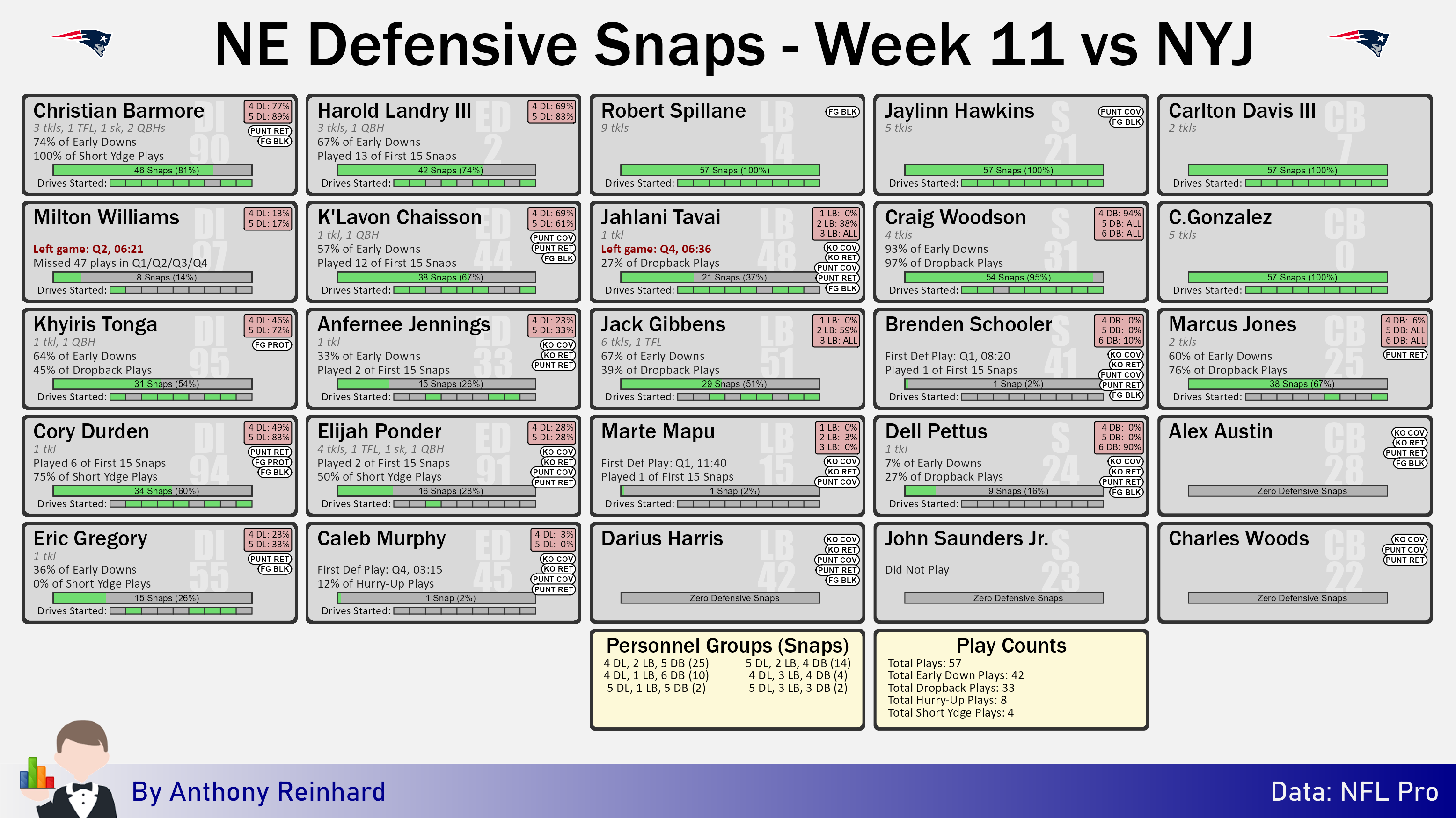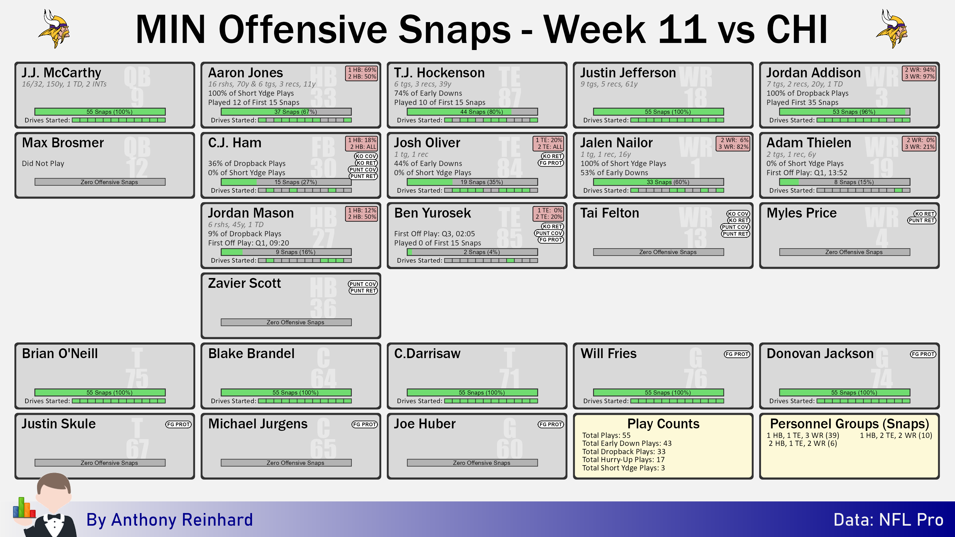 Snap Counts: Week 11Snap Count graphs for each team in Week 11Anthony ReinhardNov 17, 2025ShareNYJ-NEWAS-MIACAR-ATLTB-BUFLAC-JAXCHI-MINGB-NYGCIN-PITHOU-TENSF-ARISEA-LABAL-CLEKC-DENDET-PHIDAL-LVComing Soon!Thanks for reading!SubscribePrevious