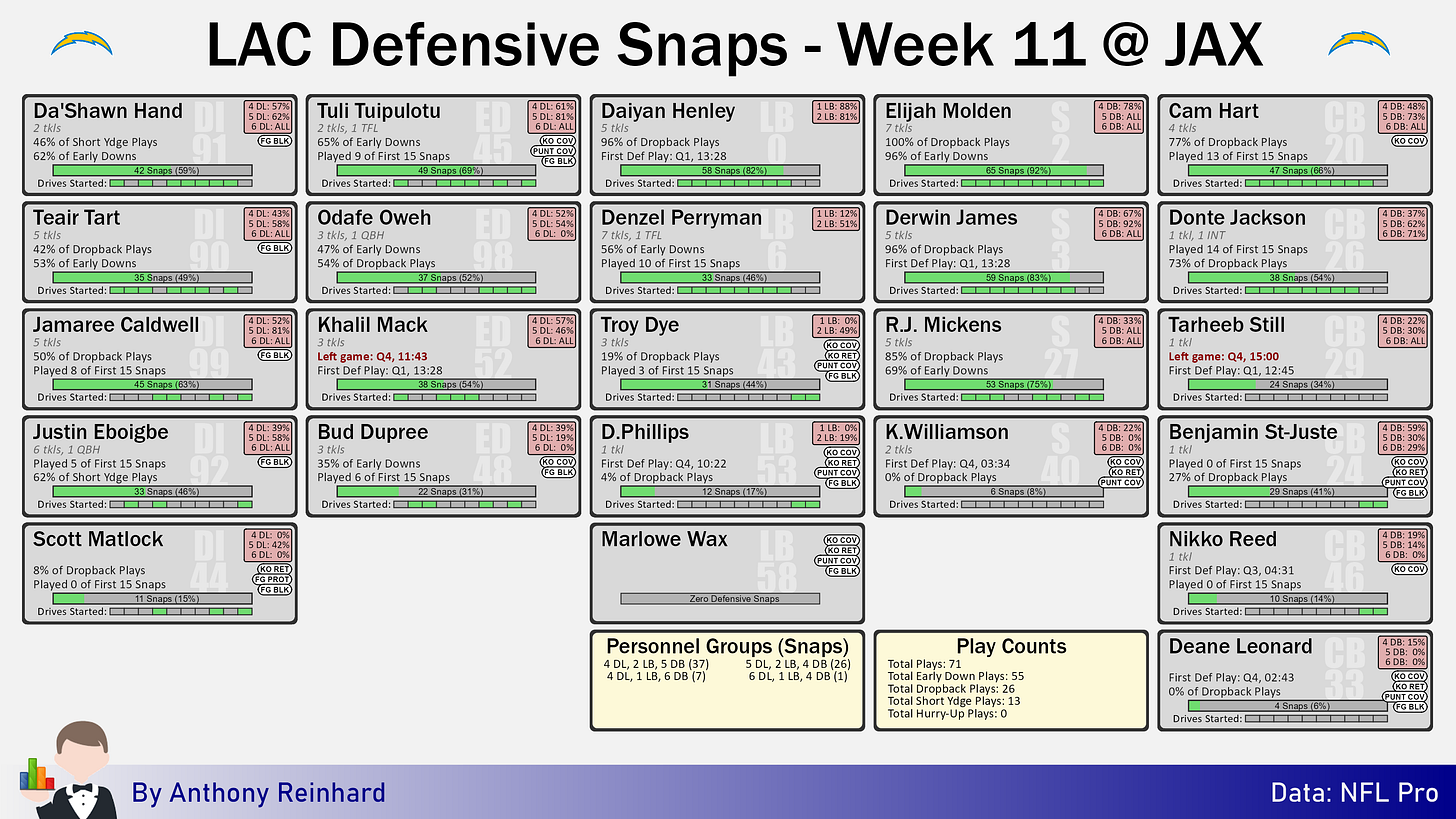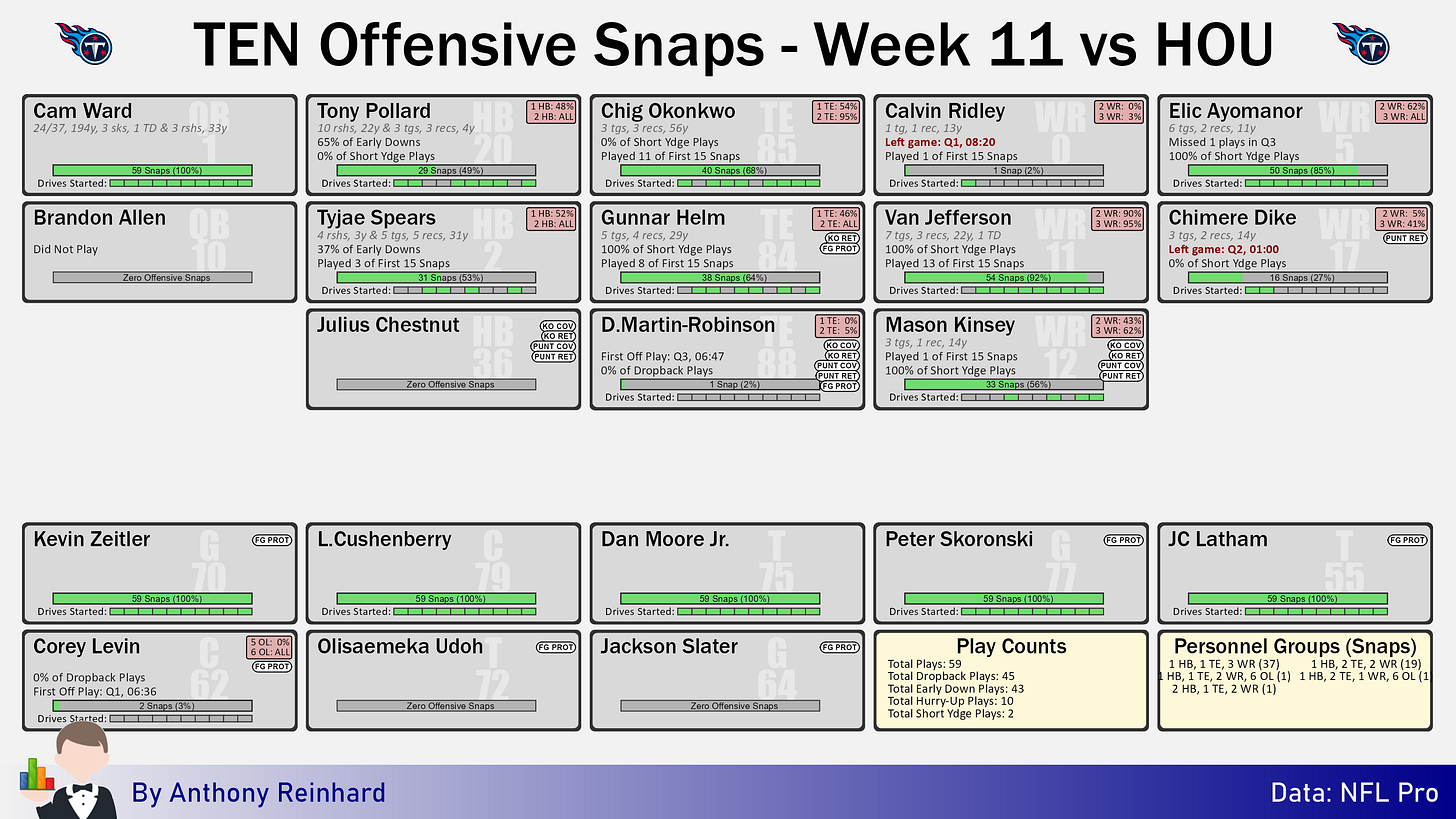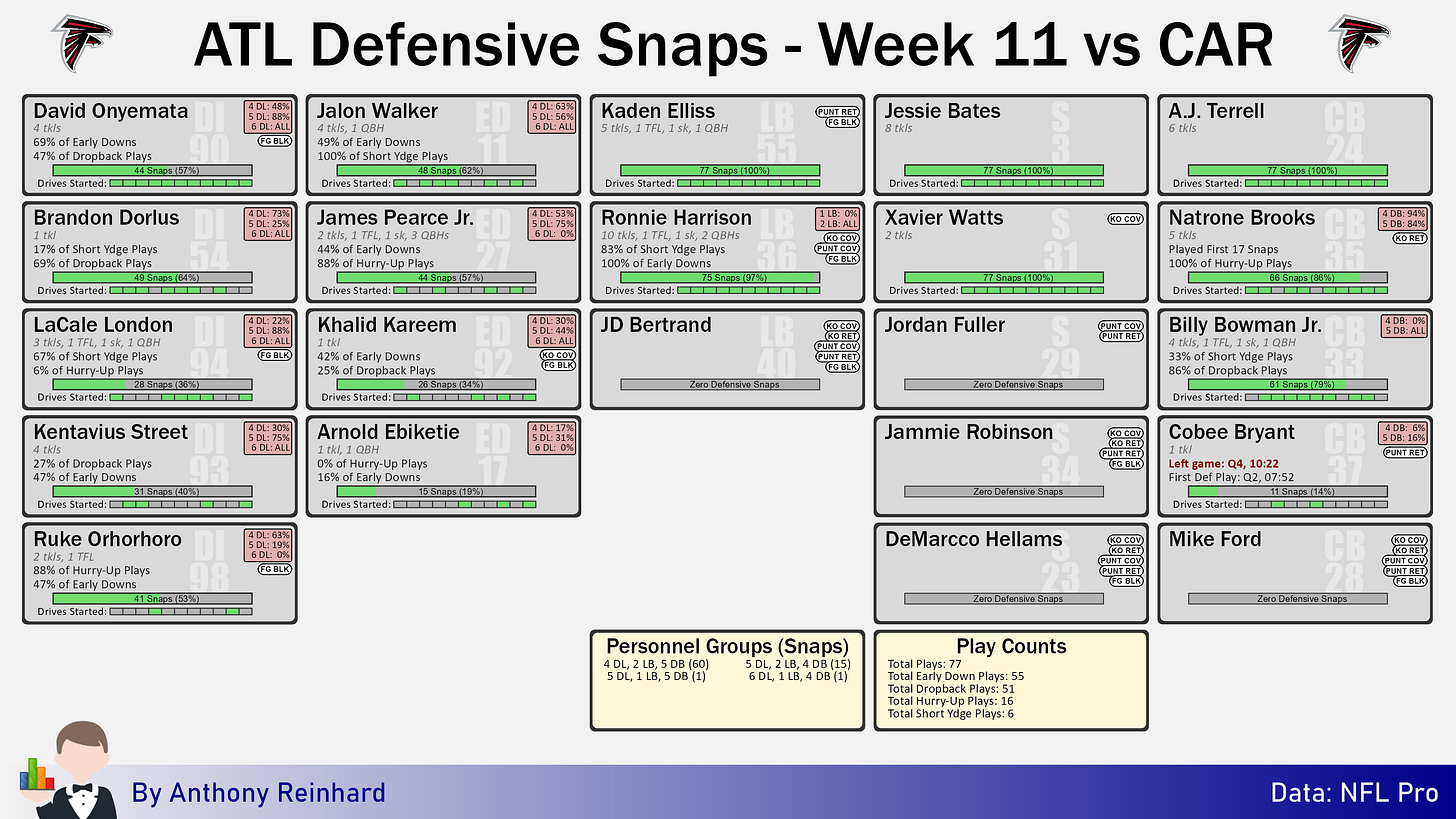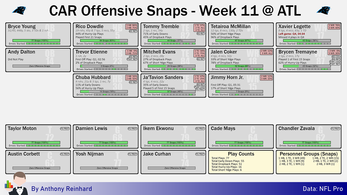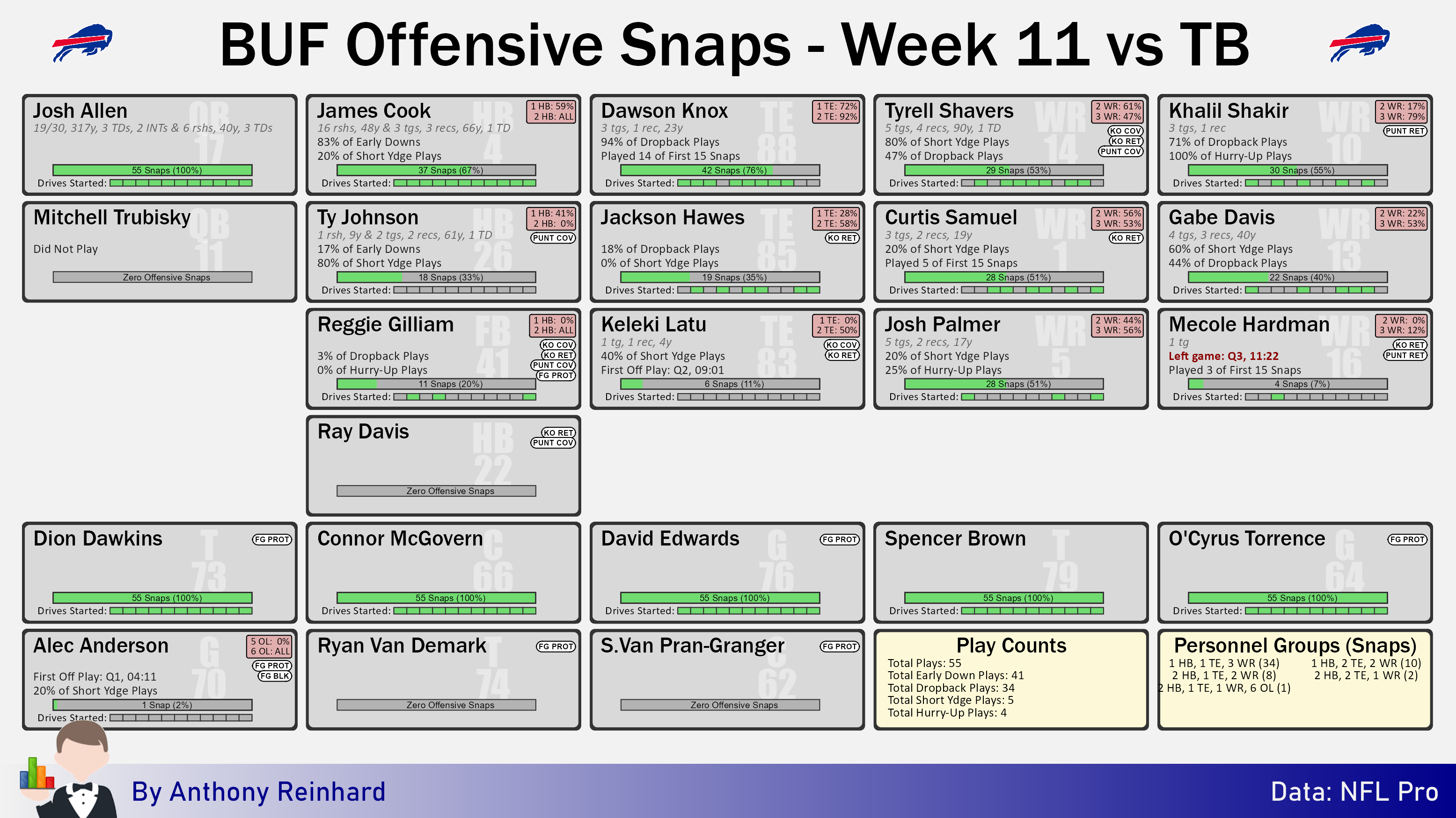 Snap Counts: Week 11Snap Count graphs for each team in Week 11Anthony ReinhardNov 17, 2025ShareNYJ-NEWAS-MIACAR-ATLTB-BUFLAC-JAXCHI-MINGB-NYGCIN-PITHOU-TENSF-ARISEA-LABAL-CLEKC-DENDET-PHIDAL-LVComing Soon!Thanks for reading!SubscribePrevious