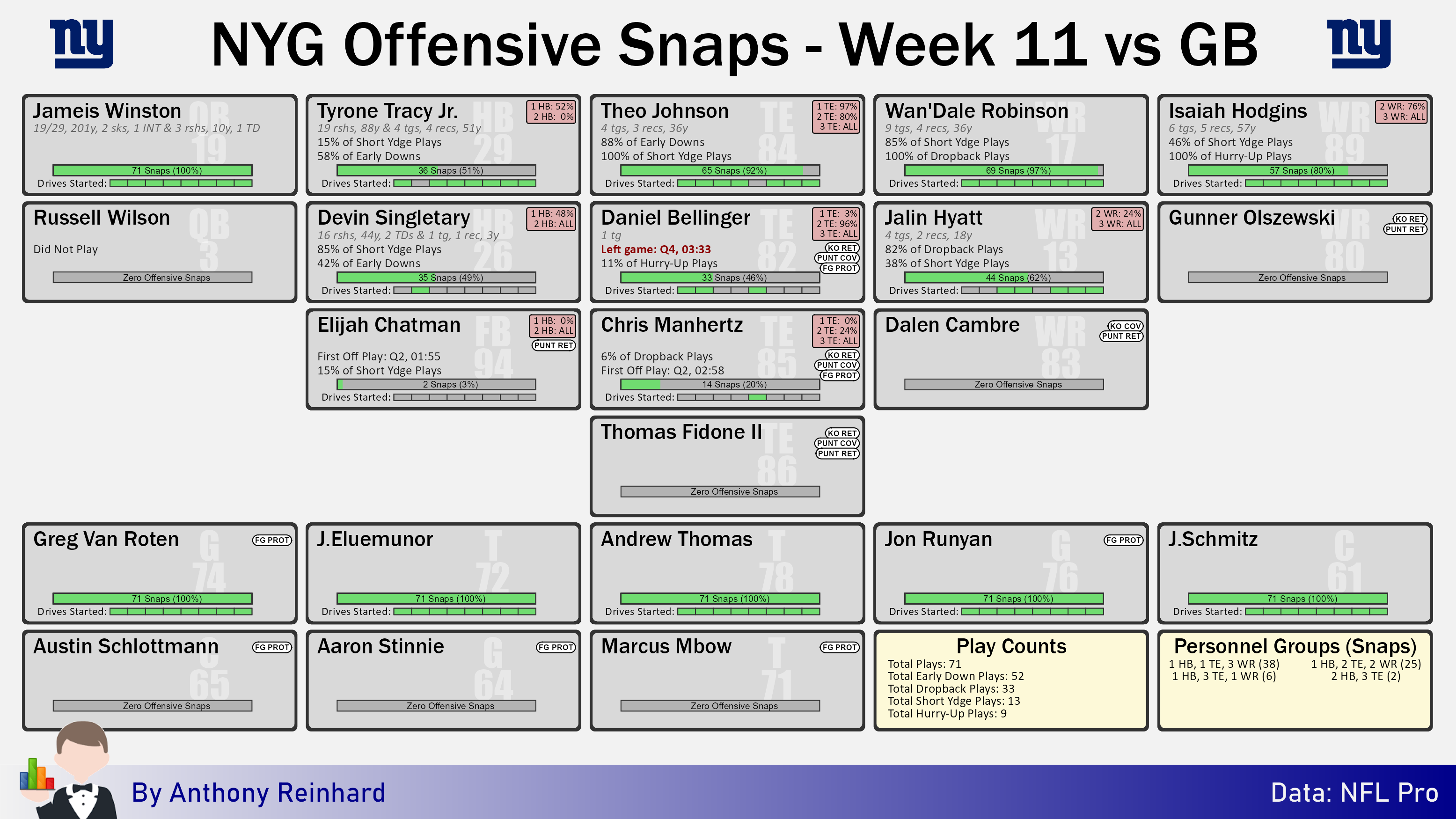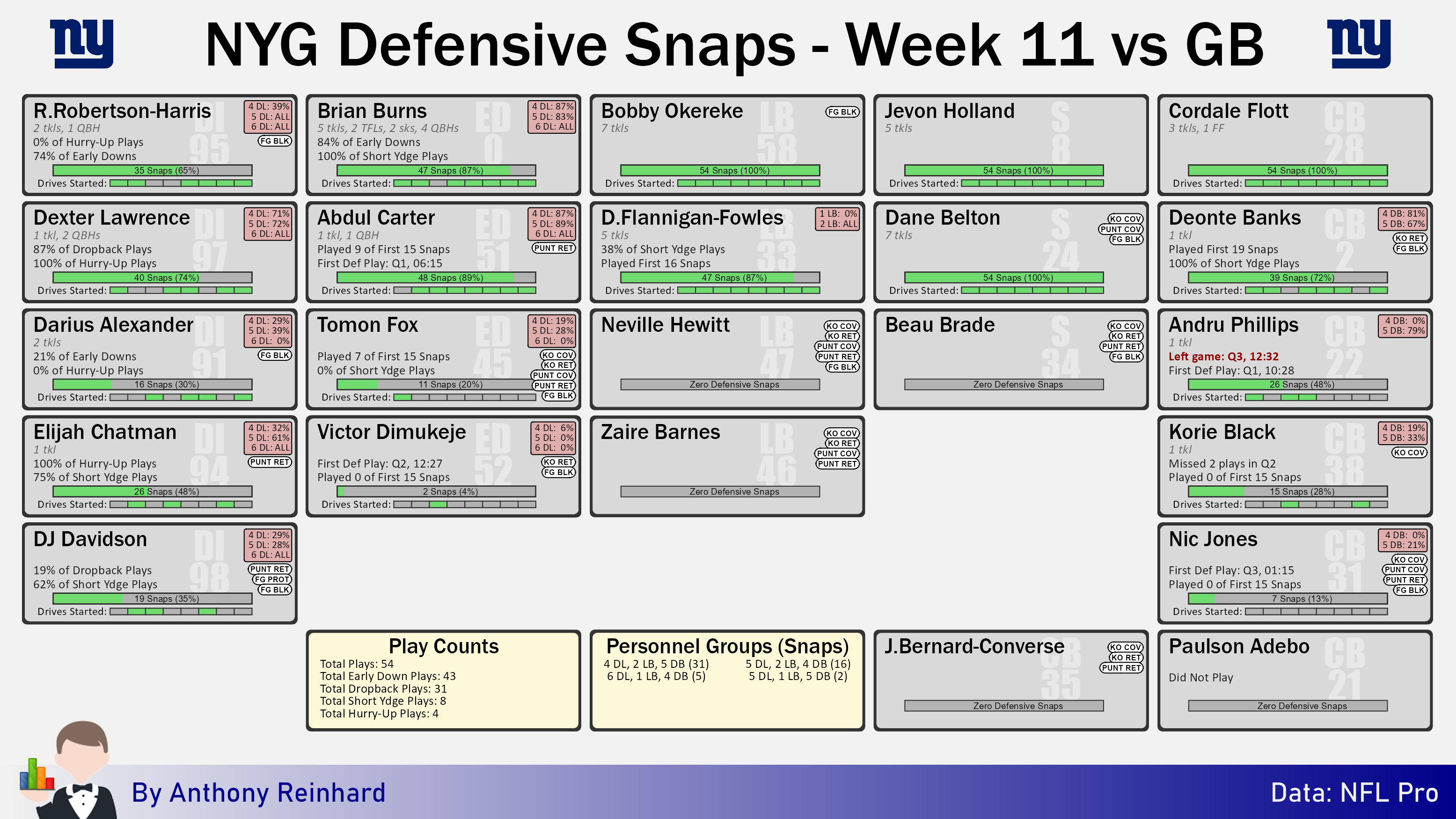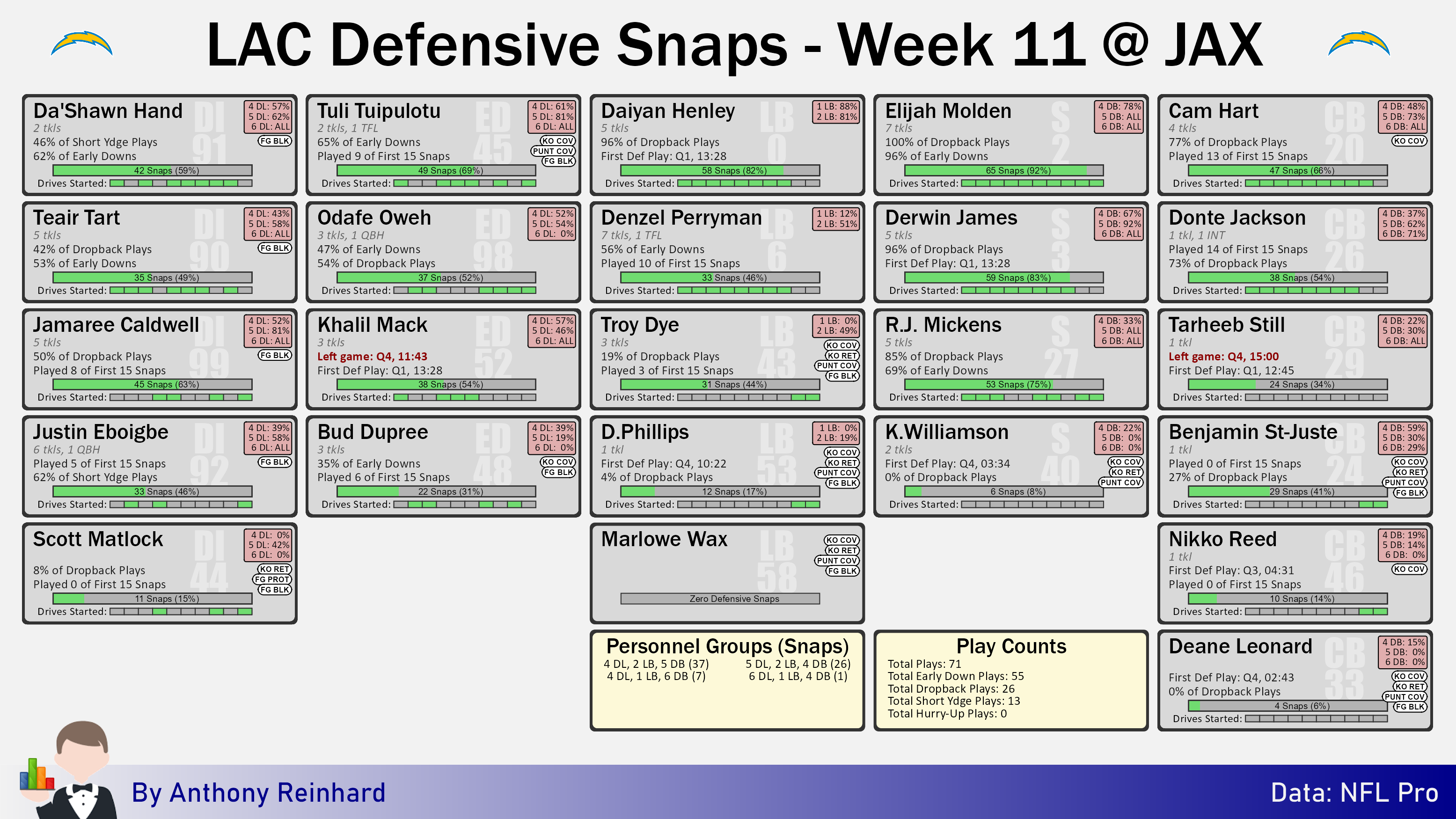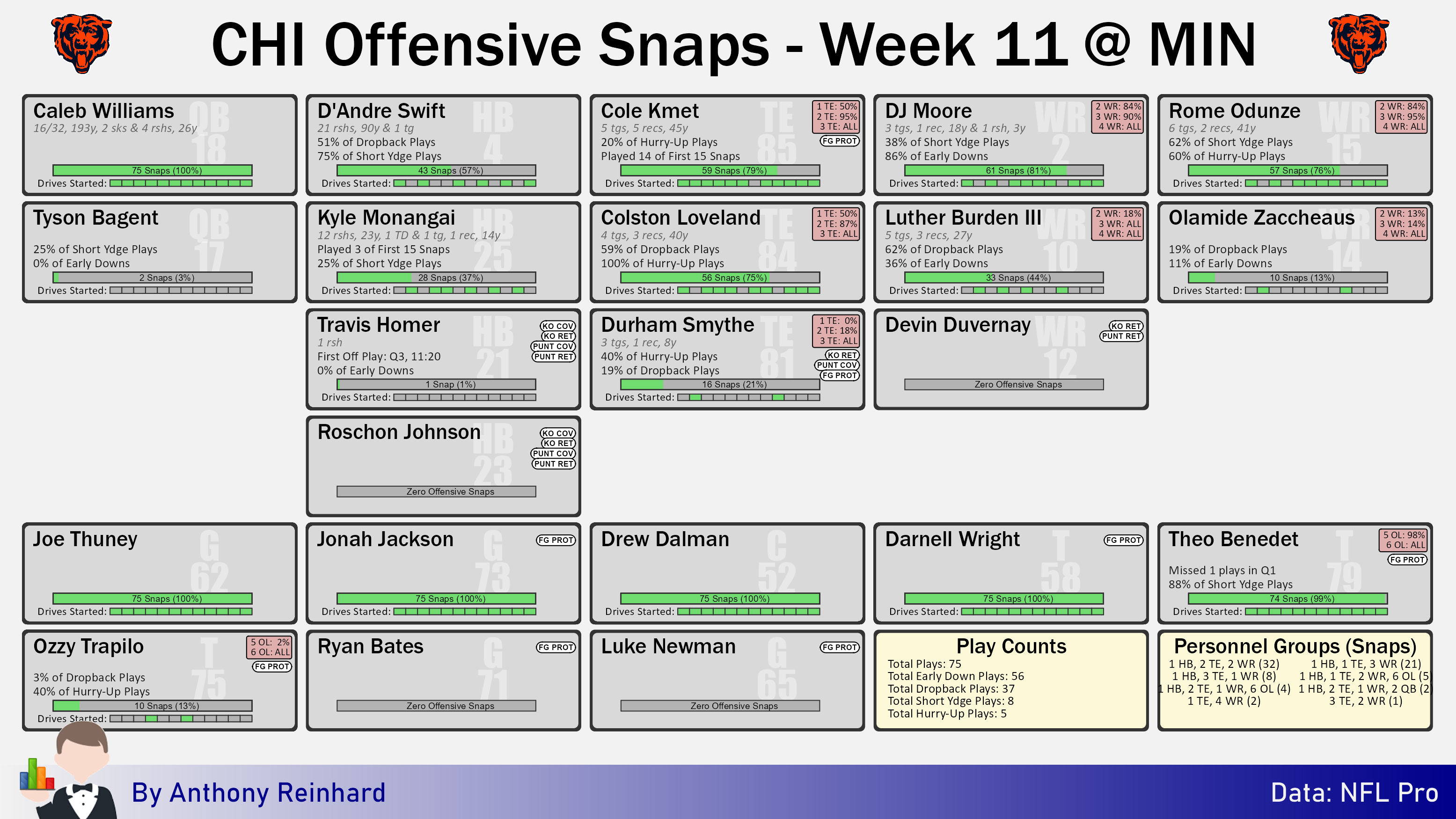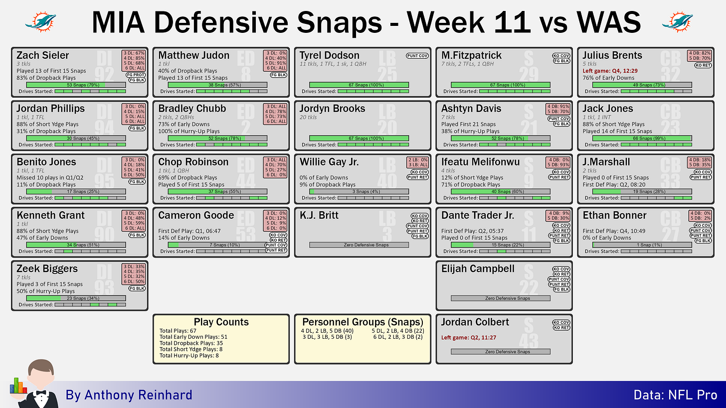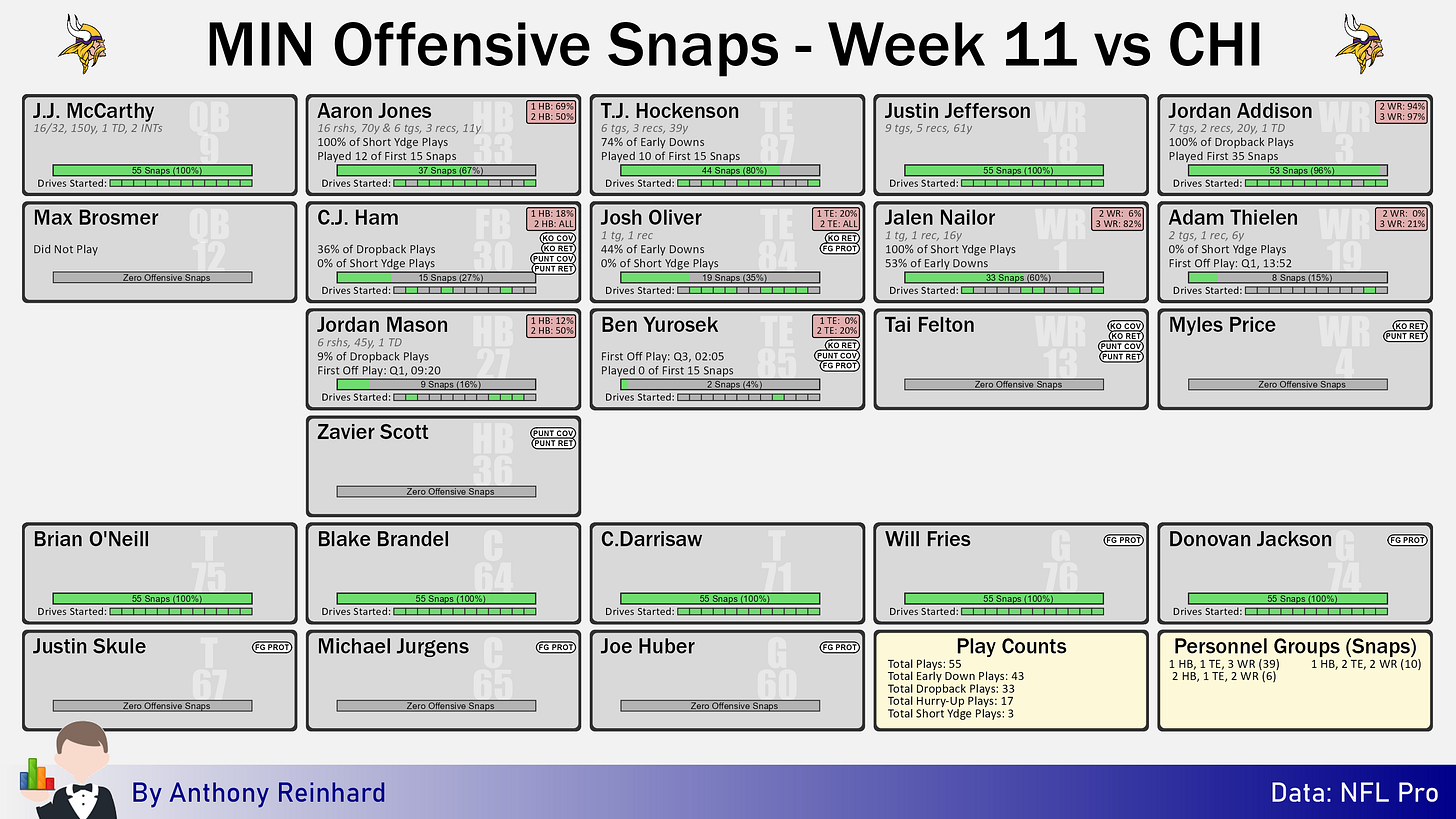 Snap Counts: Week 11Snap Count graphs for each team in Week 11Anthony ReinhardNov 17, 2025ShareNYJ-NEWAS-MIACAR-ATLTB-BUFLAC-JAXCHI-MINGB-NYGCIN-PITHOU-TENSF-ARISEA-LABAL-CLEKC-DENDET-PHIDAL-LVComing Soon!Thanks for reading!SubscribePrevious