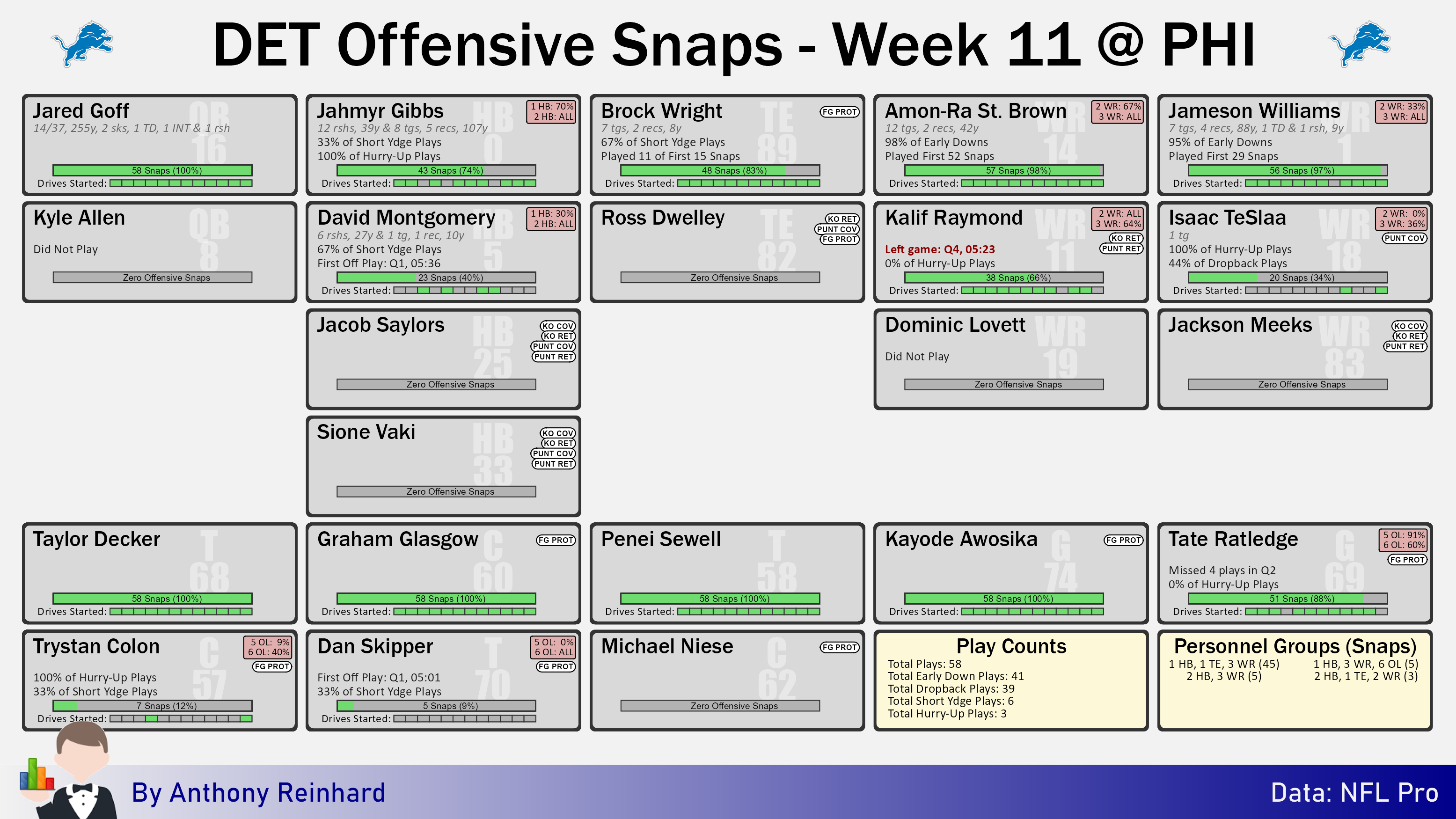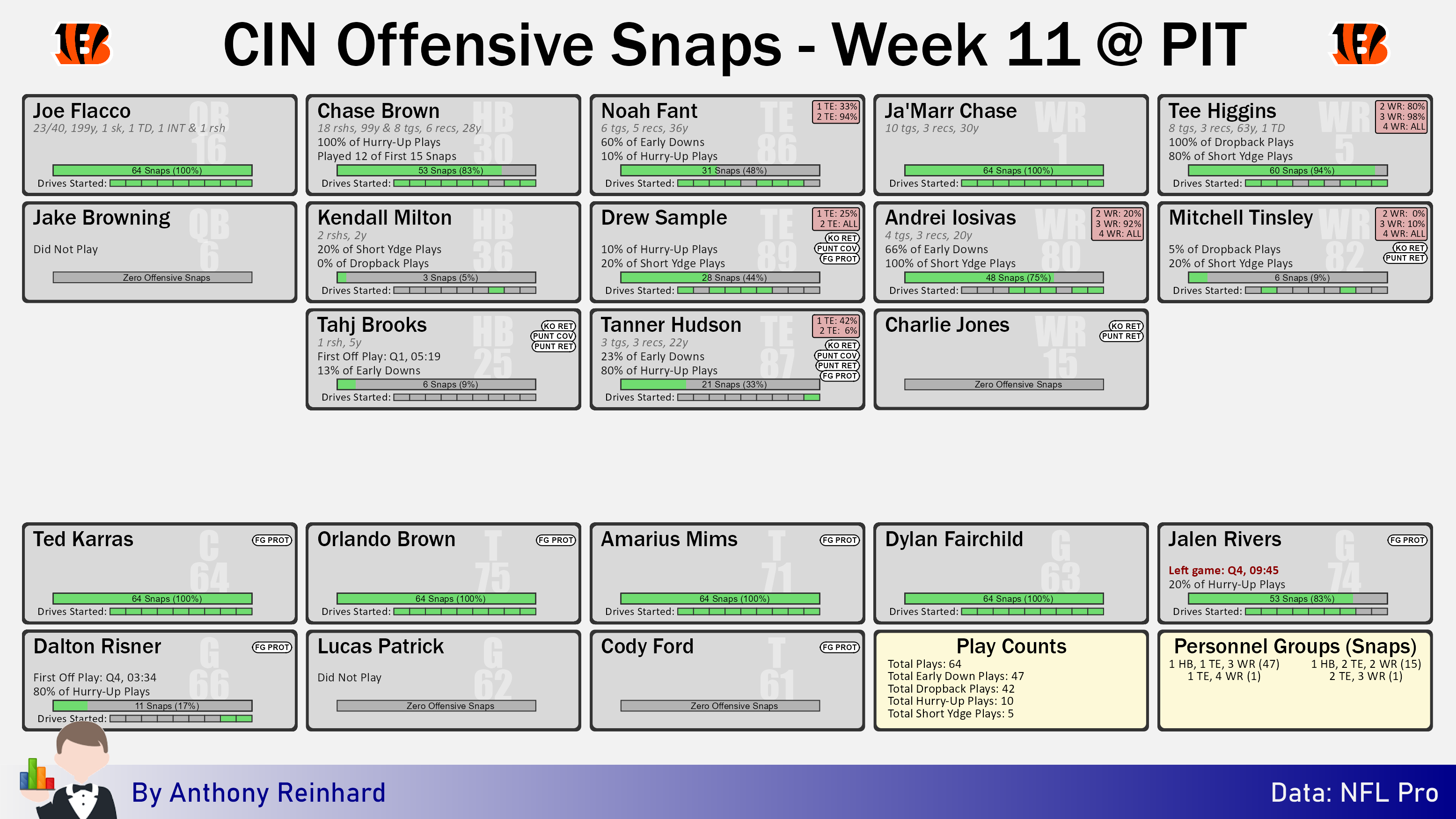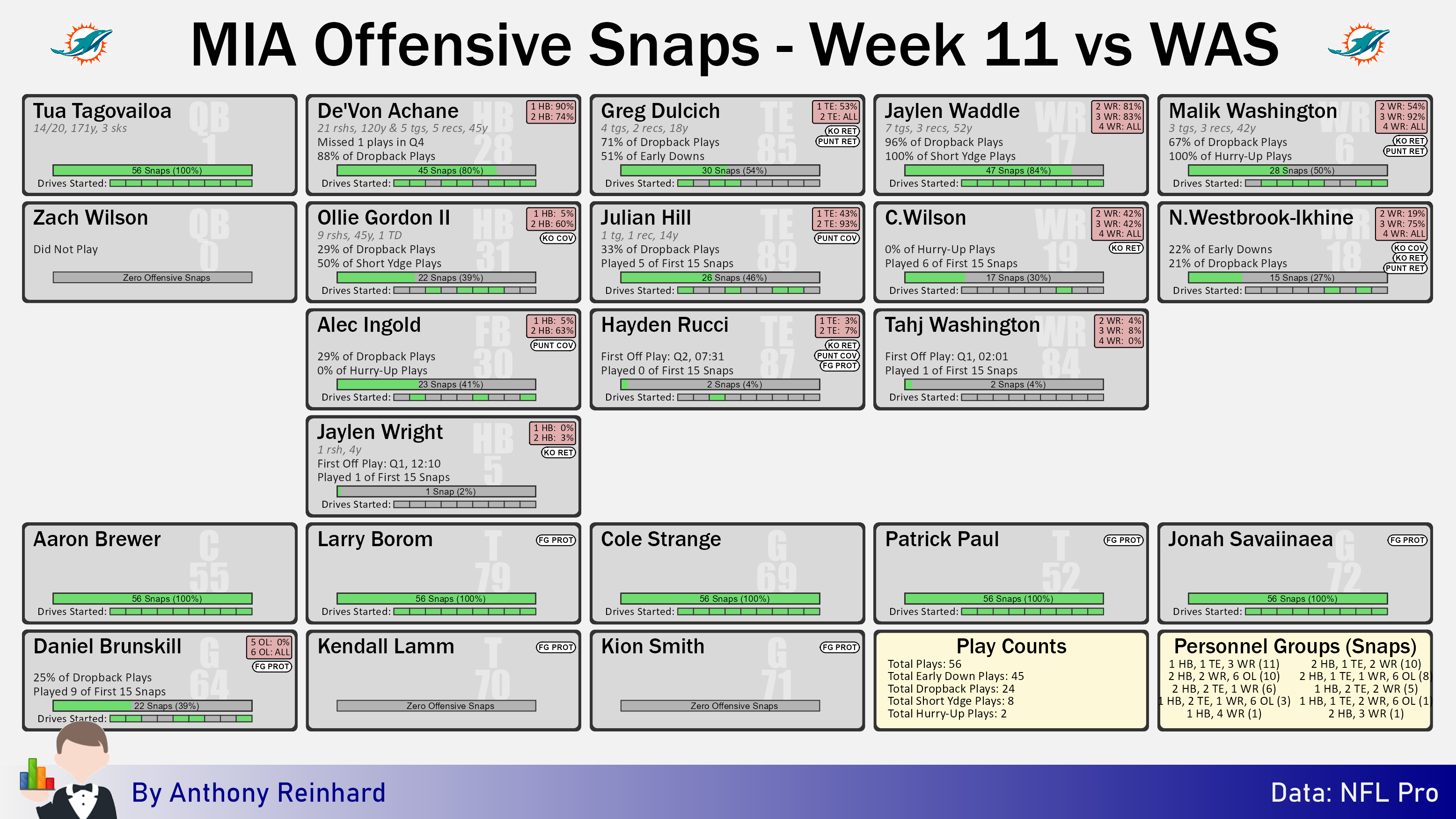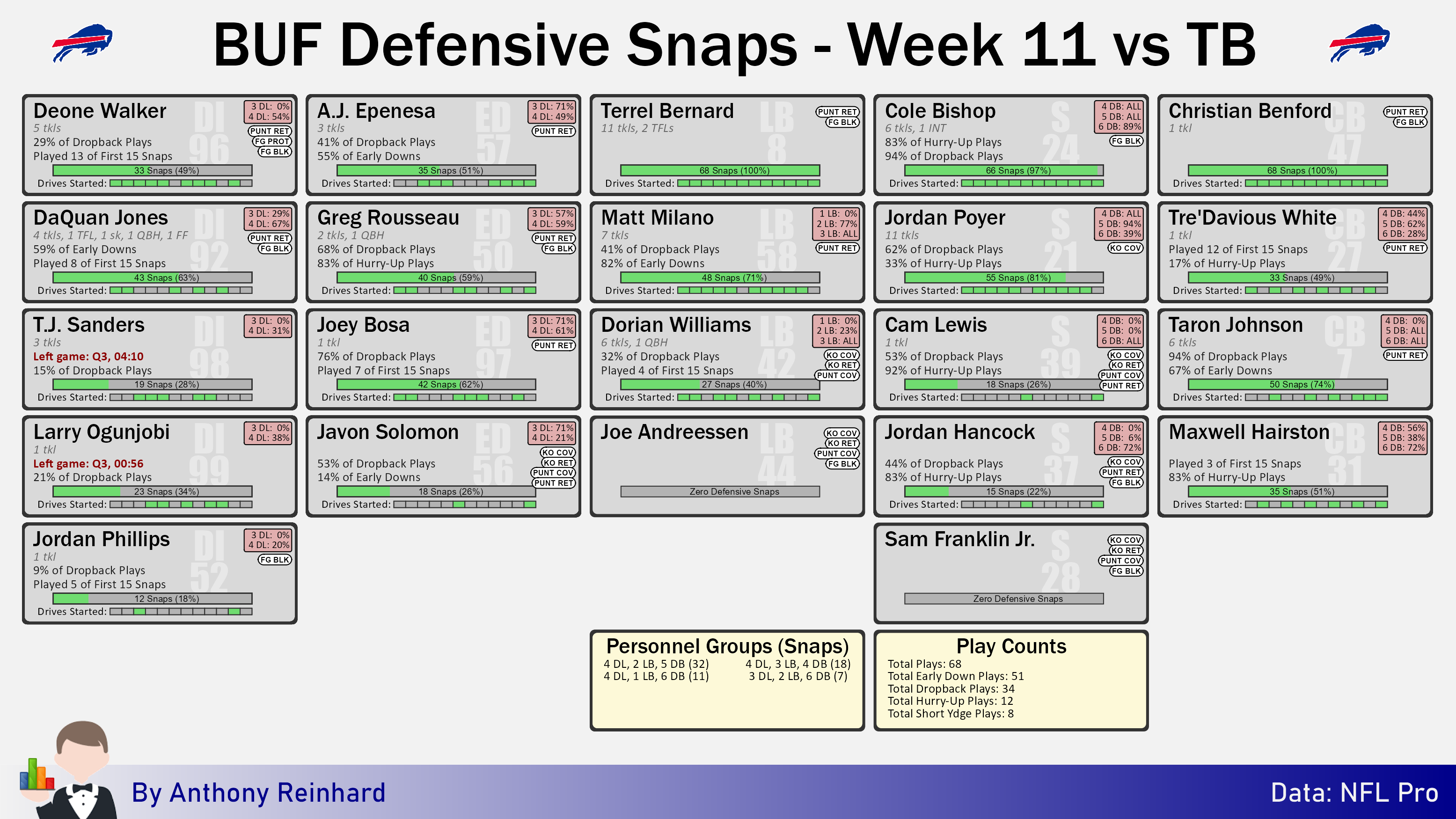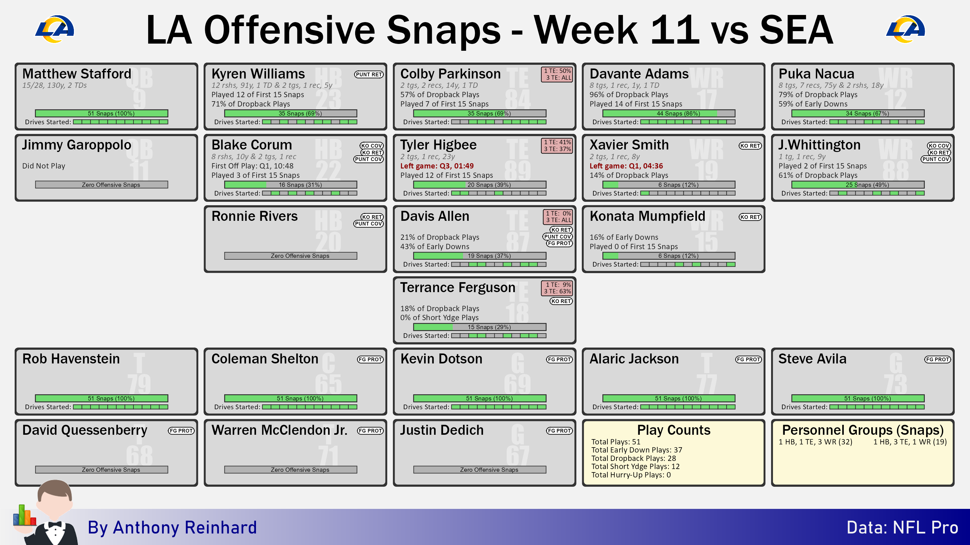 Snap Counts: Week 11Snap Count graphs for each team in Week 11Anthony ReinhardNov 17, 2025ShareNYJ-NEWAS-MIACAR-ATLTB-BUFLAC-JAXCHI-MINGB-NYGCIN-PITHOU-TENSF-ARISEA-LABAL-CLEKC-DENDET-PHIDAL-LVComing Soon!Thanks for reading!SubscribePrevious