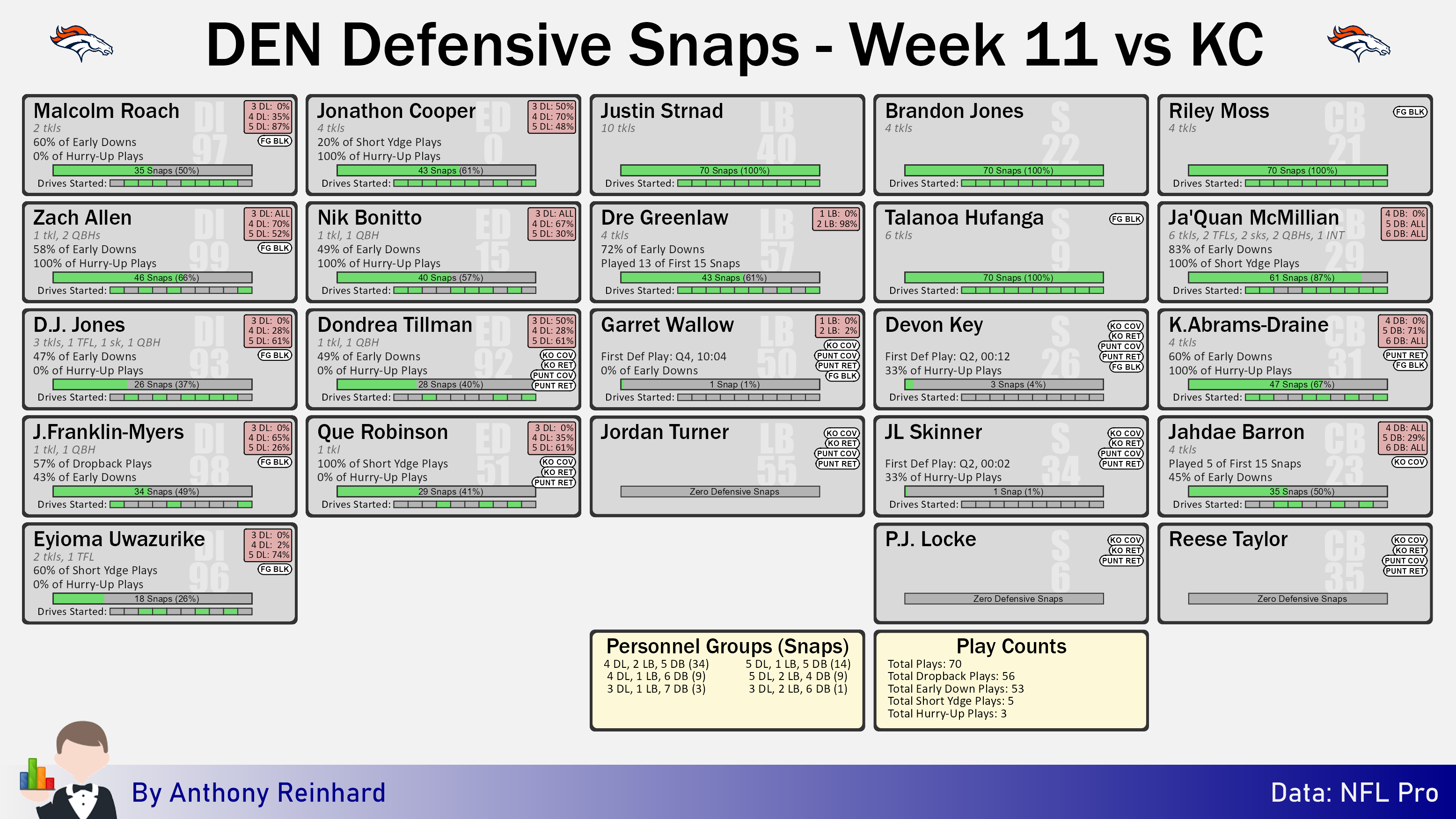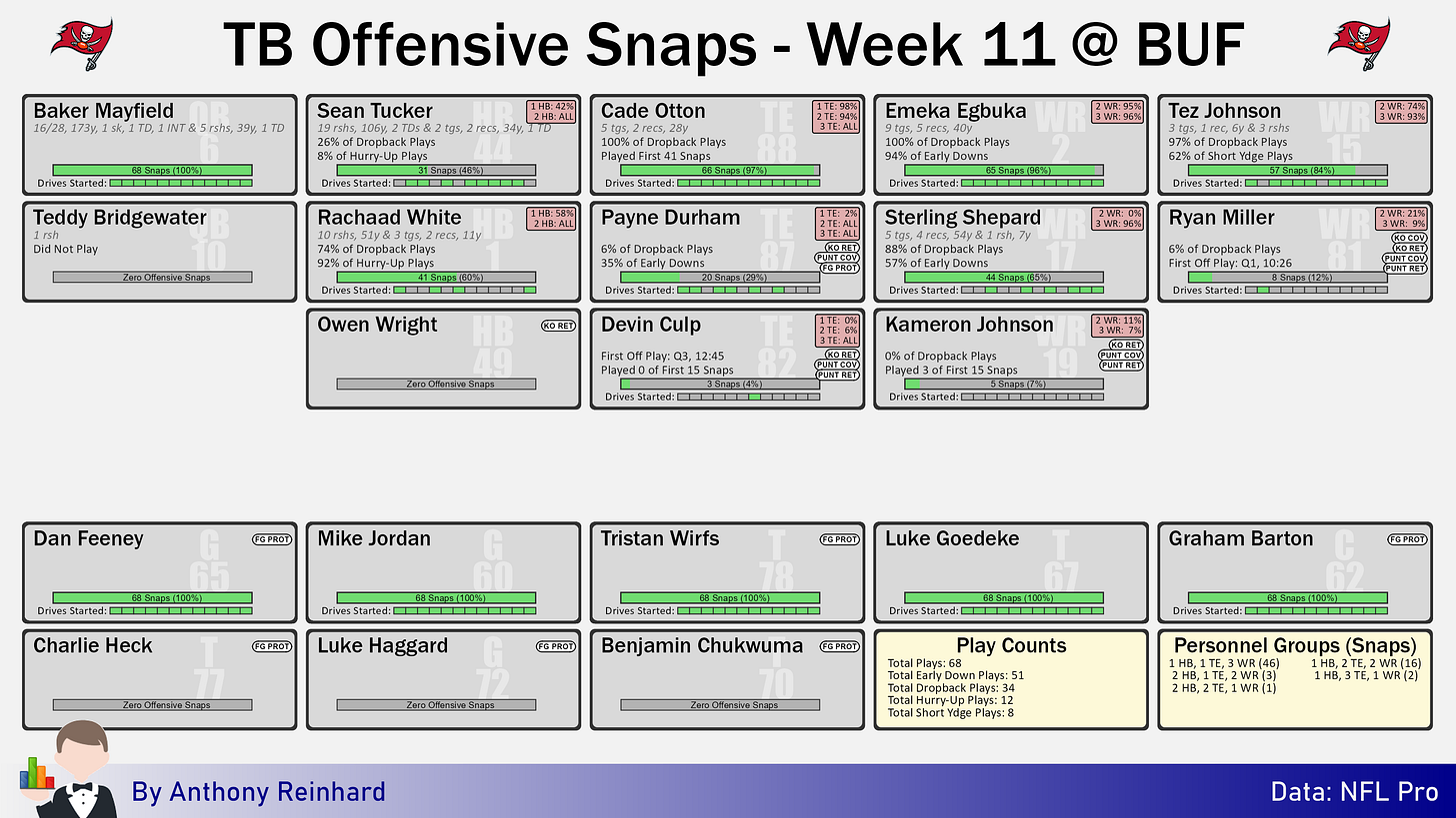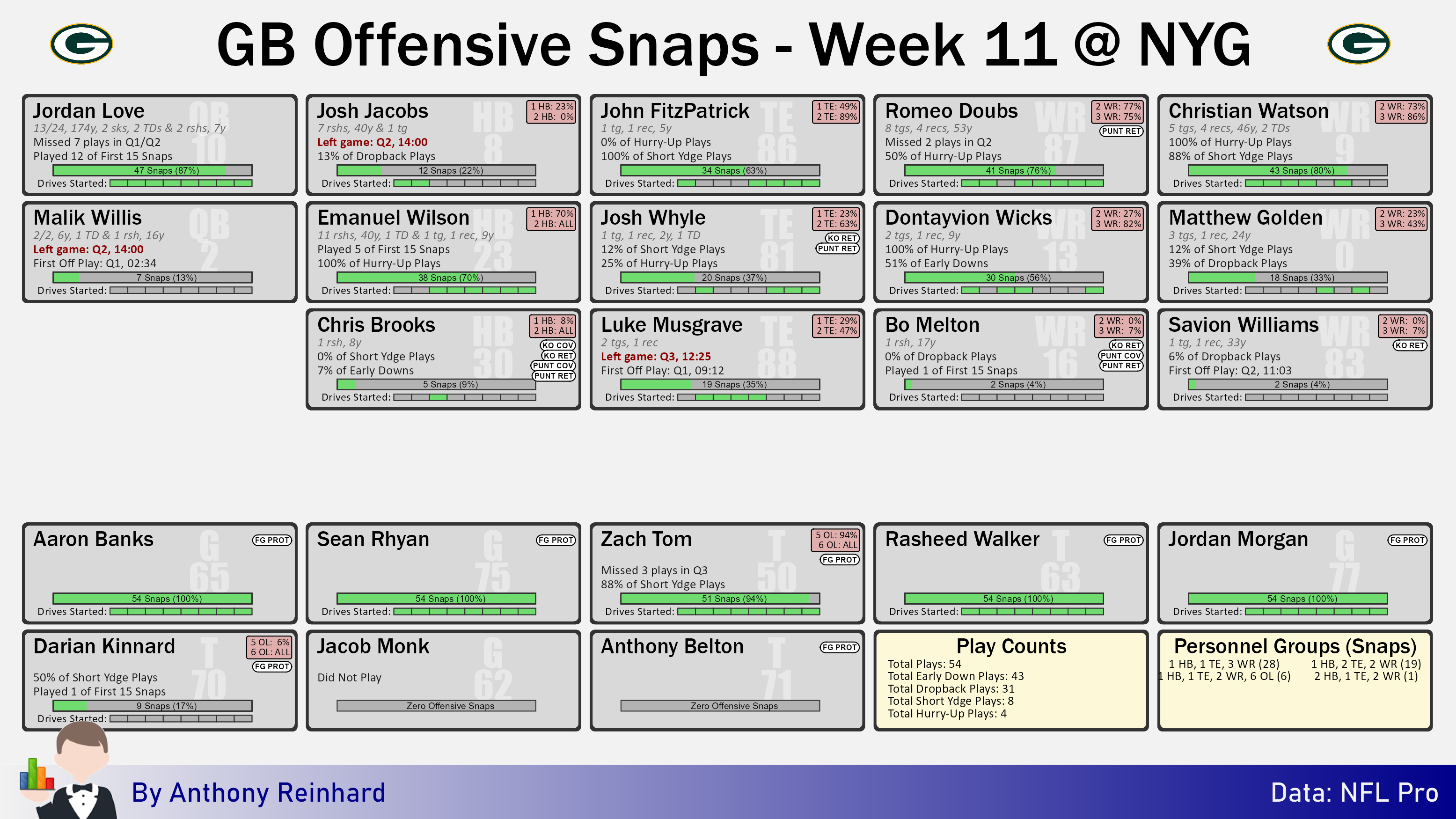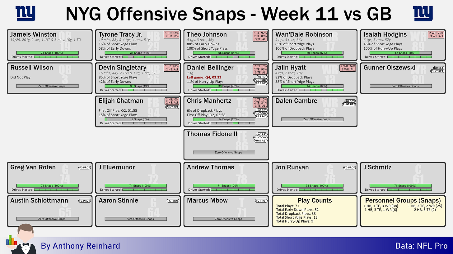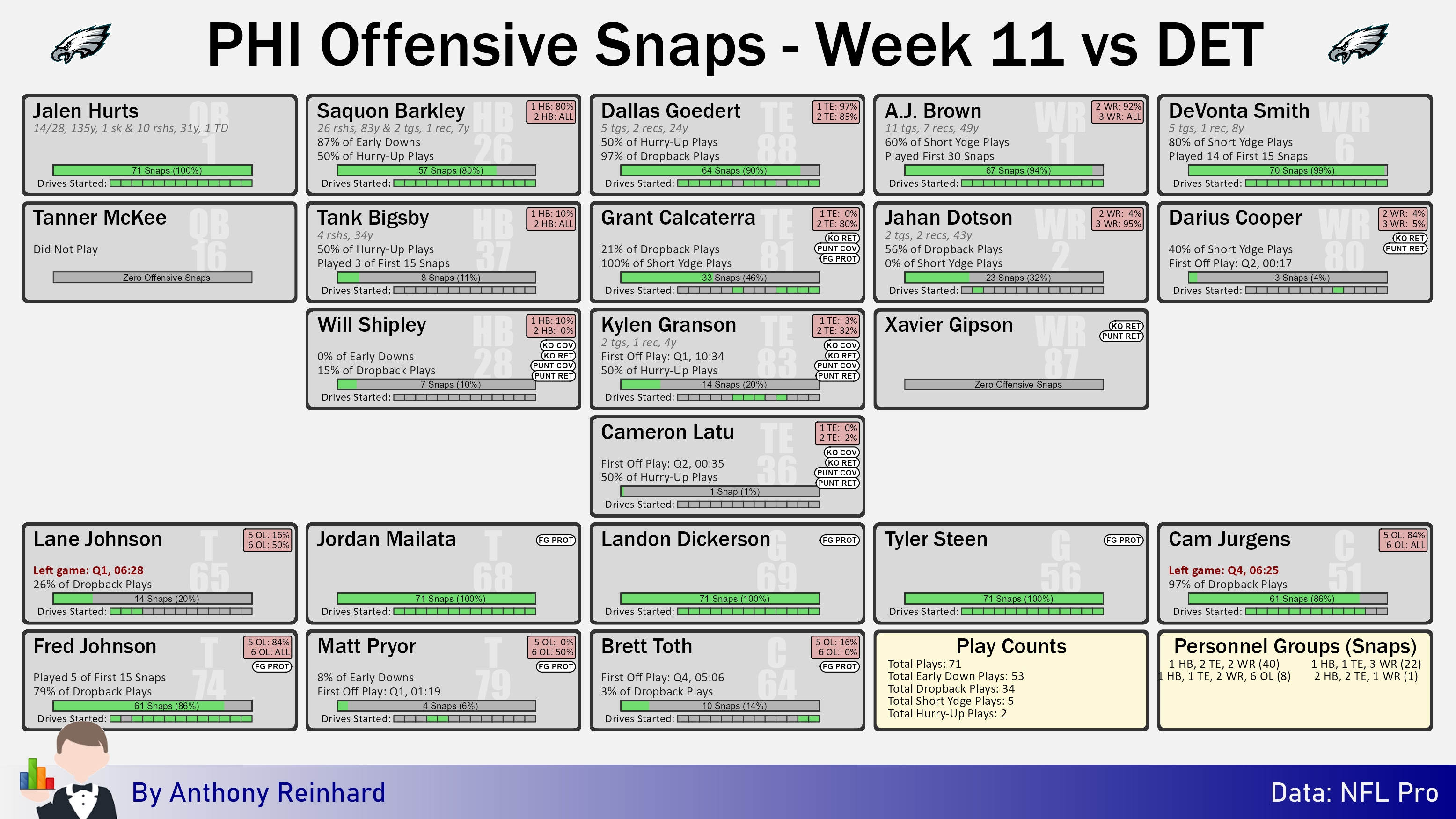 Snap Counts: Week 11Snap Count graphs for each team in Week 11Anthony ReinhardNov 17, 2025ShareNYJ-NEWAS-MIACAR-ATLTB-BUFLAC-JAXCHI-MINGB-NYGCIN-PITHOU-TENSF-ARISEA-LABAL-CLEKC-DENDET-PHIDAL-LVComing Soon!Thanks for reading!SubscribePrevious