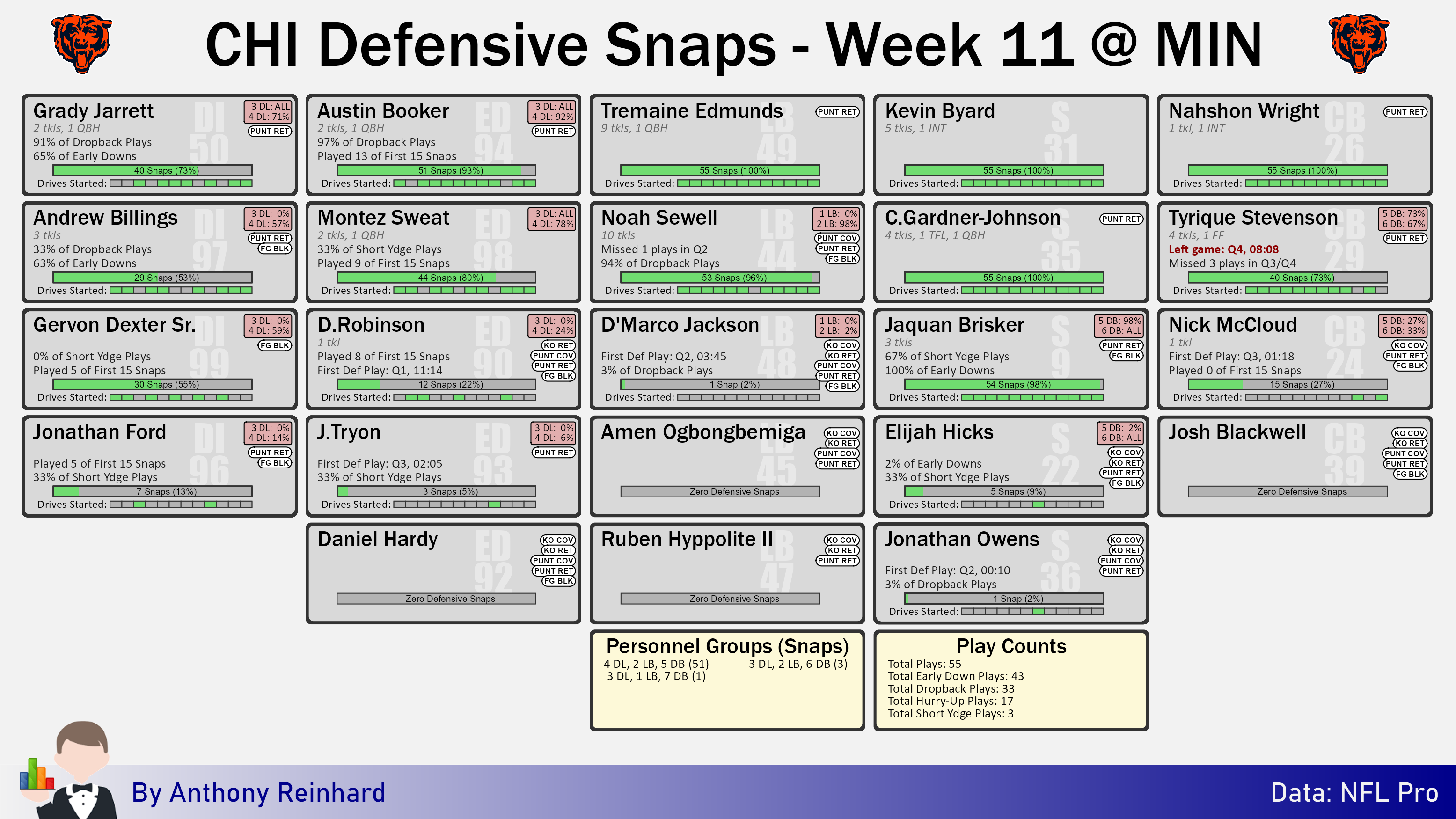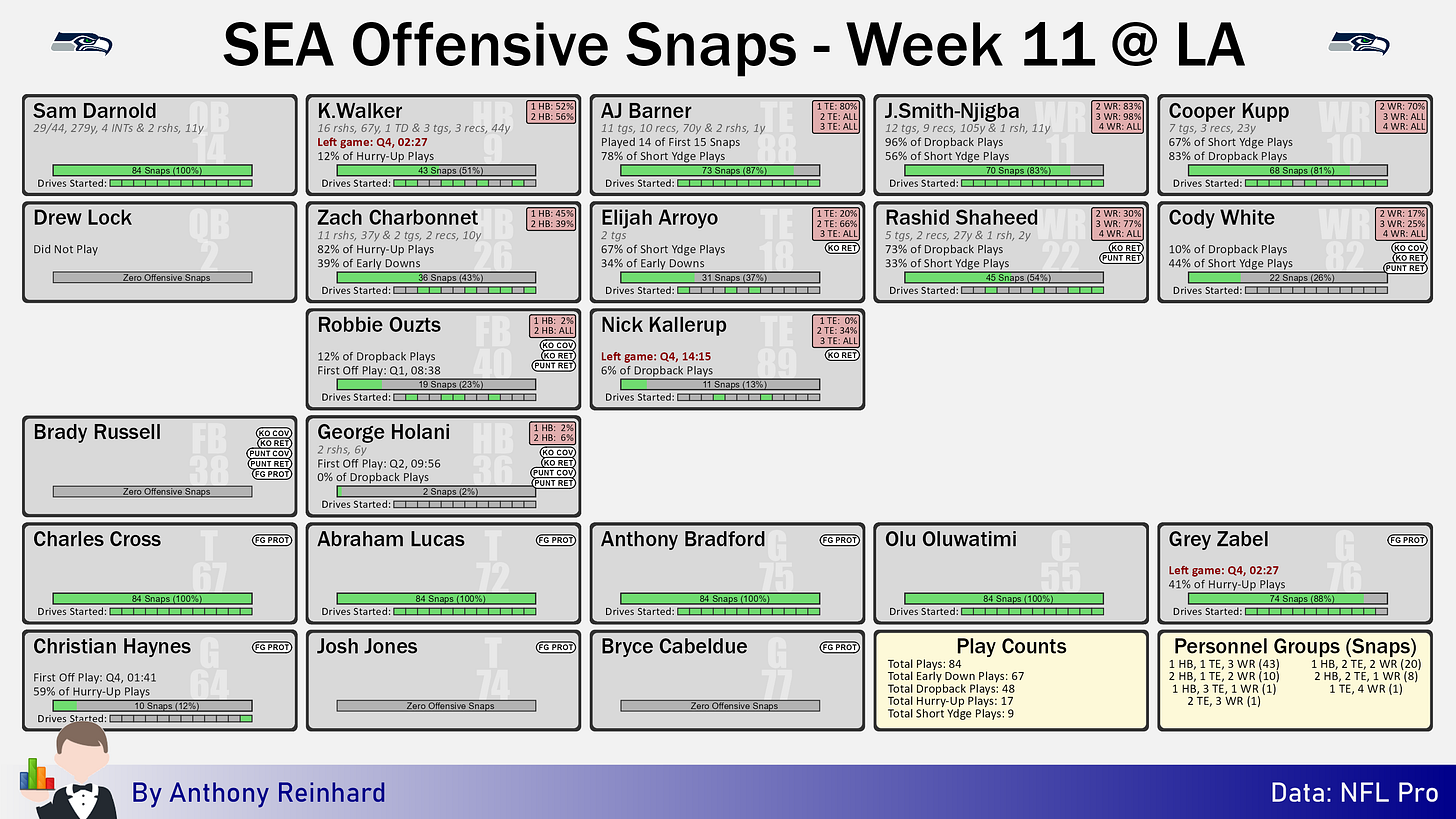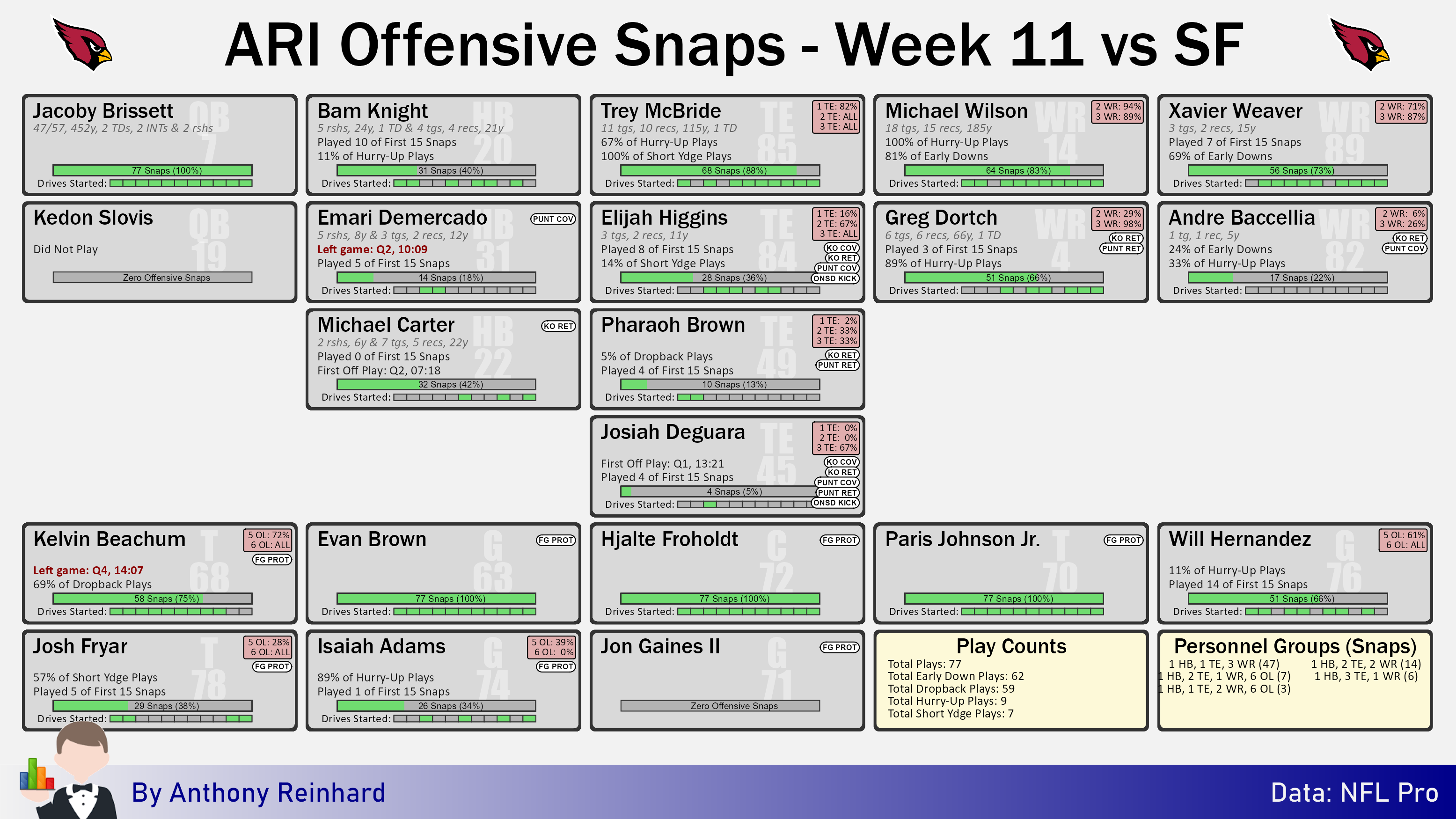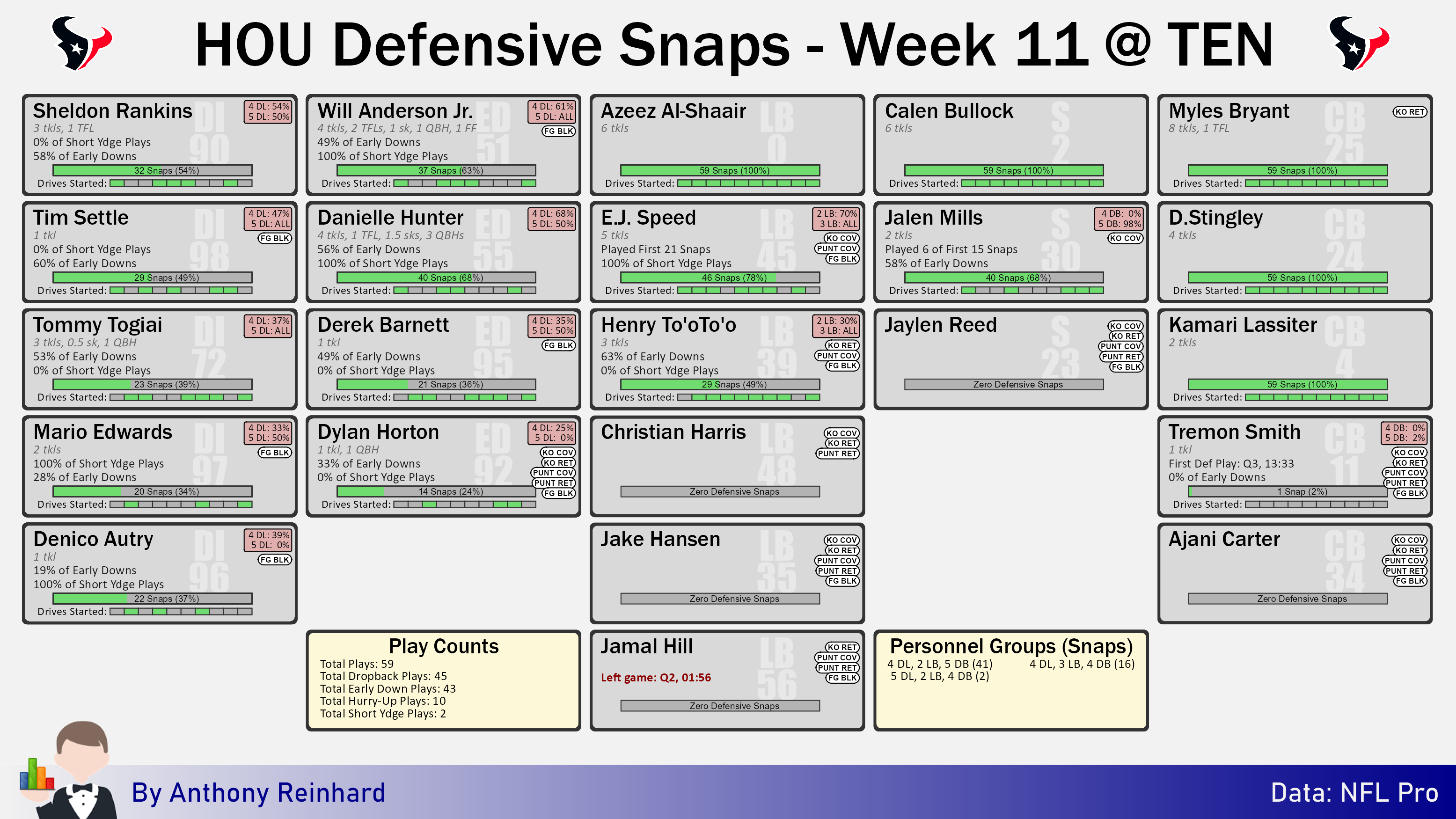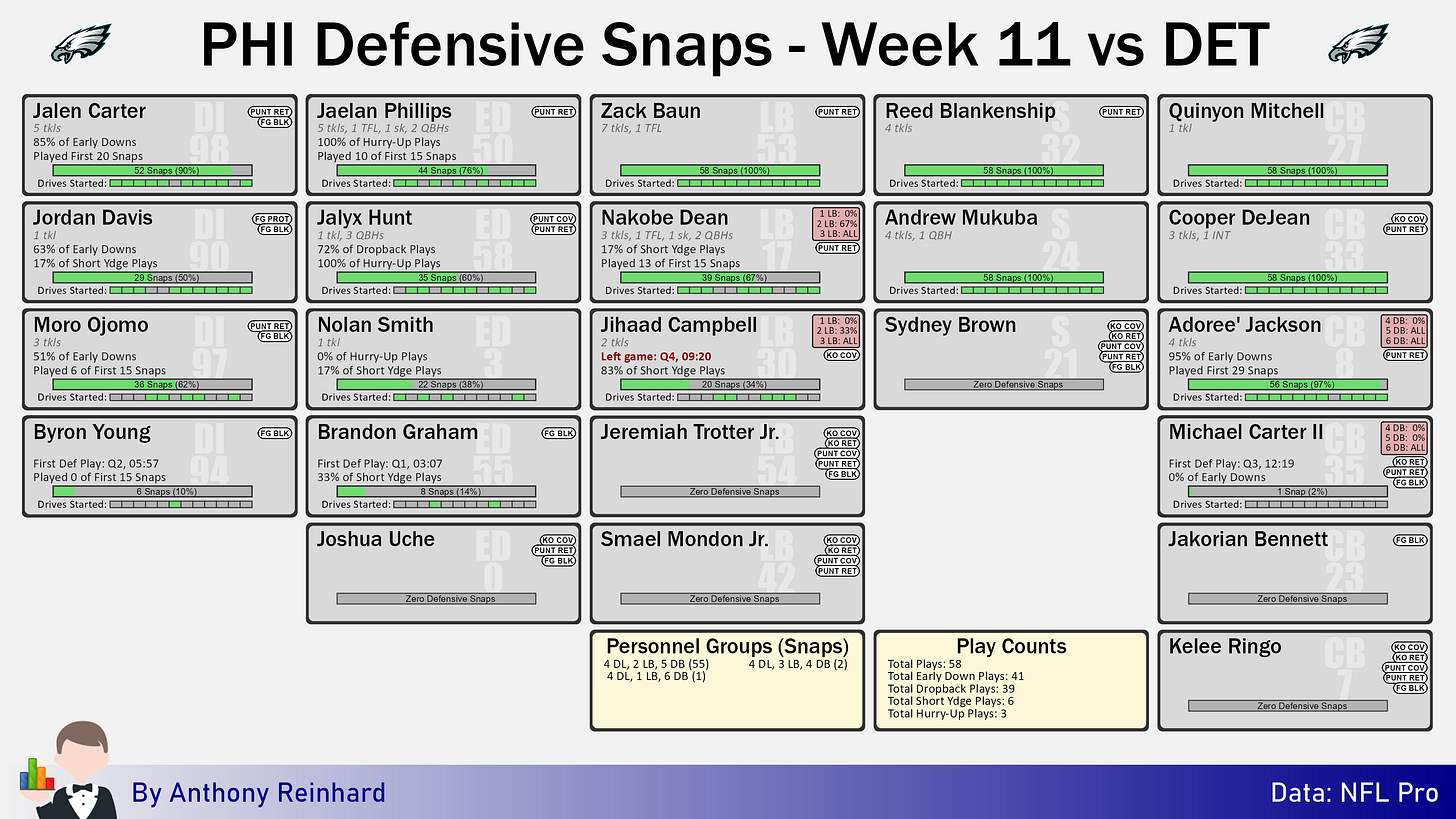Snap Counts: Week 11Snap Count graphs for each team in Week 11Anthony ReinhardNov 17, 2025ShareNYJ-NEWAS-MIACAR-ATLTB-BUFLAC-JAXCHI-MINGB-NYGCIN-PITHOU-TENSF-ARISEA-LABAL-CLEKC-DENDET-PHIDAL-LVComing Soon!Thanks for reading!SubscribePrevious