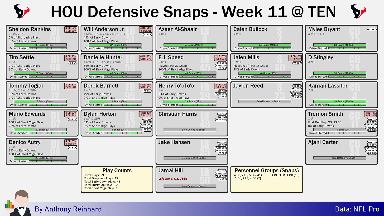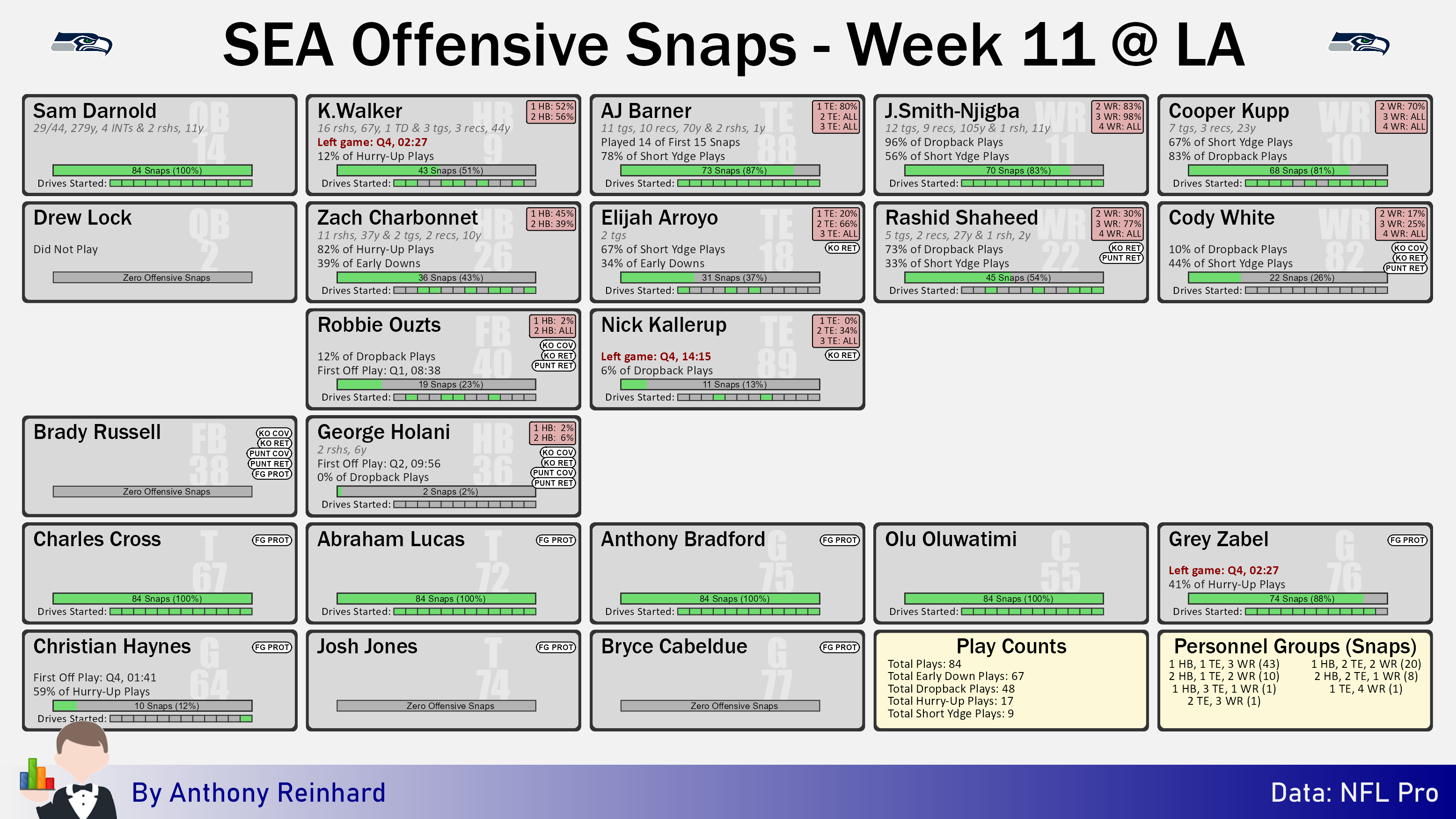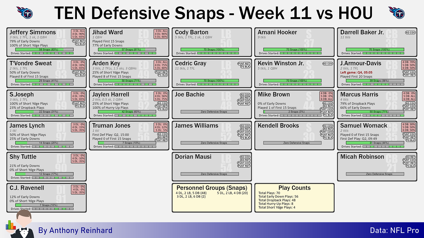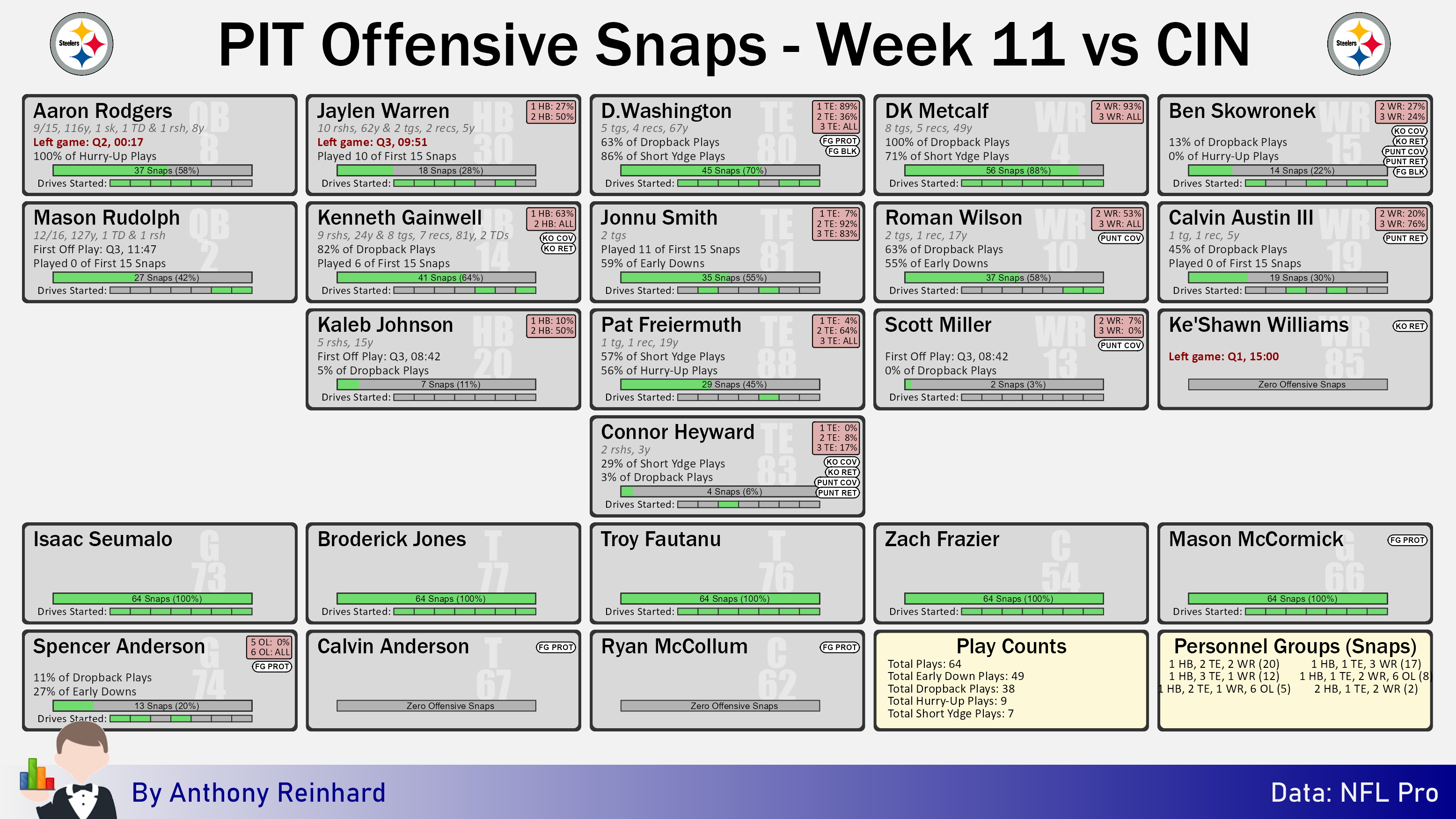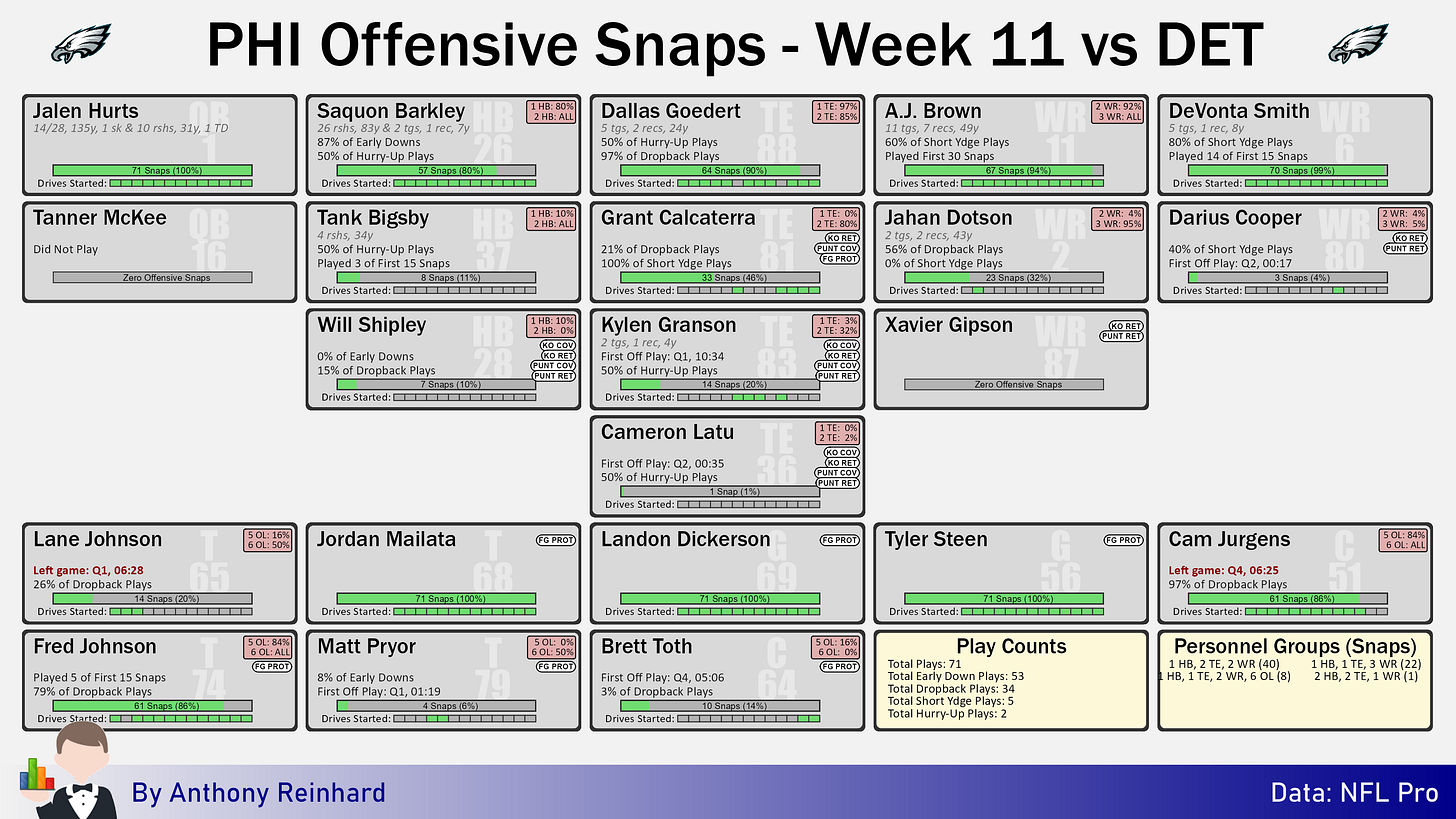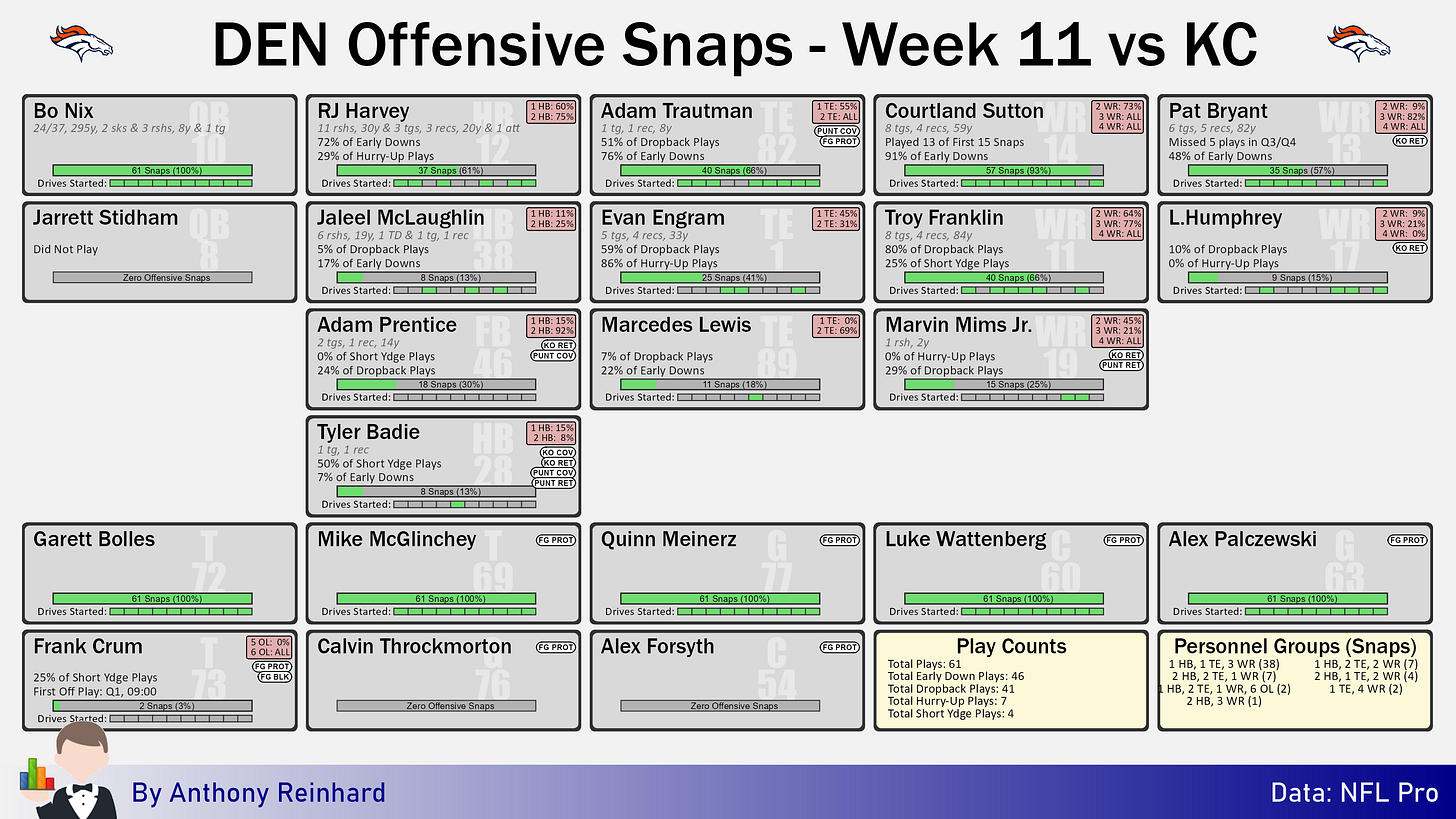 Snap Counts: Week 11Snap Count graphs for each team in Week 11Anthony ReinhardNov 17, 2025ShareNYJ-NEWAS-MIACAR-ATLTB-BUFLAC-JAXCHI-MINGB-NYGCIN-PITHOU-TENSF-ARISEA-LABAL-CLEKC-DENDET-PHIDAL-LVComing Soon!Thanks for reading!SubscribePrevious