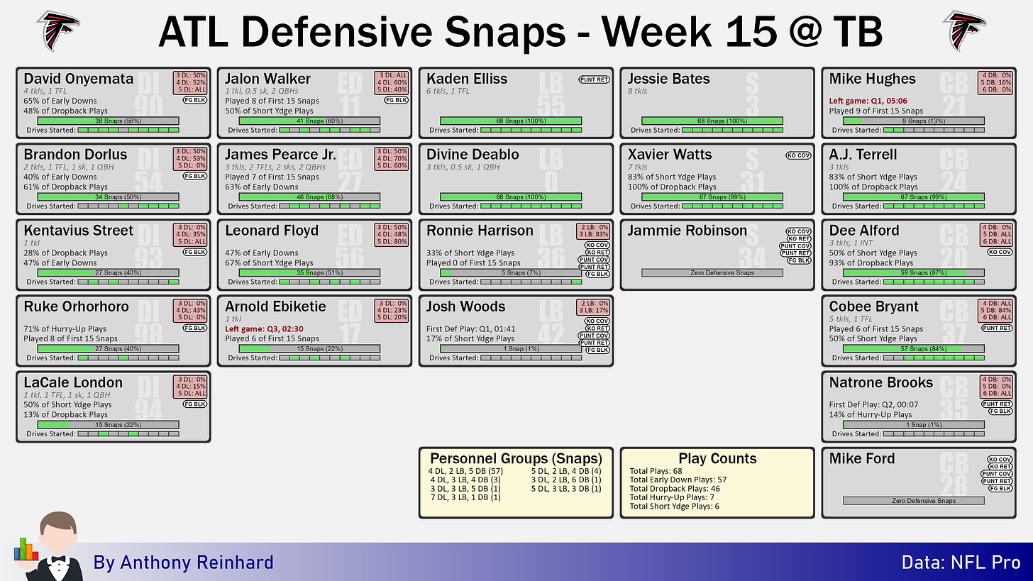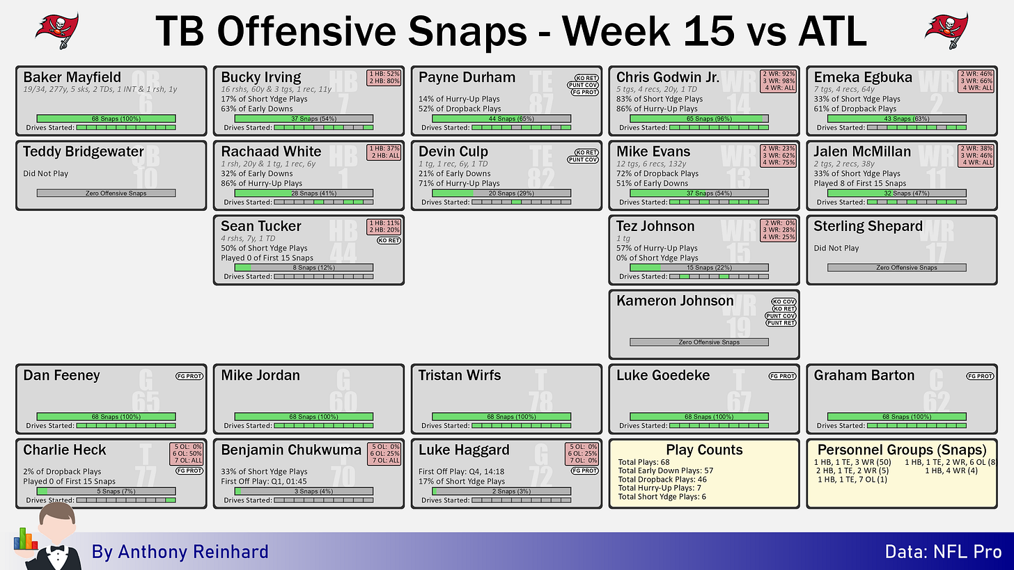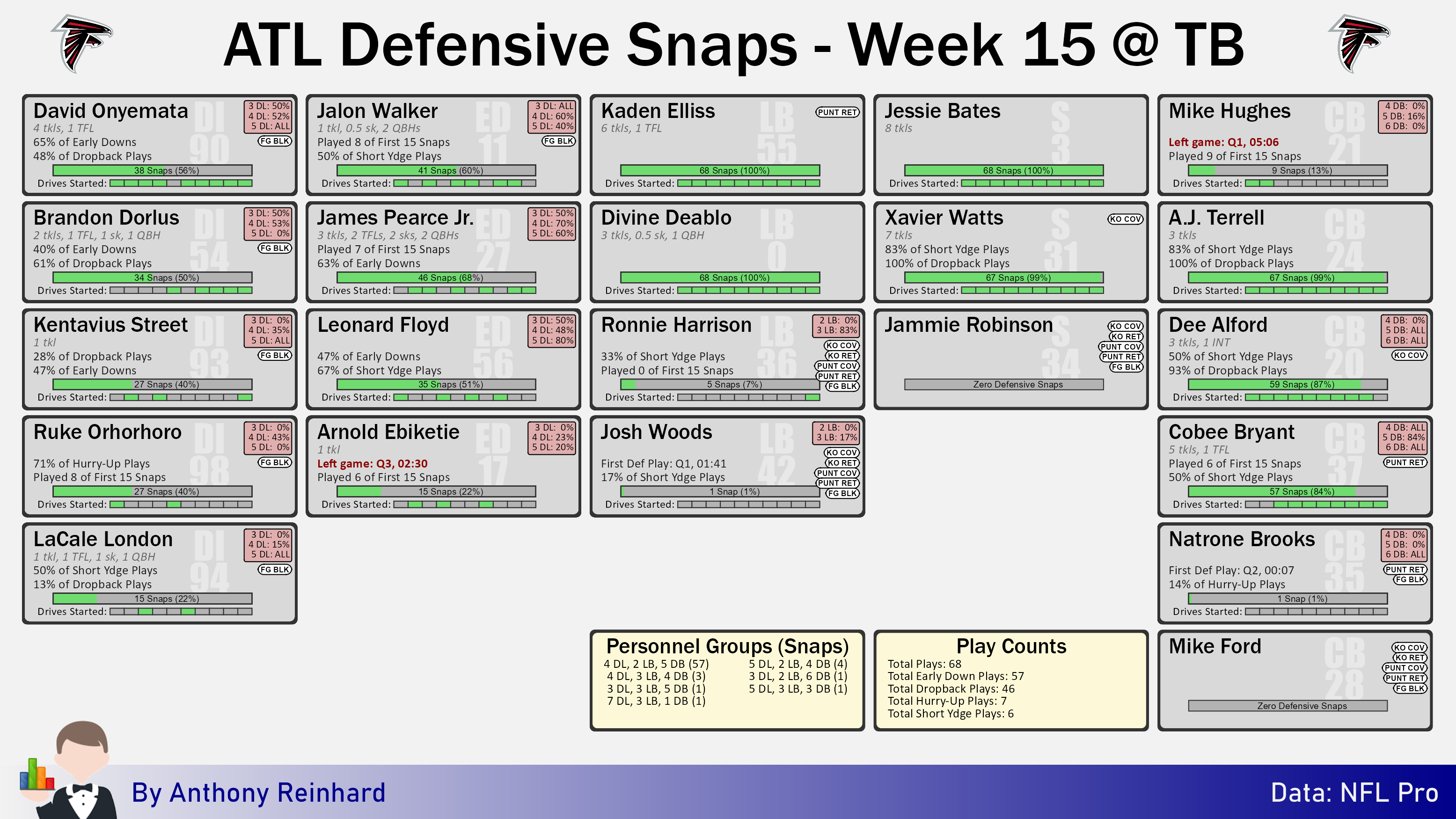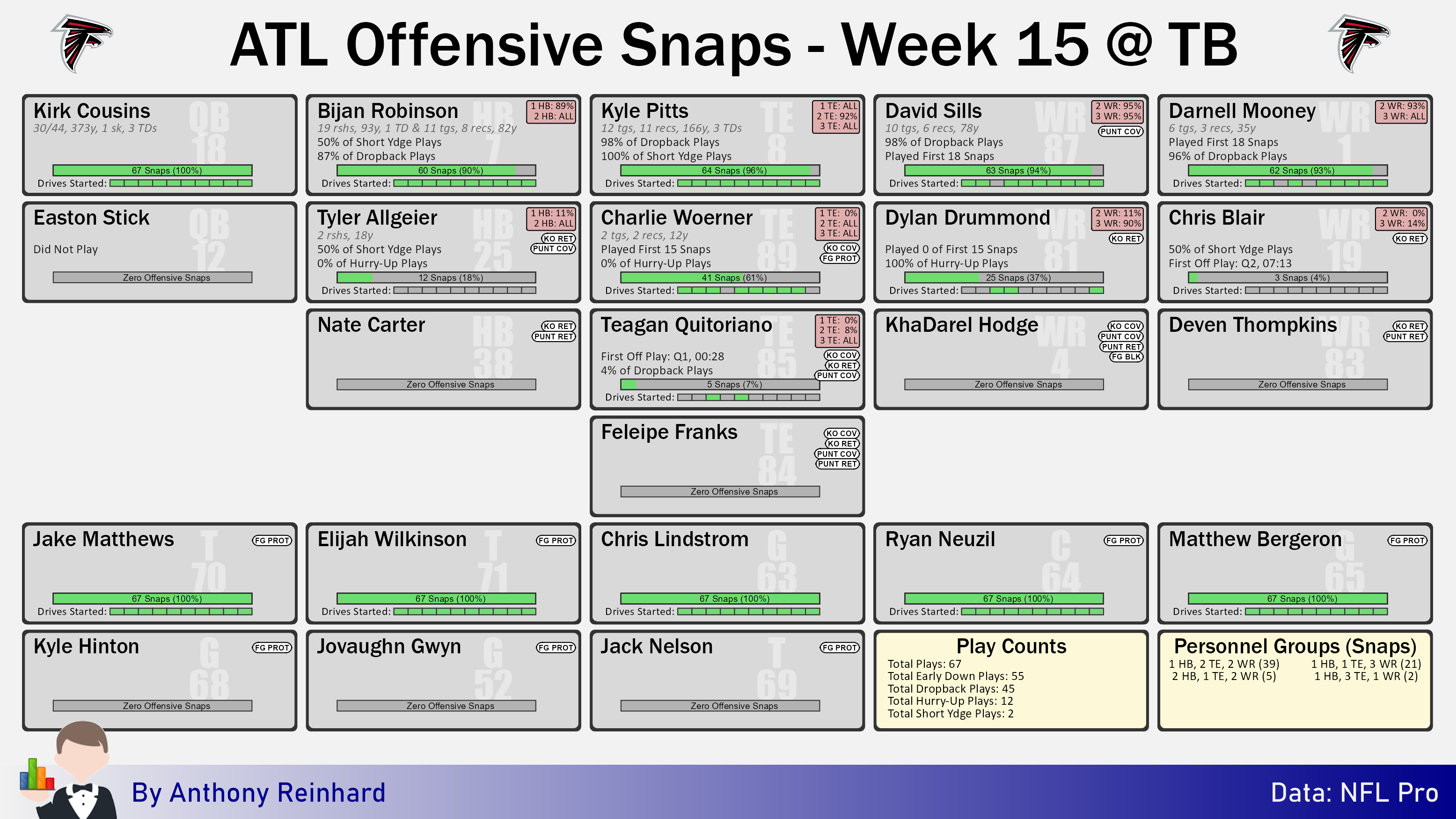 Snap Counts: Week 15Snap Count graphs for each team in Week 15Anthony ReinhardDec 15, 20252ShareATL-TBCLE-CHIBAL-CINARI-HOUNYJ-JAXLAC-KCBUF-NEWAS-NYGLV-PHIGB-DENDET-LACAR-NOIND-SEATEN-SFMIN-DALMIA-PITSubscribePreviousNext