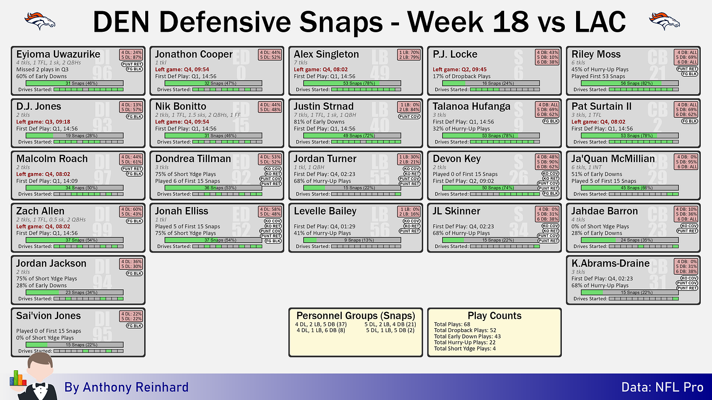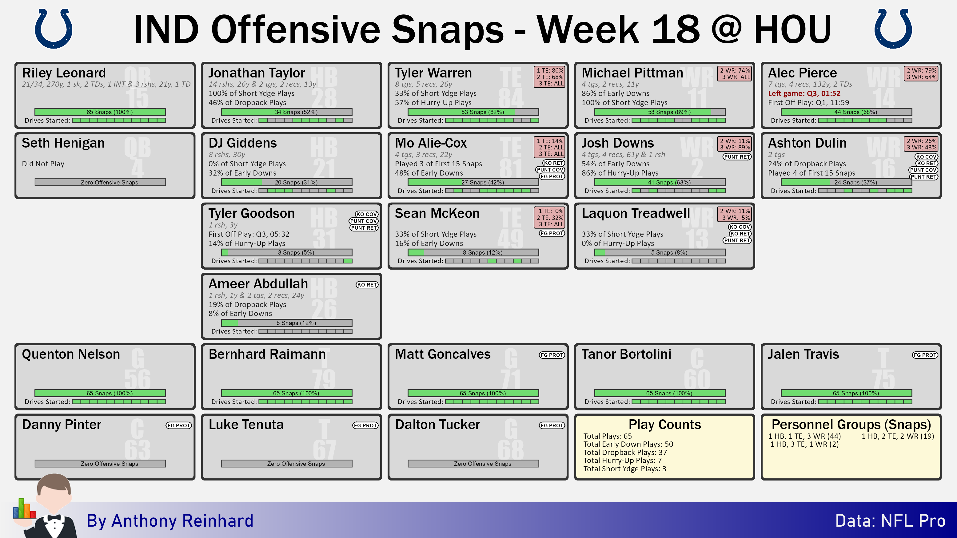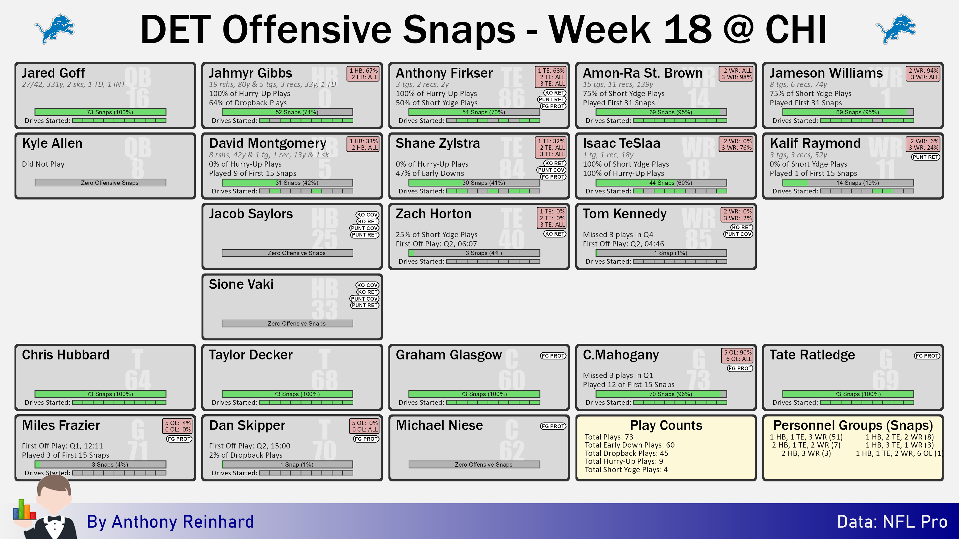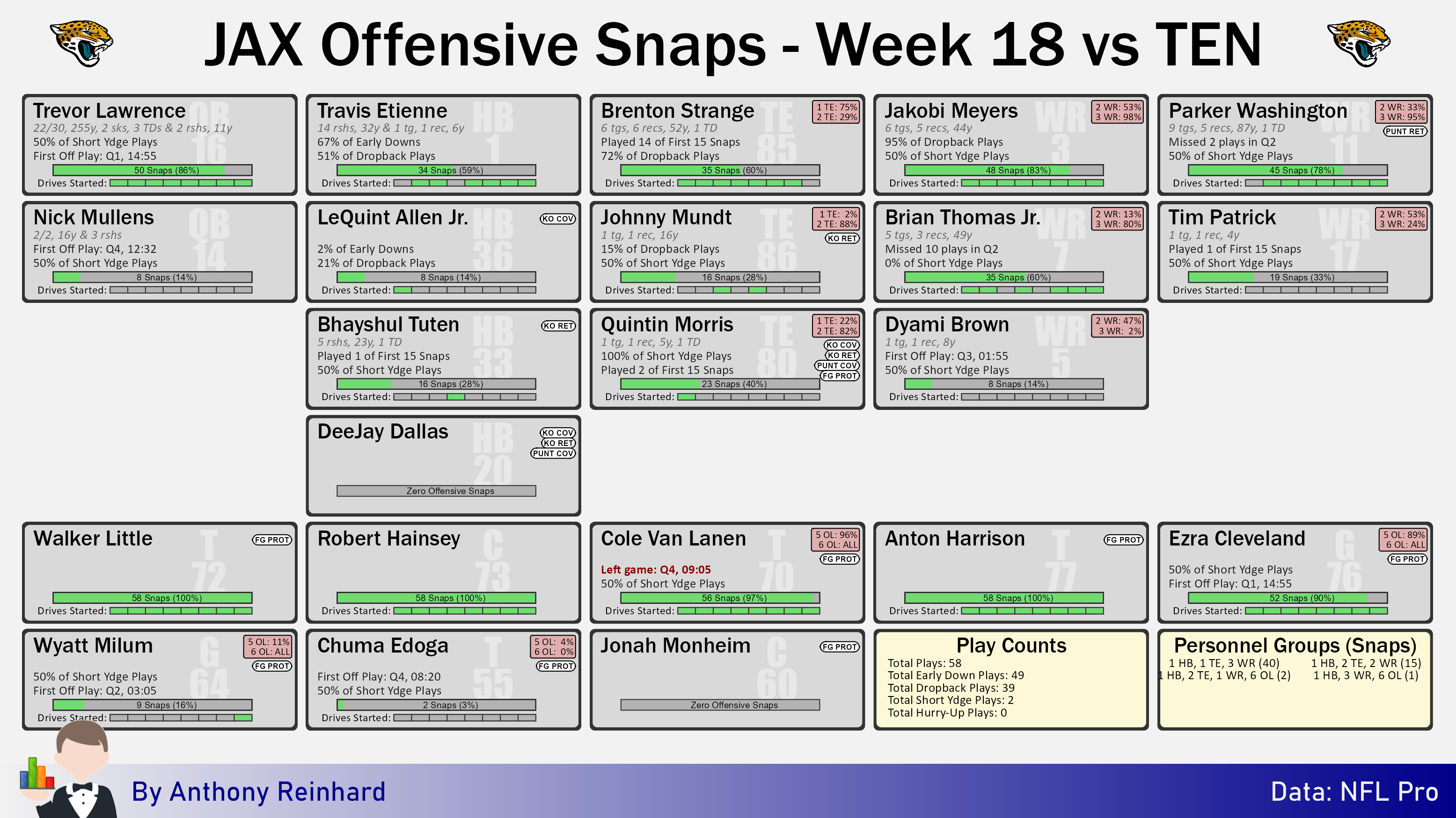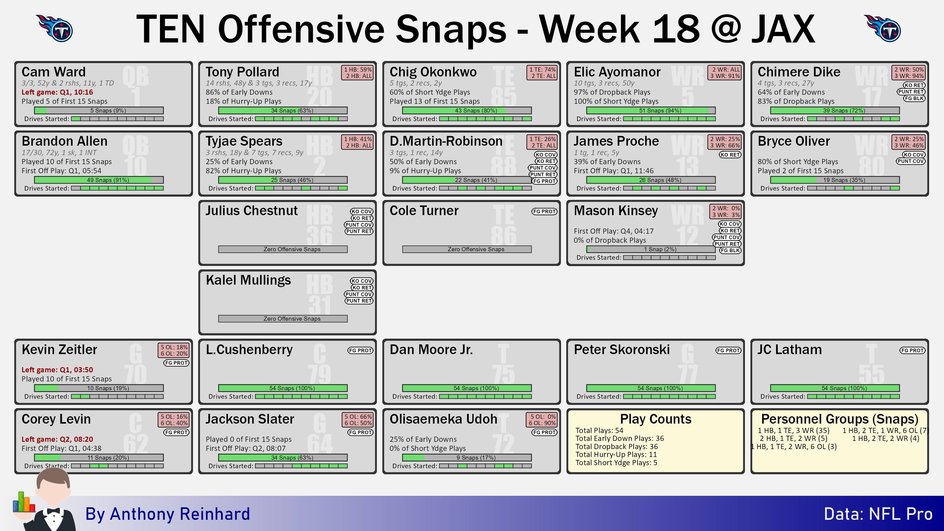 Snap Counts: Week 18Snap Count graphs for each team in Week 18Anthony ReinhardJan 05, 20261ShareCAR-TBSEA-SFNO-ATLCLE-CININD-HOUTEN-JAXGB-MINDAL-NYGNYJ-BUFDET-CHILAC-DENARI-LAKC-LVMIA-NEWAS-PHIBAL-PITSubscribePreviousNext