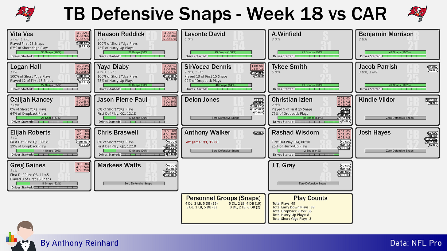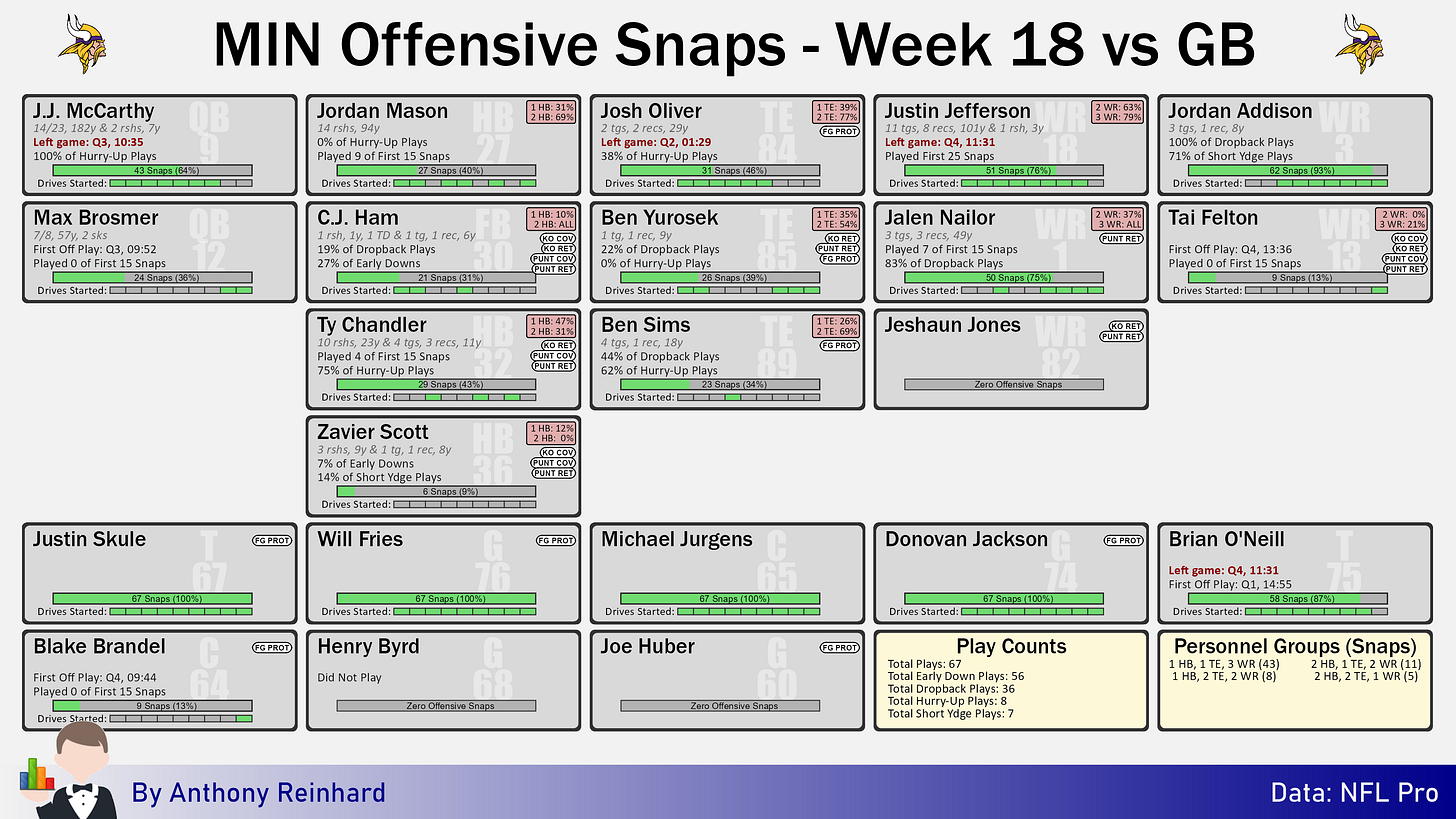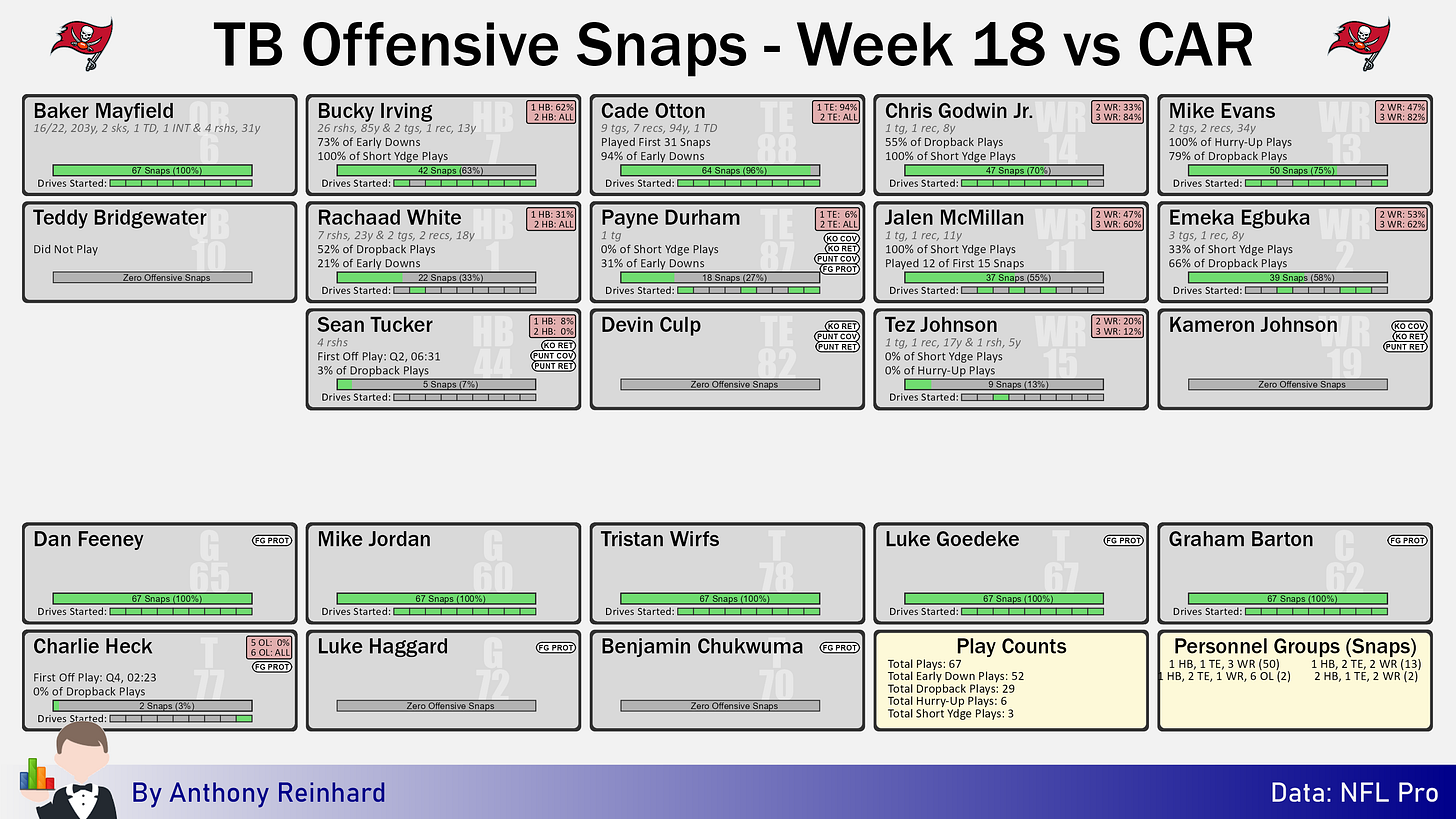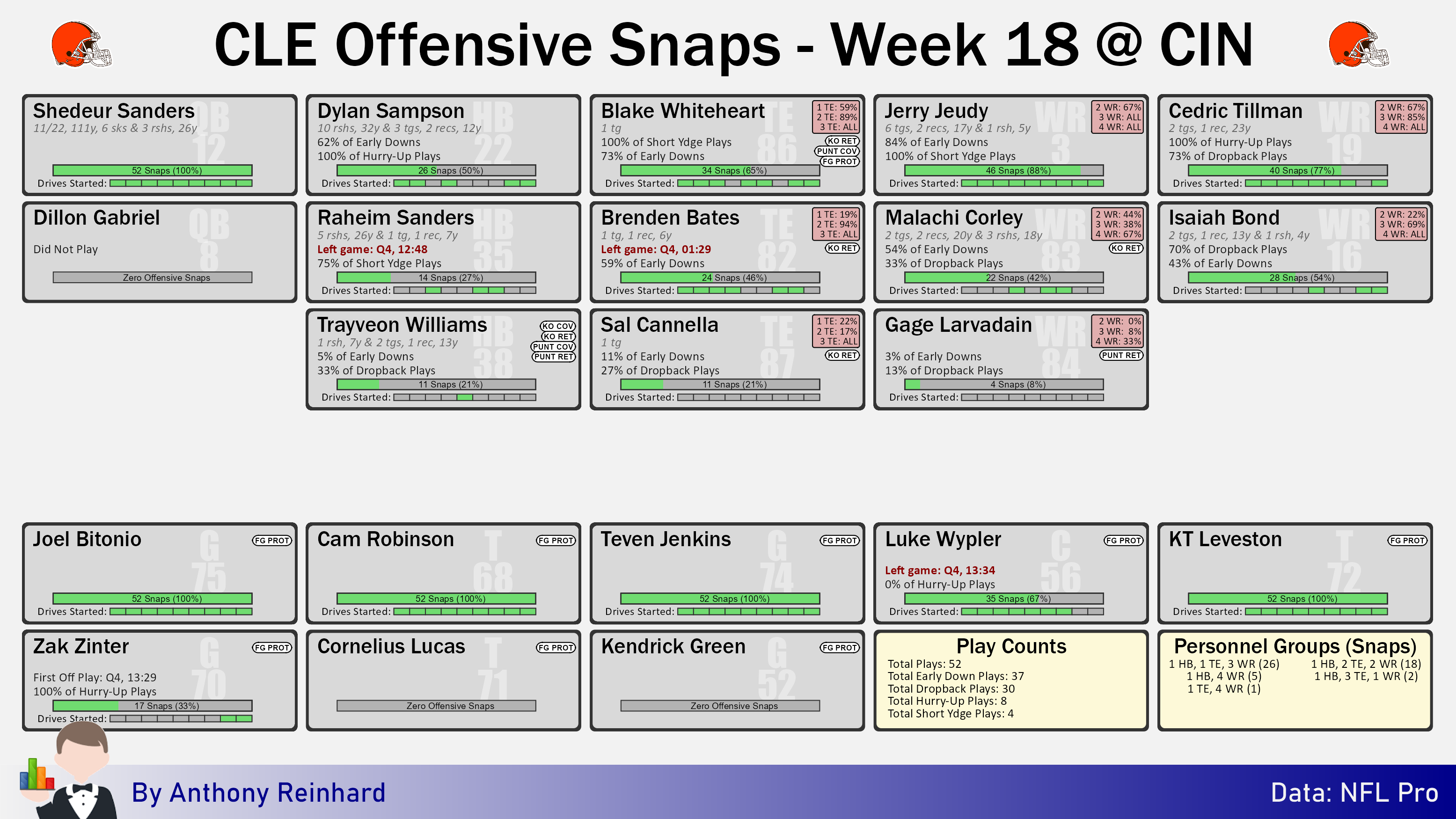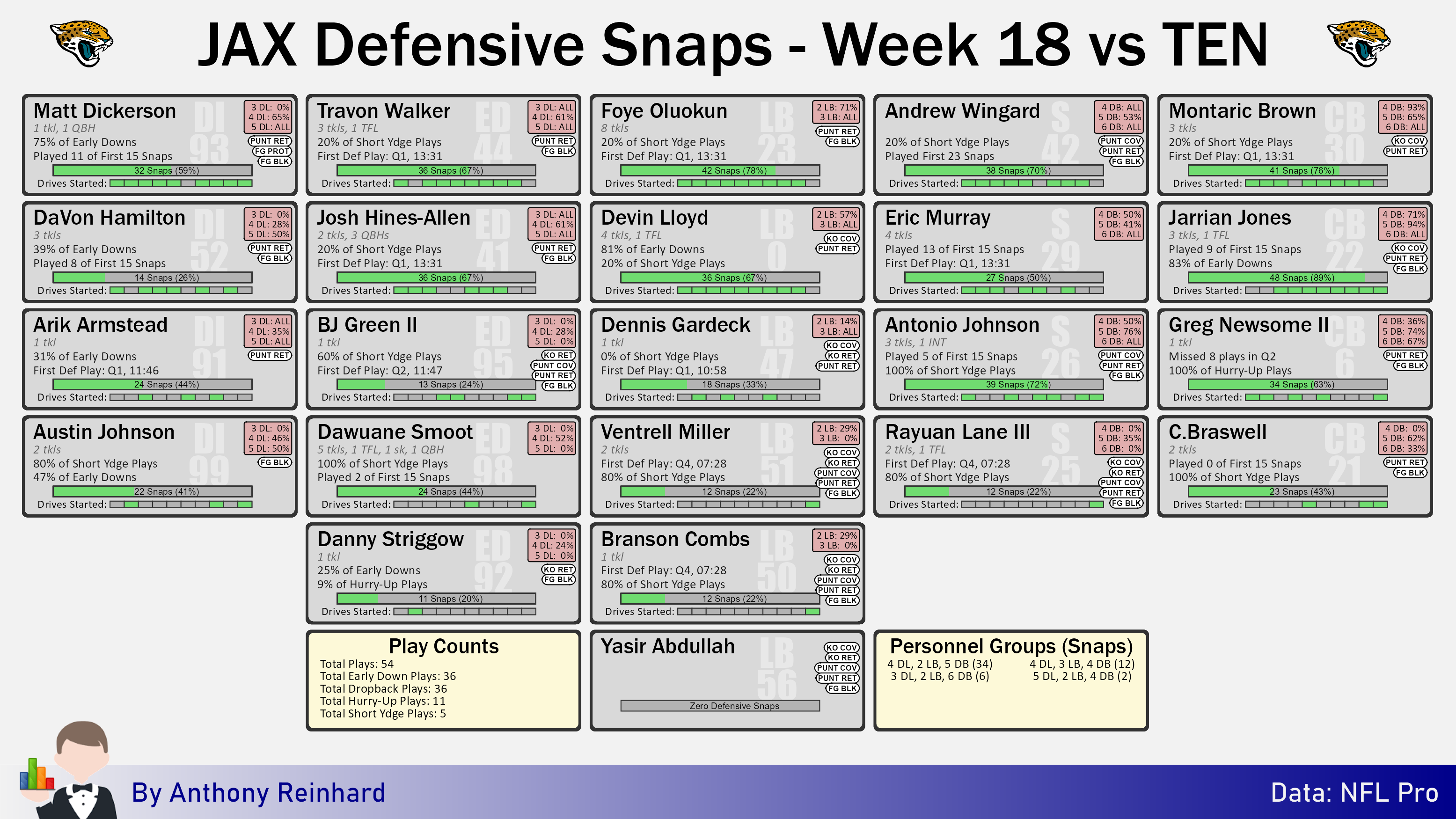 Snap Counts: Week 18Snap Count graphs for each team in Week 18Anthony ReinhardJan 05, 20261ShareCAR-TBSEA-SFNO-ATLCLE-CININD-HOUTEN-JAXGB-MINDAL-NYGNYJ-BUFDET-CHILAC-DENARI-LAKC-LVMIA-NEWAS-PHIBAL-PITSubscribePreviousNext